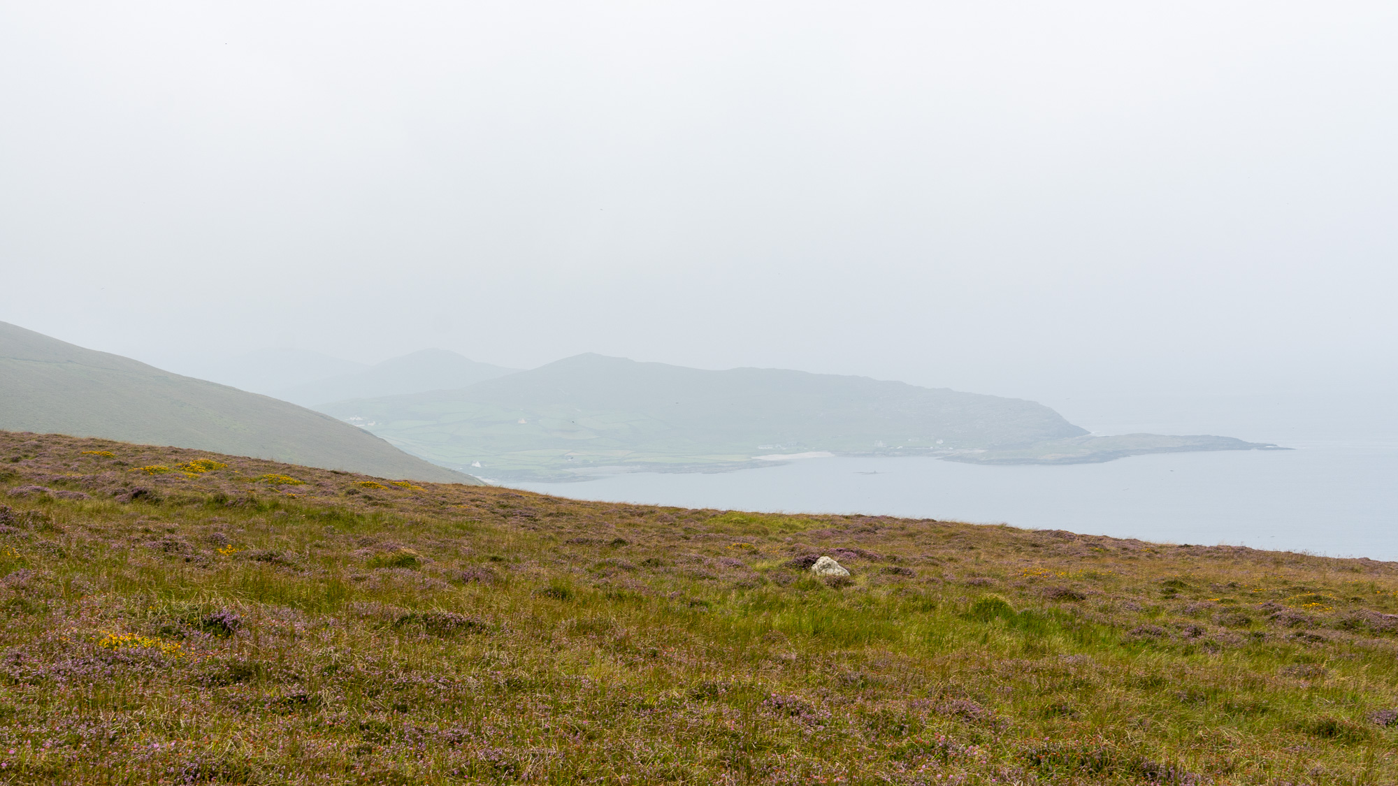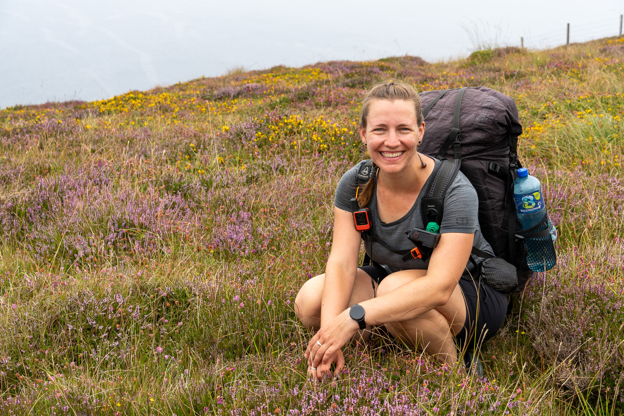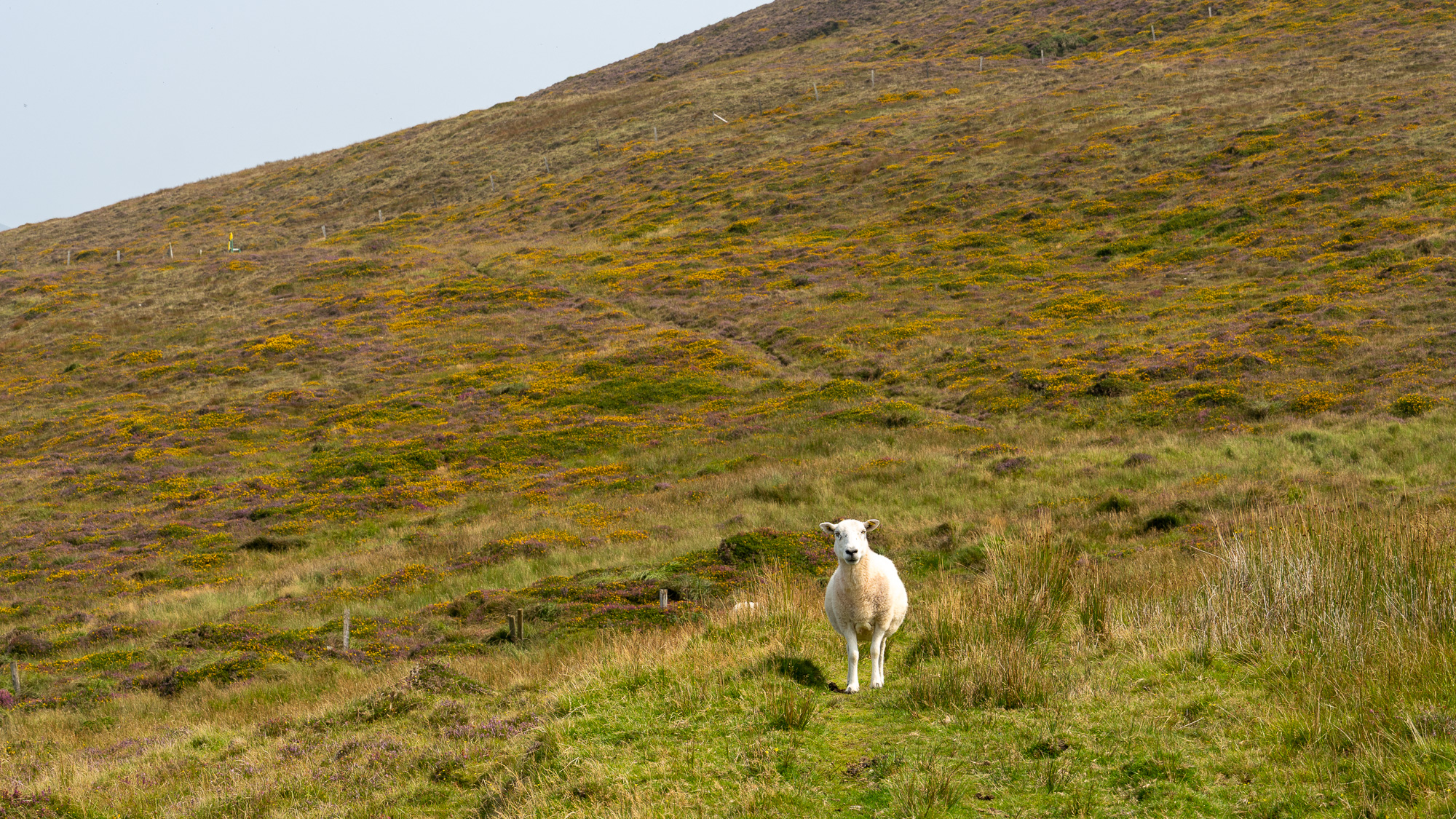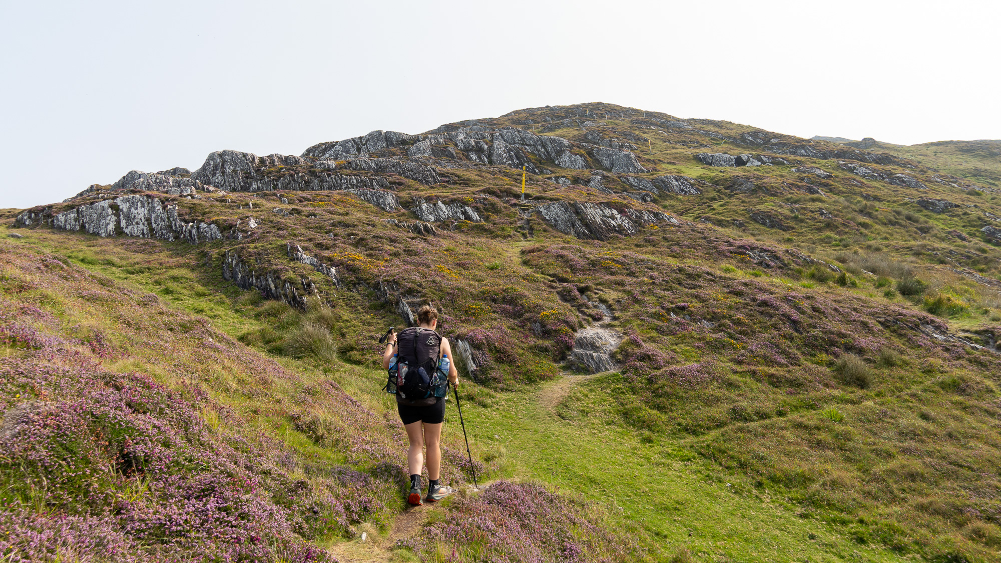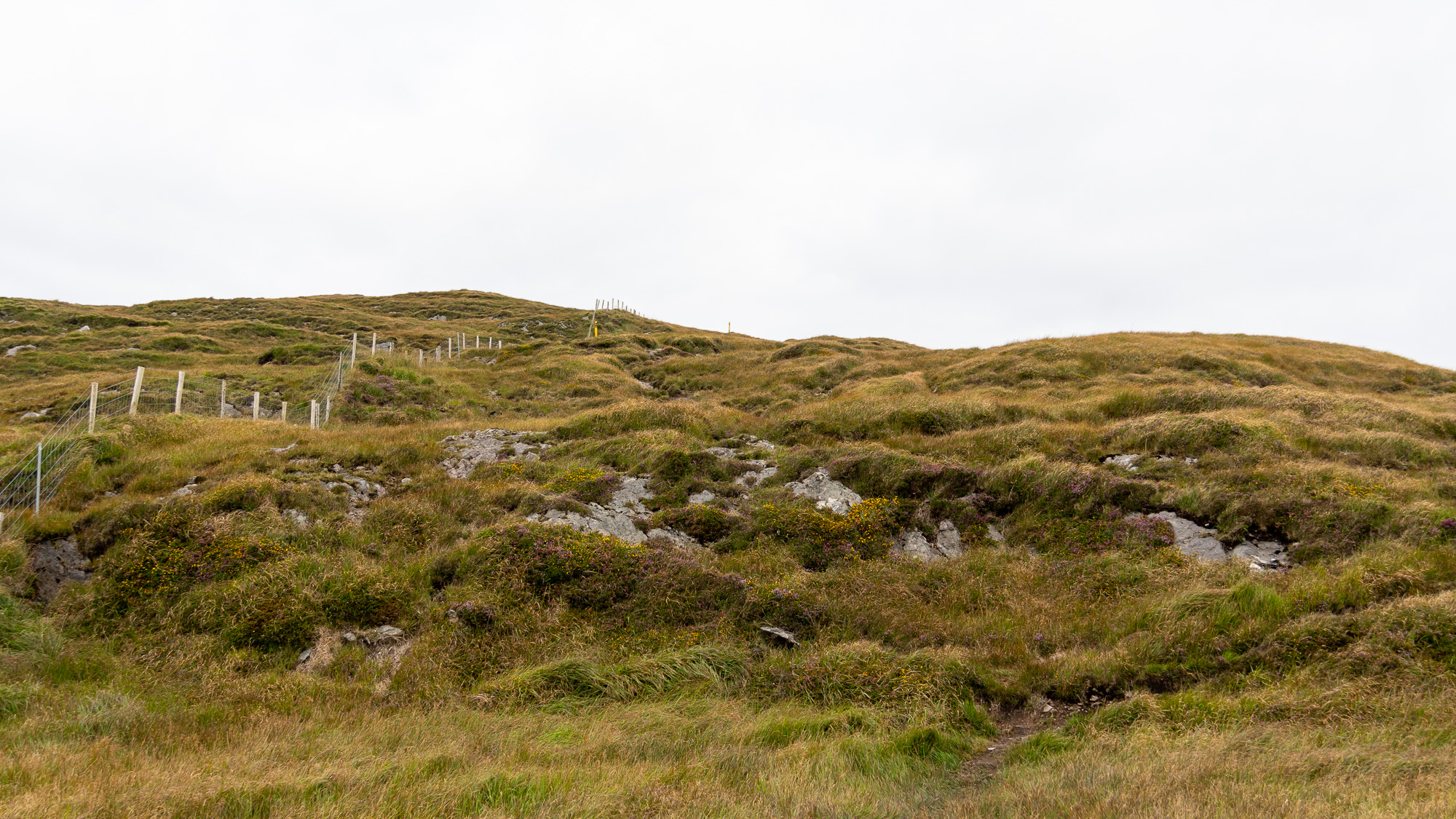 Der Berg ist mit jeder Menge Heidekraut bewachsen und sieht richtig schön aus. Oben angekommen gesellen sich noch gelbe Blumen dazu und gestalten mit dem zunehmend grauen Himmel eine tolle Farbpalette.