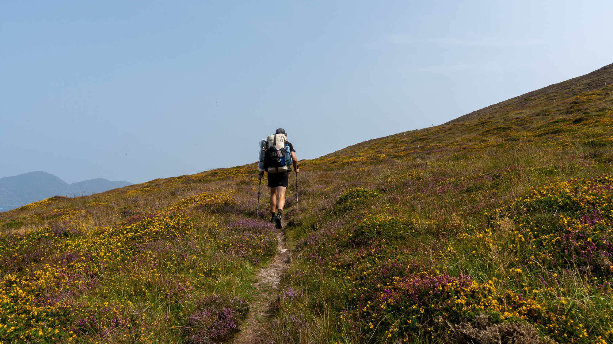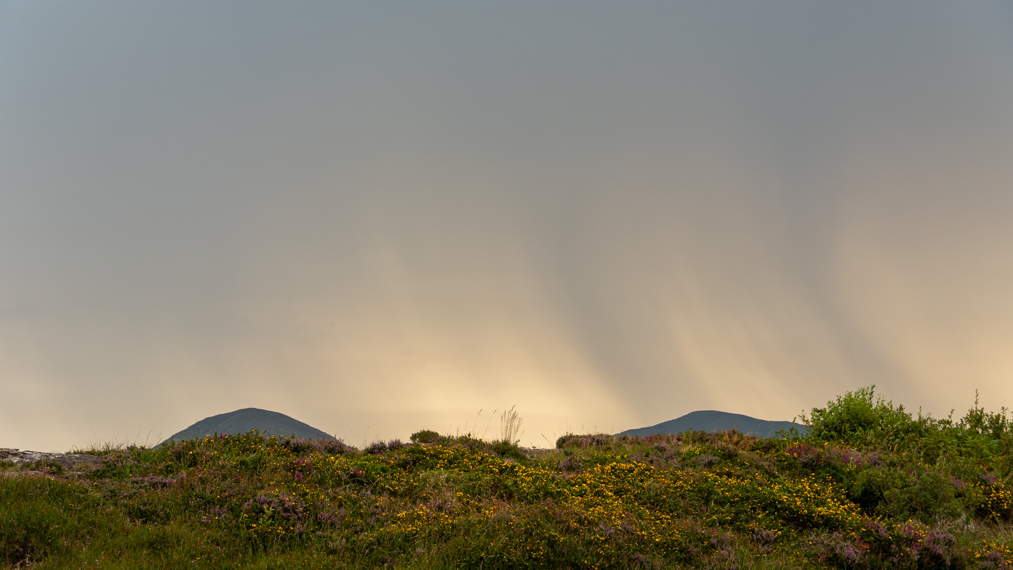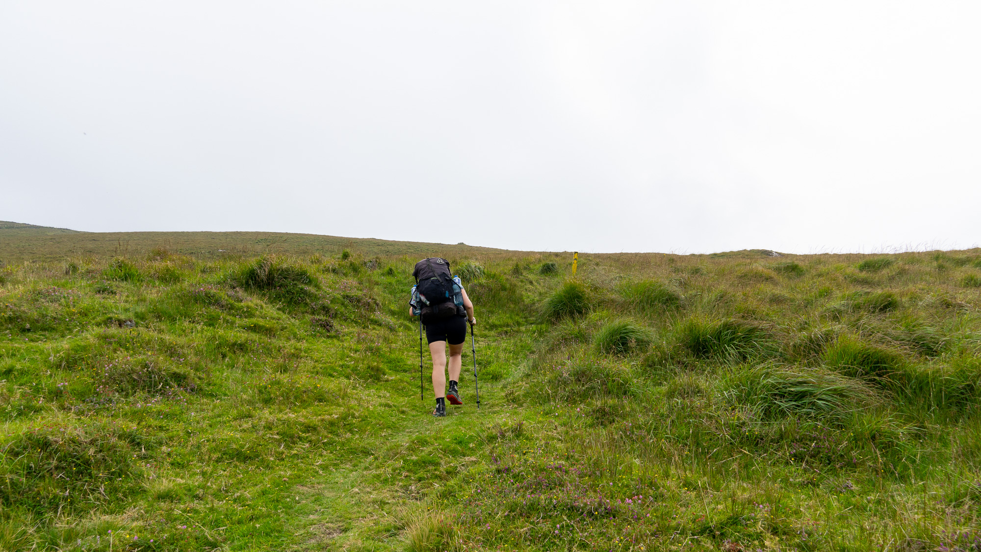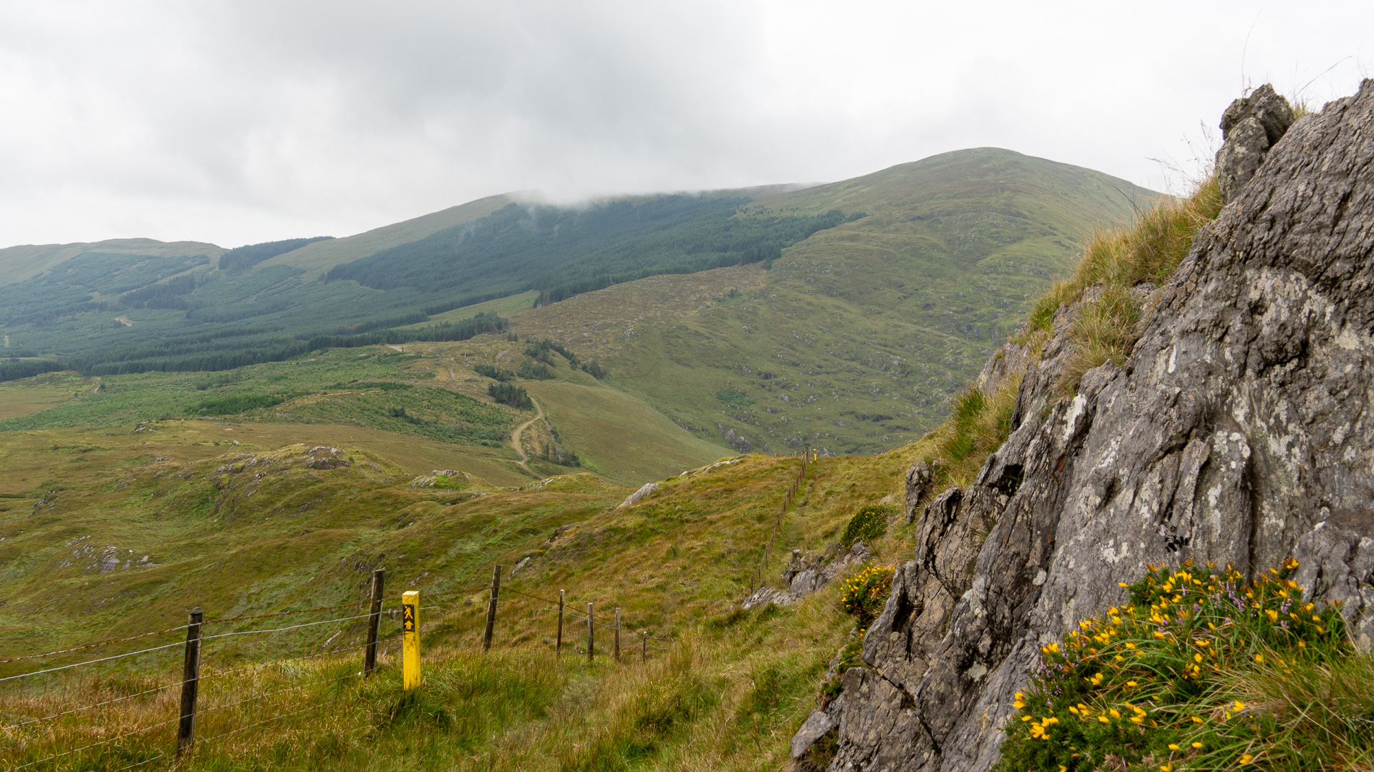 Der Berg ist mit jeder Menge Heidekraut bewachsen und sieht richtig schön aus. Oben angekommen gesellen sich noch gelbe Blumen dazu und gestalten mit dem zunehmend grauen Himmel eine tolle Farbpalette.