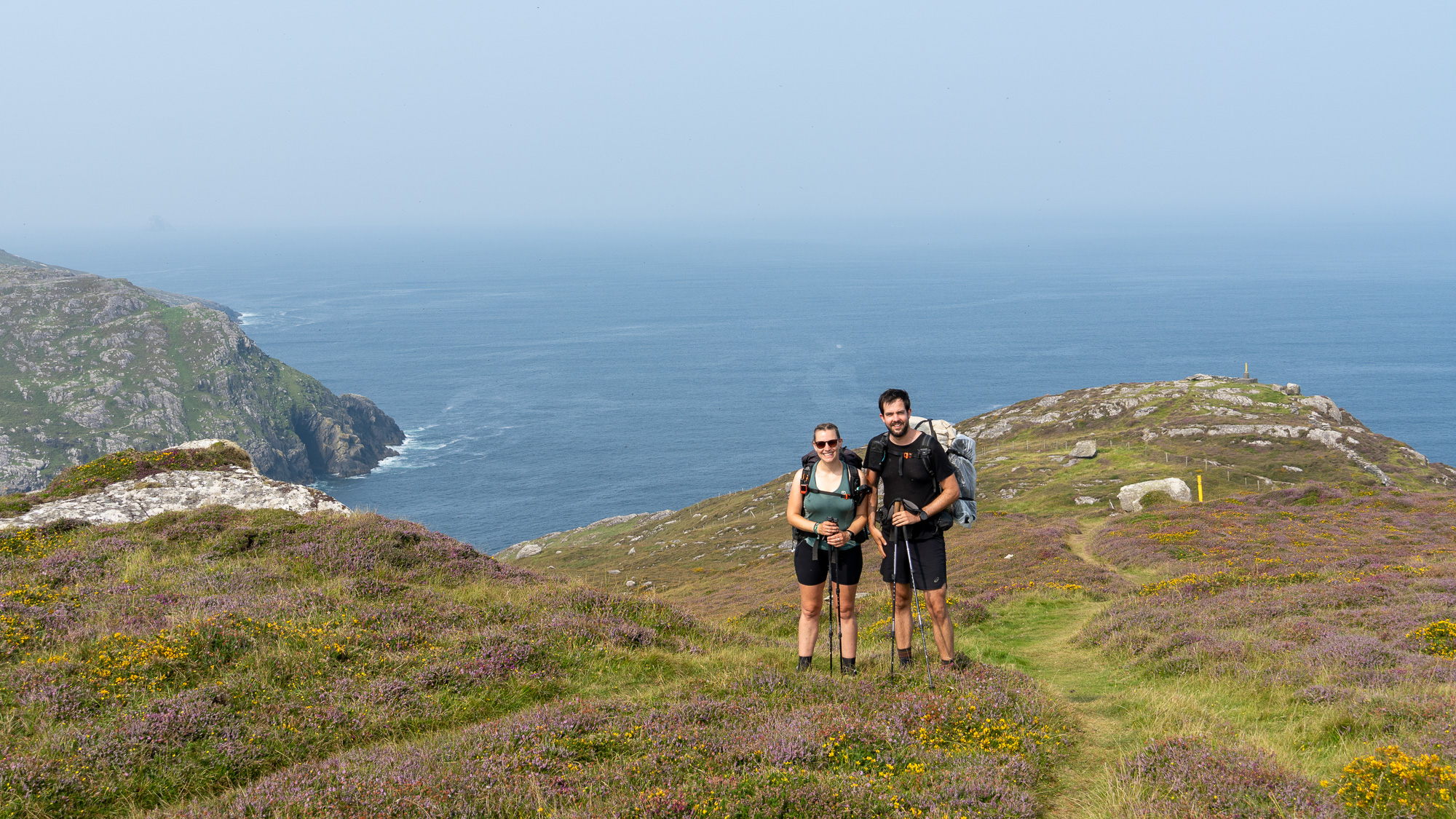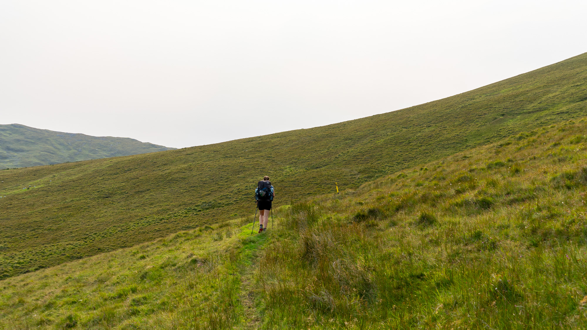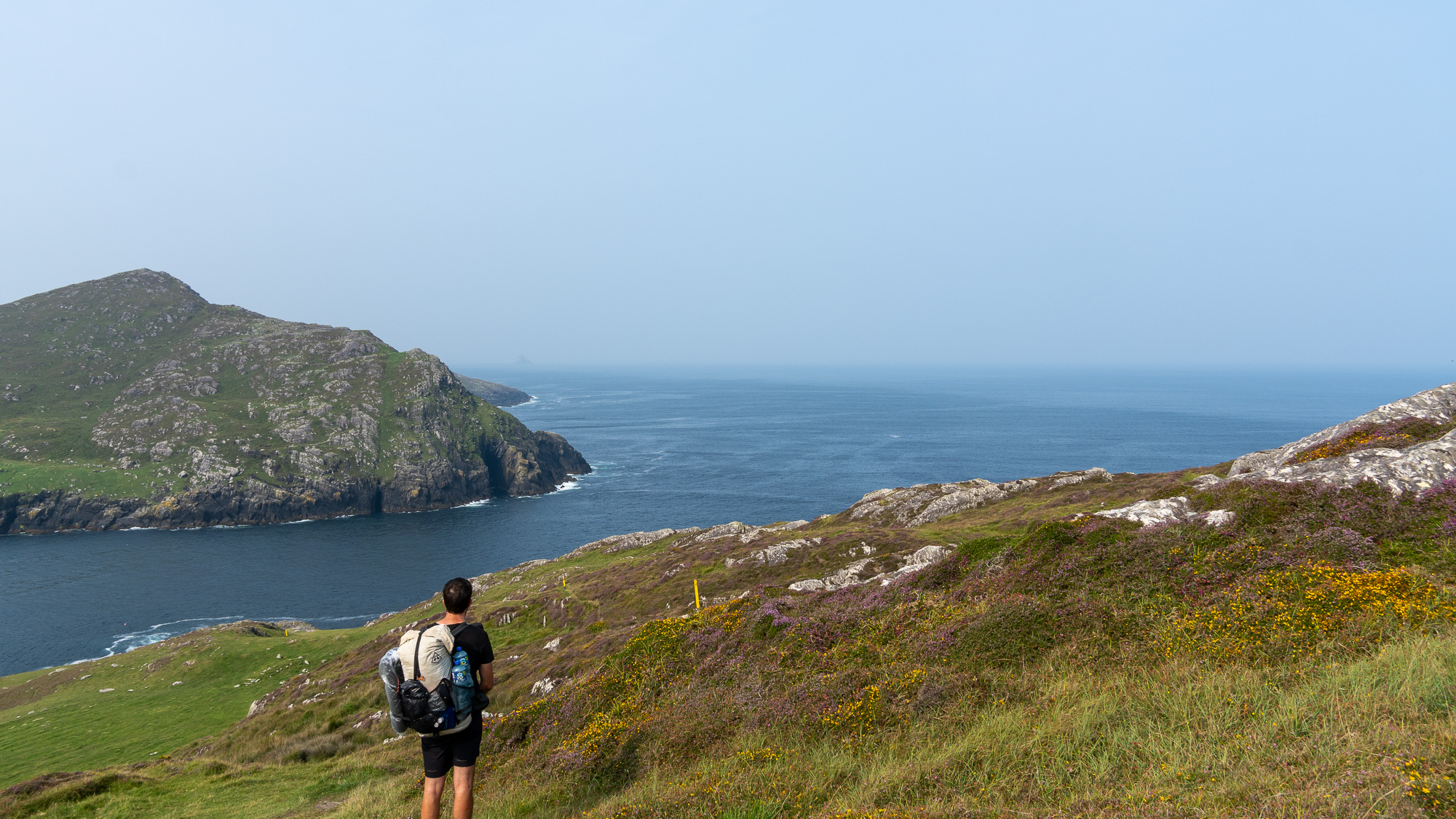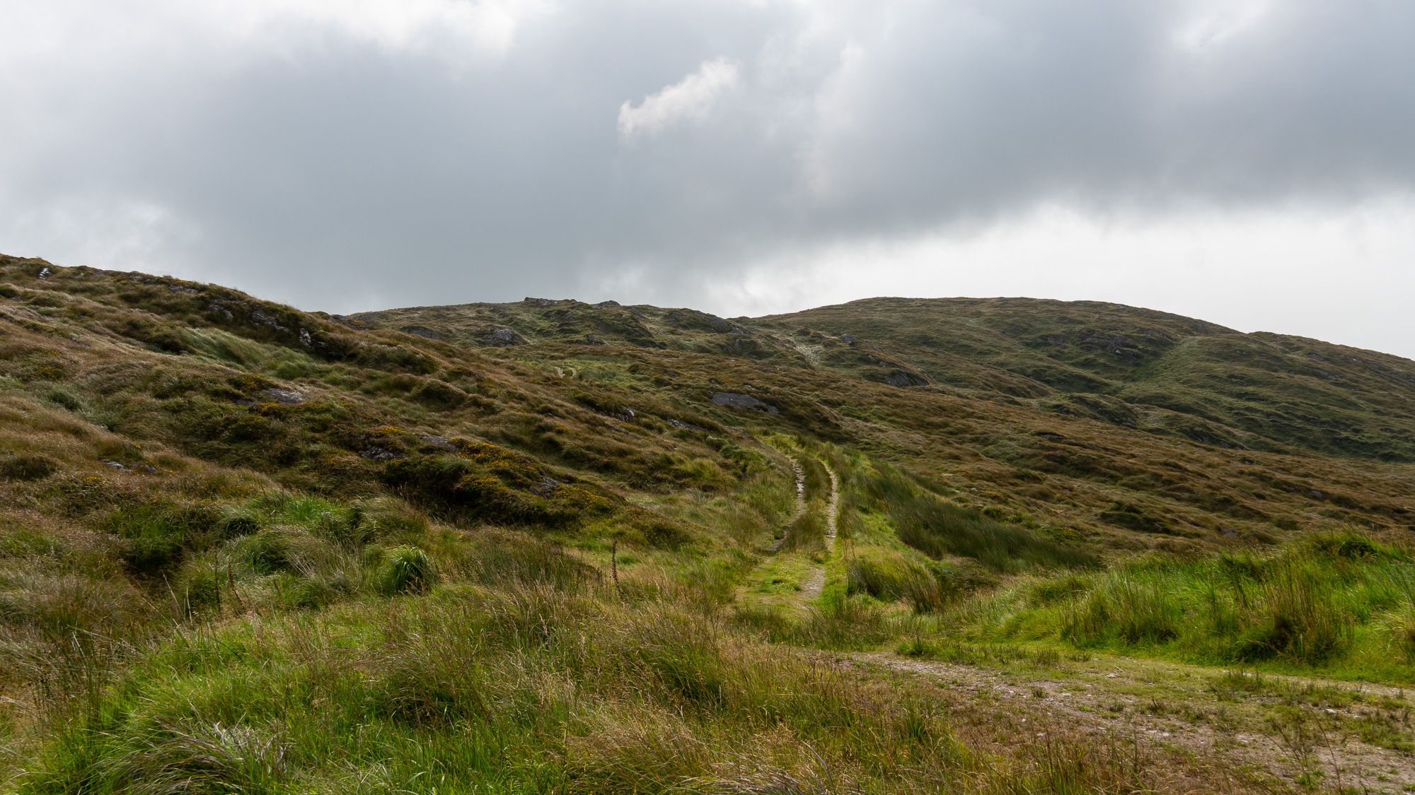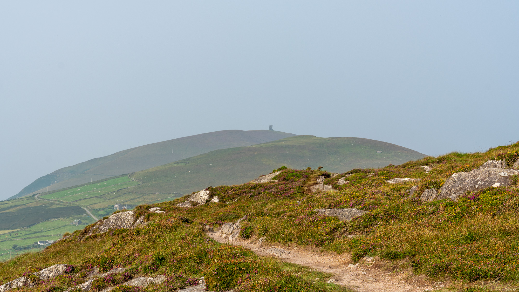 Der Berg ist mit jeder Menge Heidekraut bewachsen und sieht richtig schön aus. Oben angekommen gesellen sich noch gelbe Blumen dazu und gestalten mit dem zunehmend grauen Himmel eine tolle Farbpalette.