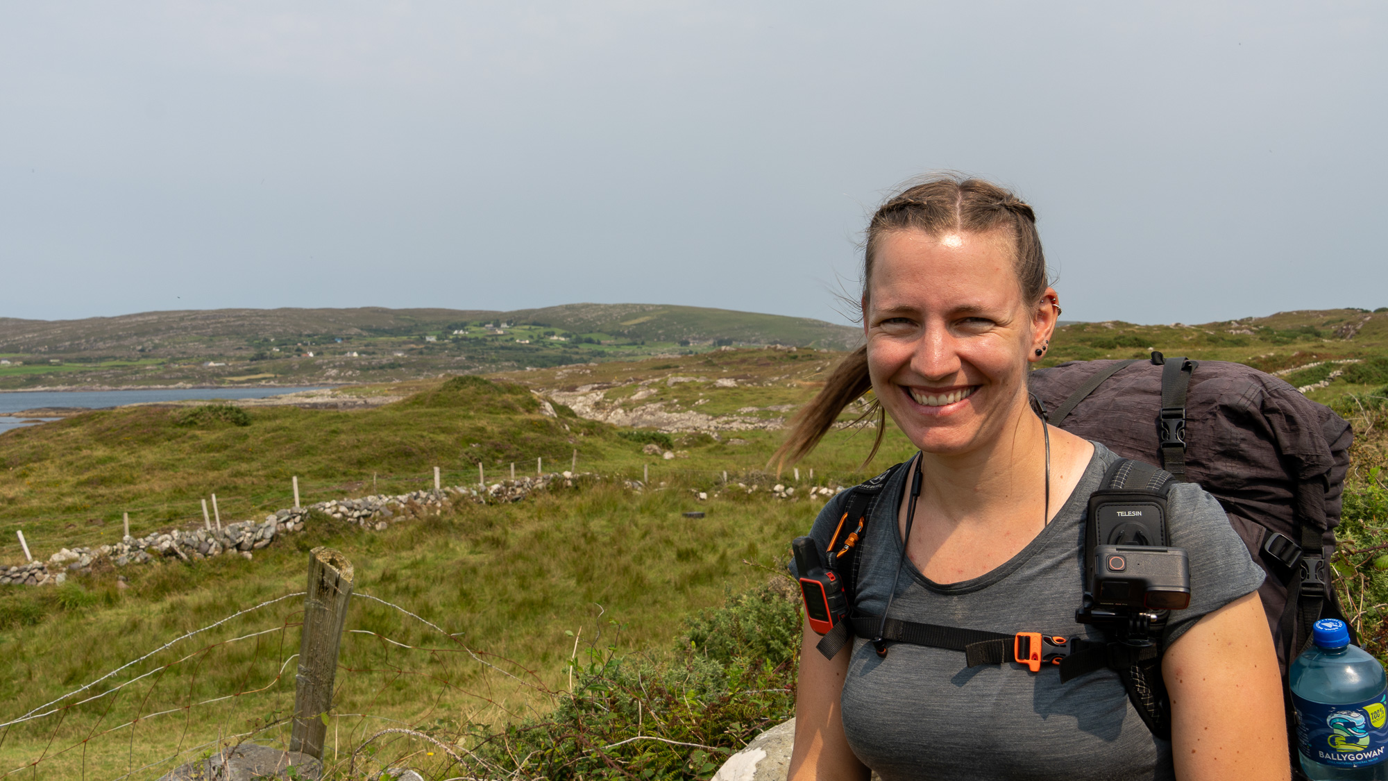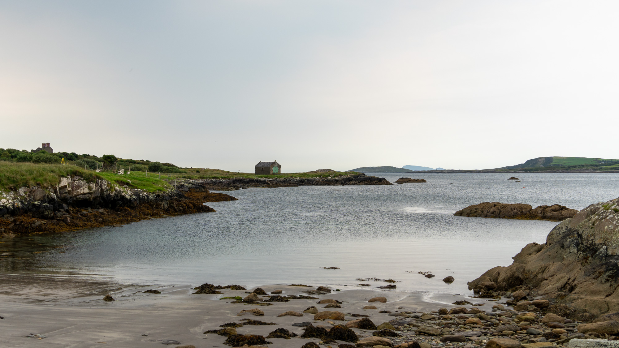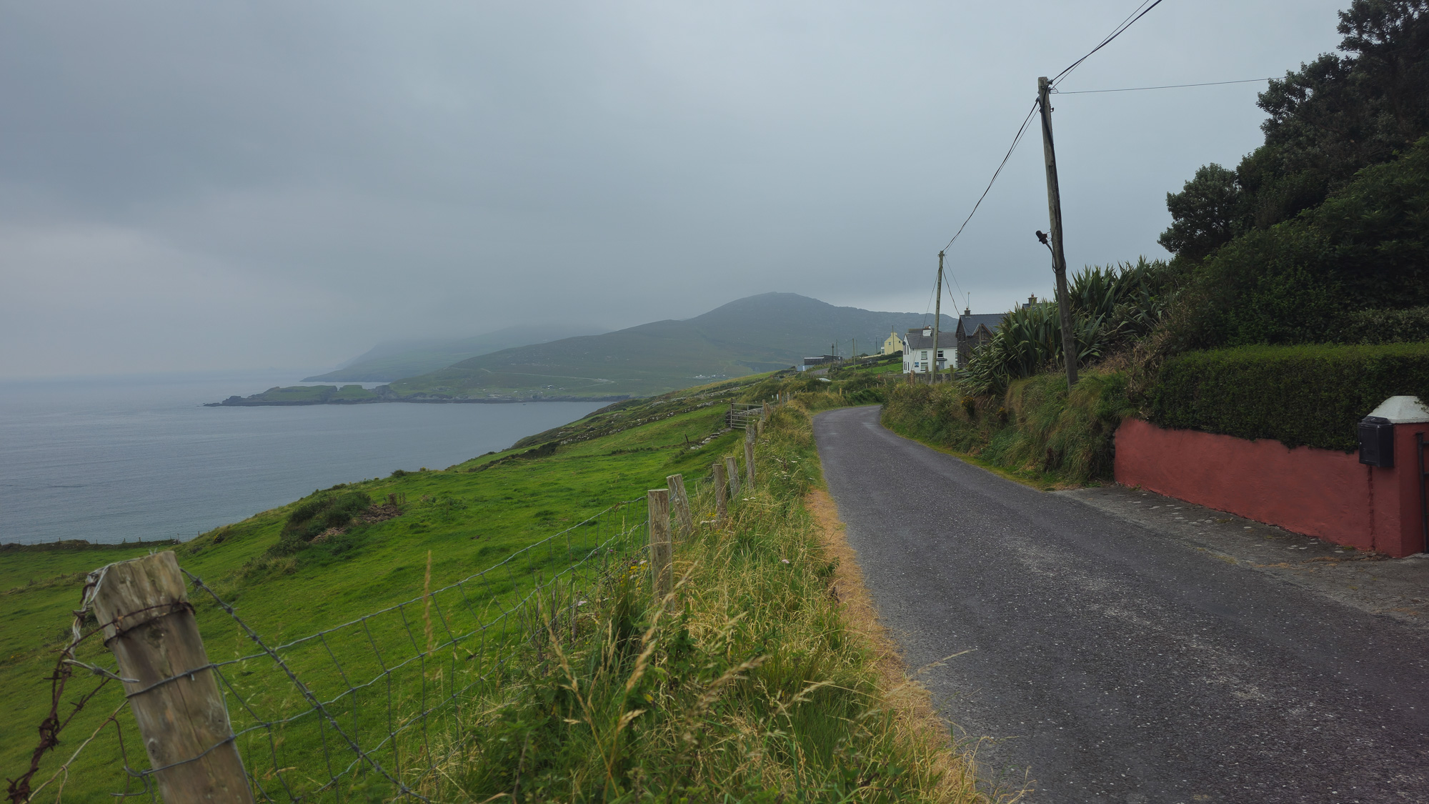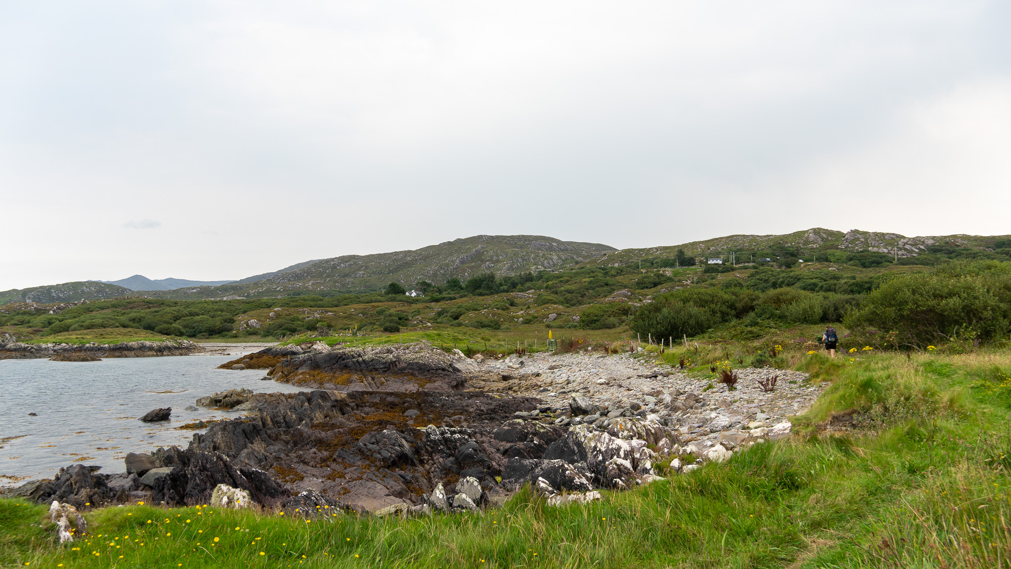 Da inzwischen die Sonne scheint, cremen wir uns noch ein. Auf so warmes Wetter hatten wir uns heute gar nicht eingestellt. Auf der nächsten Leiter sehen wir allerdings, dass wir uns die Sonnencreme hätten sparen können. Es ziehen ziemlich dunkle Wolken auf. Hoffentlich wartet der Regen noch, bis wir einen Zeltplatz gefunden haben. Allerdings liegen zwischen dem Wunsch und dem möglichen Ziel noch einige Kilometer. Doch mehr als ein paar Tropfen fallen bei uns nicht. Nachdem wir den Hafen von Eyeries einmal umrundet haben, gehen wir auf der Straße weiter. Mehr als ein paar vereinzelte Häuser stehen hier nicht und dementsprechend sind kaum Autos unterwegs. Stattdessen kommen uns mehrere Rennradfahrer:innen entgegen. Zu Fuß ist uns heute noch niemand begegnet.