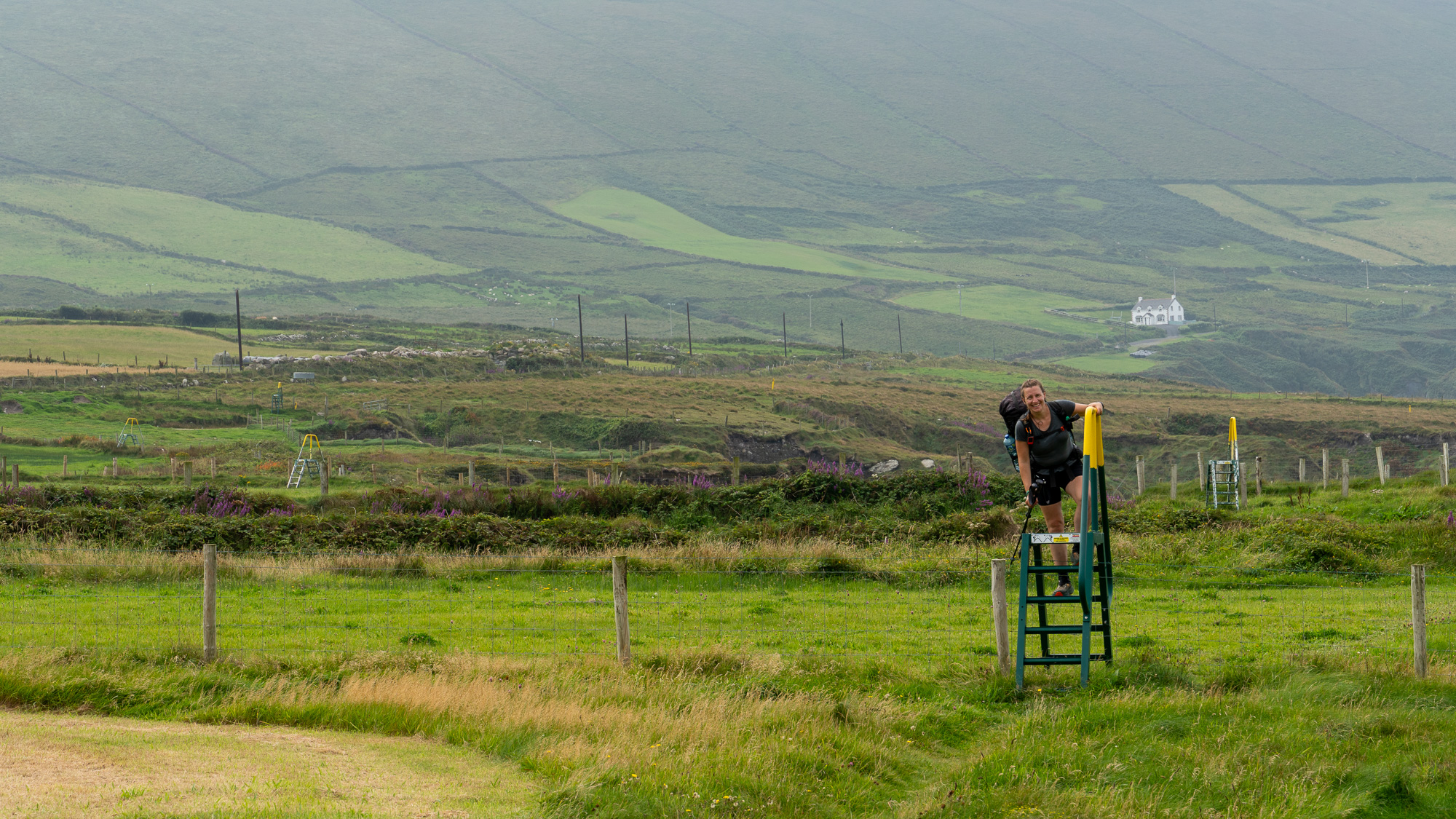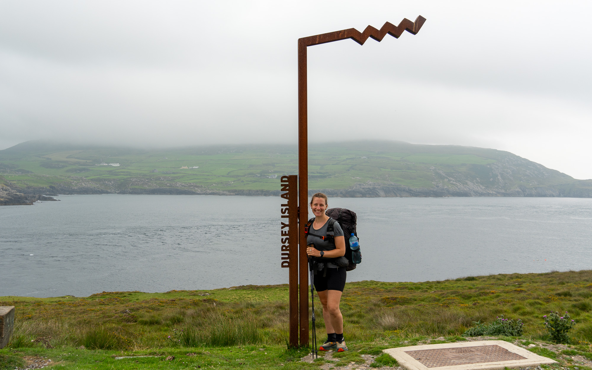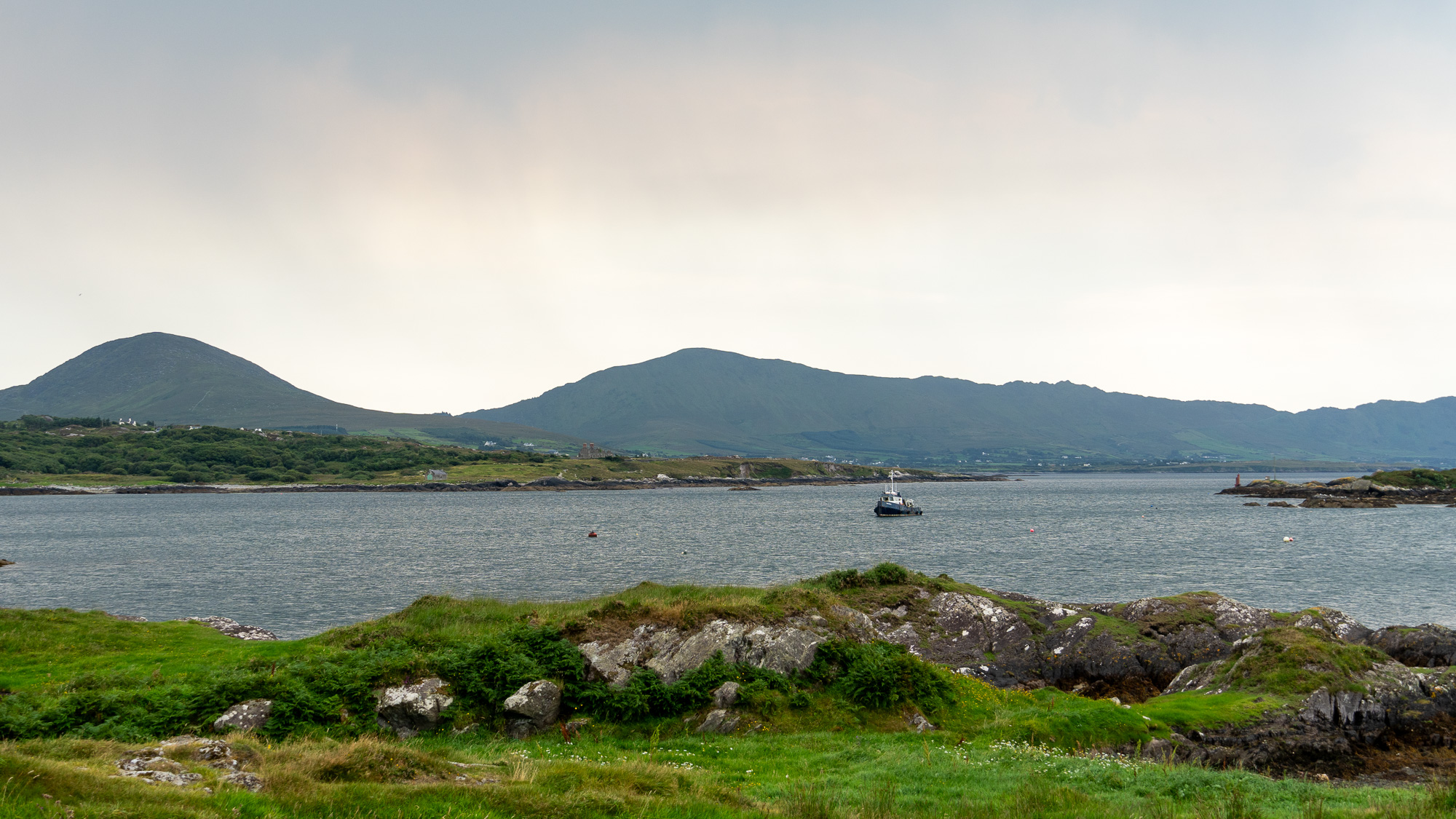 Da inzwischen die Sonne scheint, cremen wir uns noch ein. Auf so warmes Wetter hatten wir uns heute gar nicht eingestellt. Auf der nächsten Leiter sehen wir allerdings, dass wir uns die Sonnencreme hätten sparen können. Es ziehen ziemlich dunkle Wolken auf. Hoffentlich wartet der Regen noch, bis wir einen Zeltplatz gefunden haben. Allerdings liegen zwischen dem Wunsch und dem möglichen Ziel noch einige Kilometer. Doch mehr als ein paar Tropfen fallen bei uns nicht. Nachdem wir den Hafen von Eyeries einmal umrundet haben, gehen wir auf der Straße weiter. Mehr als ein paar vereinzelte Häuser stehen hier nicht und dementsprechend sind kaum Autos unterwegs. Stattdessen kommen uns mehrere Rennradfahrer:innen entgegen. Zu Fuß ist uns heute noch niemand begegnet.