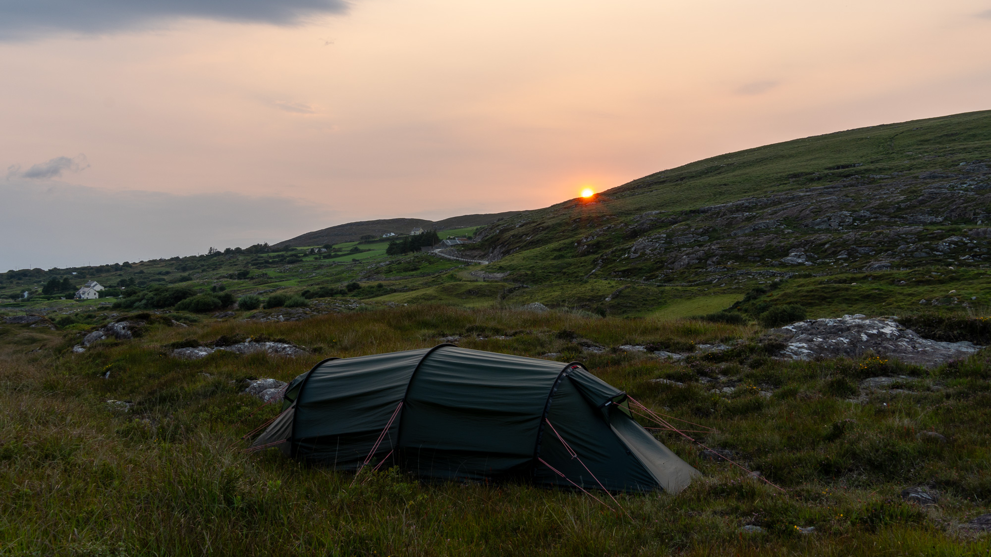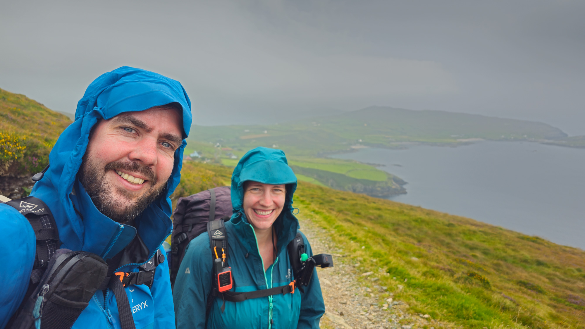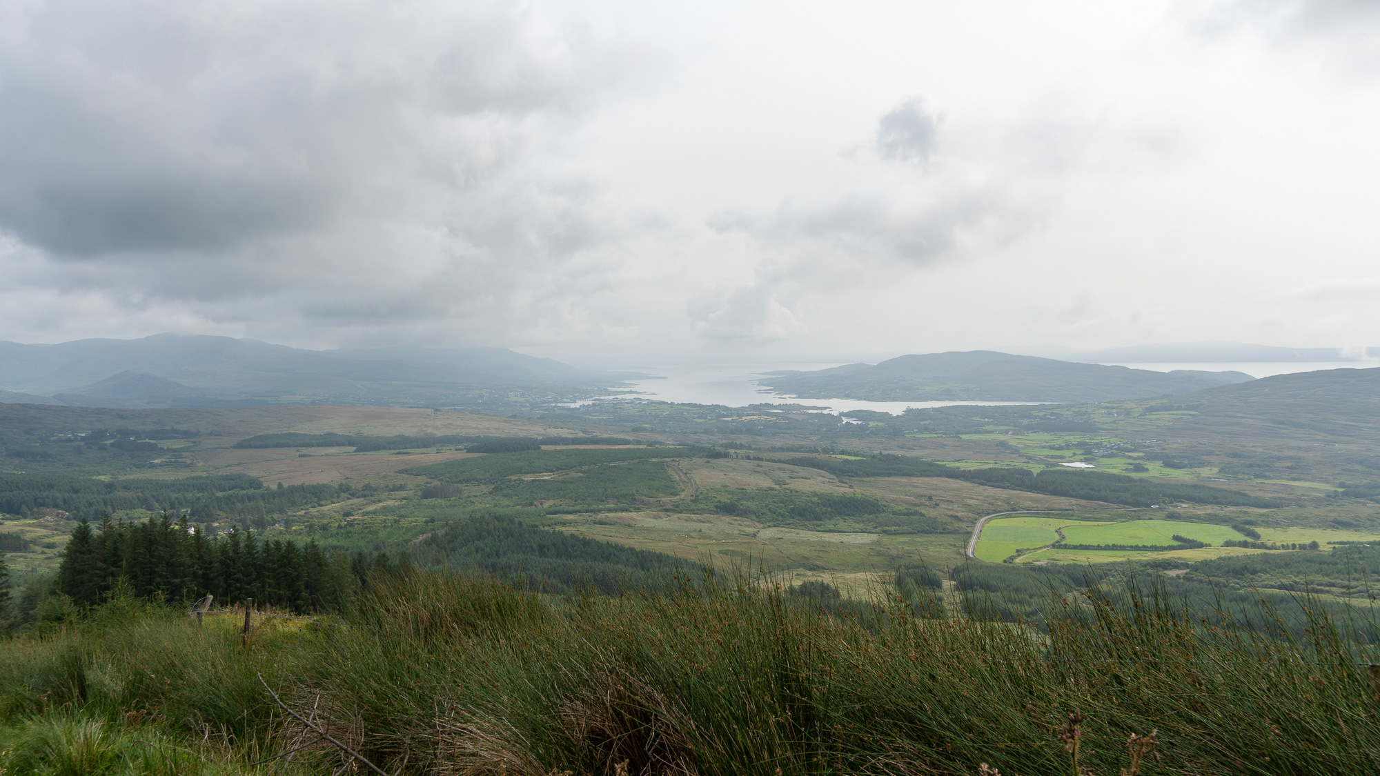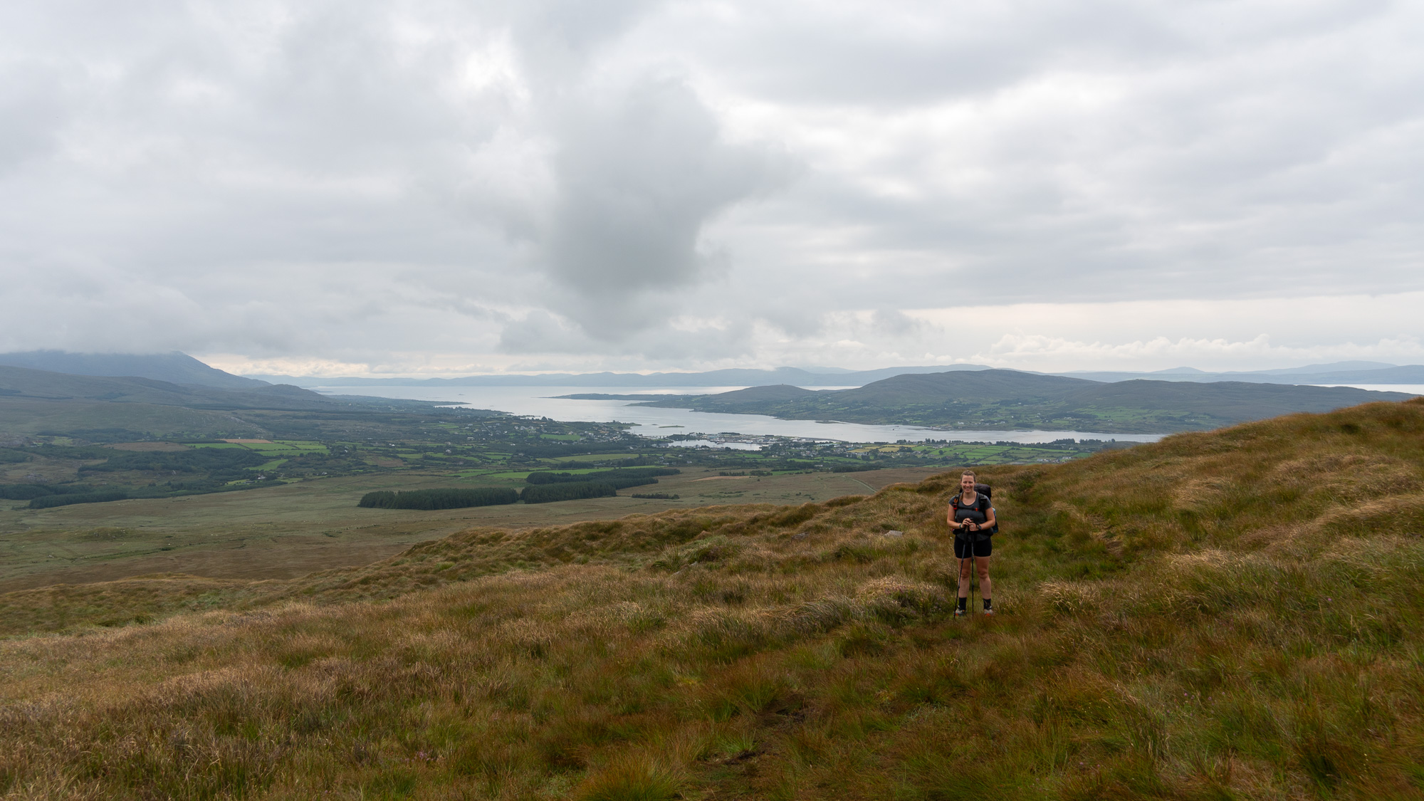 Da inzwischen die Sonne scheint, cremen wir uns noch ein. Auf so warmes Wetter hatten wir uns heute gar nicht eingestellt. Auf der nächsten Leiter sehen wir allerdings, dass wir uns die Sonnencreme hätten sparen können. Es ziehen ziemlich dunkle Wolken auf. Hoffentlich wartet der Regen noch, bis wir einen Zeltplatz gefunden haben. Allerdings liegen zwischen dem Wunsch und dem möglichen Ziel noch einige Kilometer. Doch mehr als ein paar Tropfen fallen bei uns nicht. Nachdem wir den Hafen von Eyeries einmal umrundet haben, gehen wir auf der Straße weiter. Mehr als ein paar vereinzelte Häuser stehen hier nicht und dementsprechend sind kaum Autos unterwegs. Stattdessen kommen uns mehrere Rennradfahrer:innen entgegen. Zu Fuß ist uns heute noch niemand begegnet.