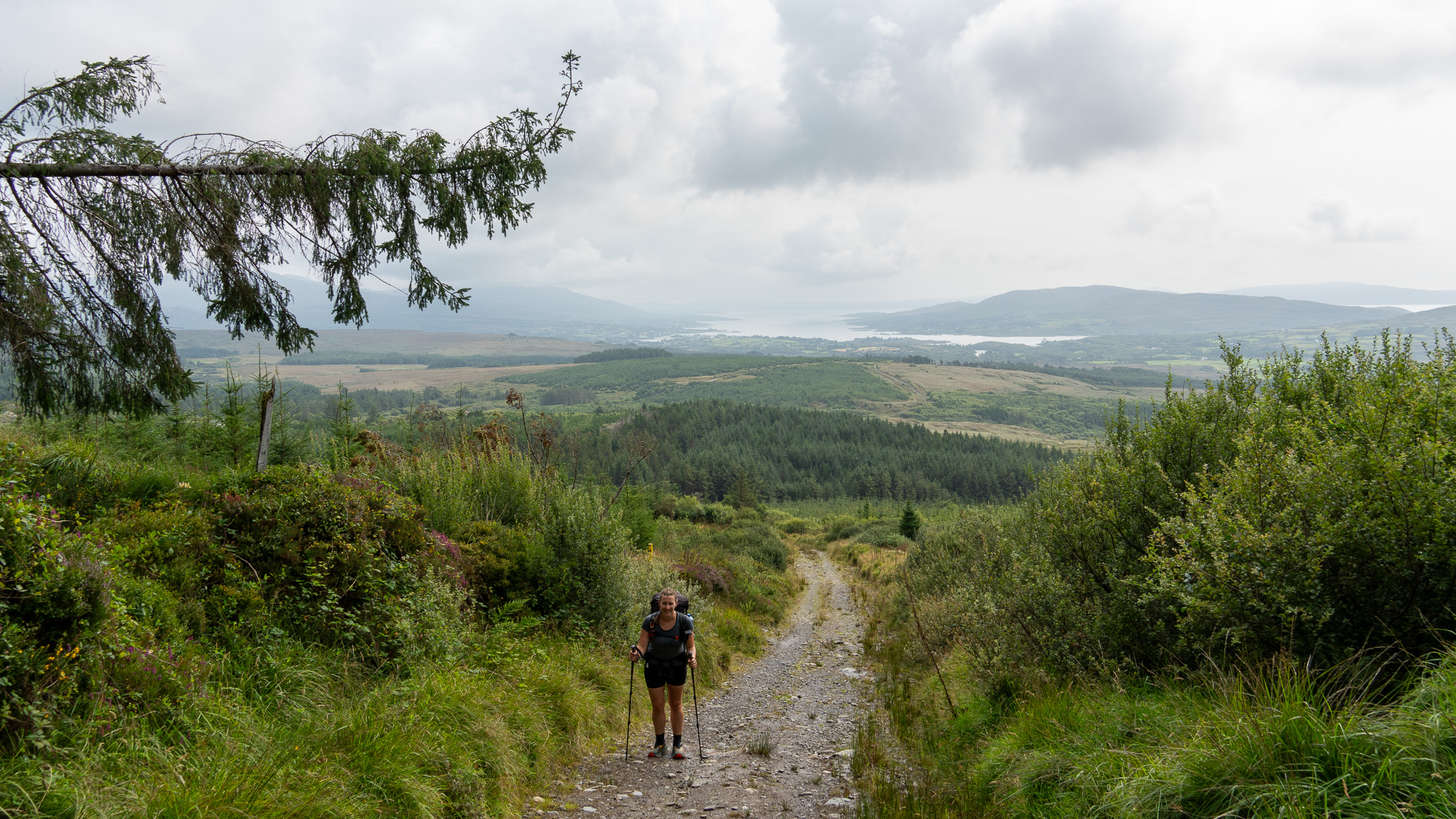 Der Untergrund ist nass und immer wieder äußerst matschig, vermutlich durch die vielen Hufe. So kommen wir wieder in den Genuss nasser Füße. Wir gehen bergab, dann bergauf und können bald auf Eyeries blicken.