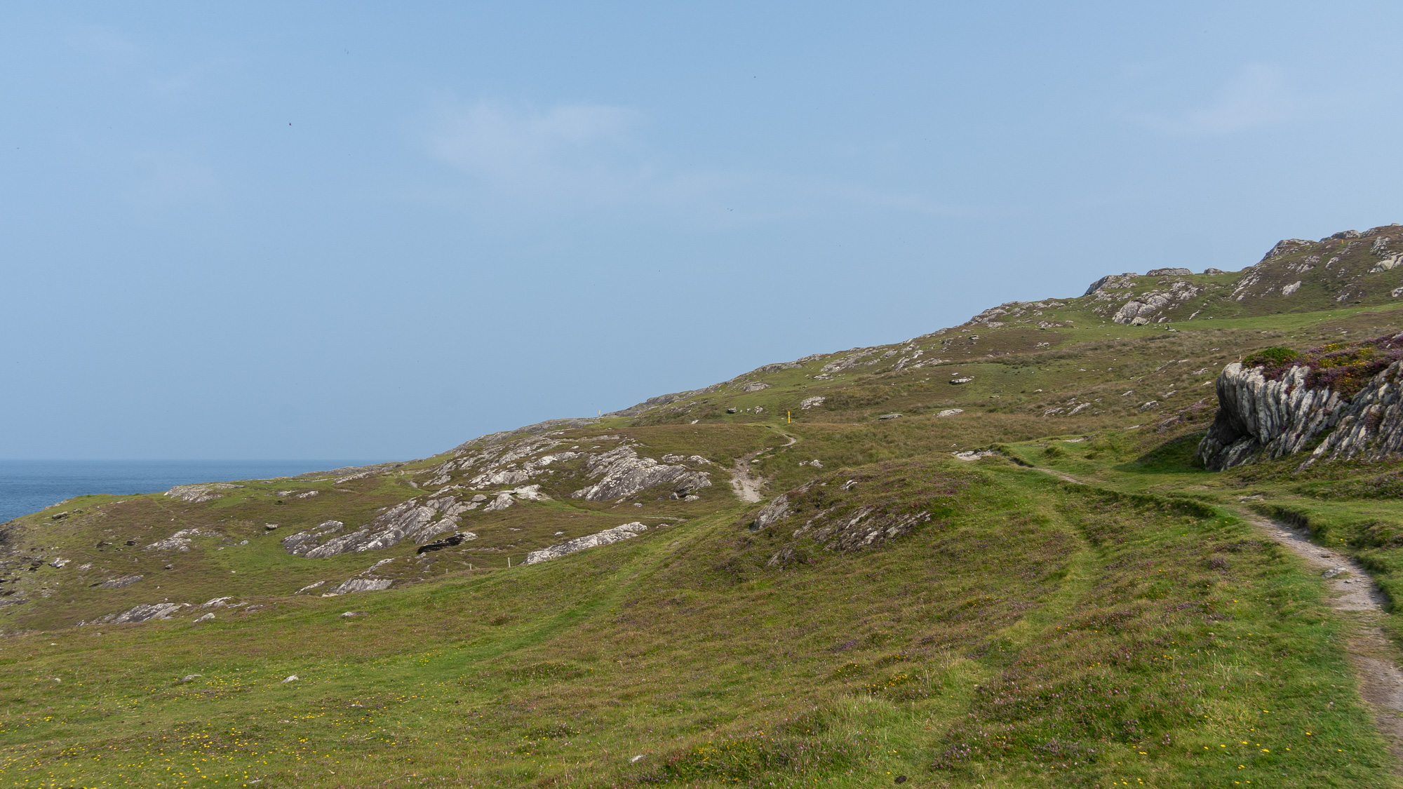 Wir folgen dem Weg nun gemächlich bergab und müssen uns dann für eine Abzweigung entscheiden. Geht es Richtung Allihies oder Eyeries weiter? Unser Ziel ist keins von beiden, zumindest nicht heute. Doch erstmal folgen wir den Wegweisen nach Allihies. Dann biegen wir aber ab. Wir wollen nach Dursey Island. Wie auch Bere Island ist Dursey Island Teil des Beara Way. Doch ausgeschildert ist der Weg dorthin zunächst nicht. Gestern war das auch schon so. Uns irritiert das etwas, da der Weg ansonsten wirklich sehr akkurat markiert ist. Wir folgen also unserer Route und irgendwann tauchen wieder offizielle Markierungen auf, als wäre nichts gewesen. Seltsam.