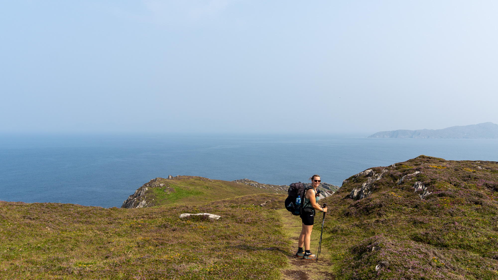 Trotz Wind ist es sehr warm. Die dünnen Jacken, die wir zum Start angezogen hatten, wandern schnell in unsere Rucksäcke. Für ein Stück geht es noch auf der Copperroad entlang, dann wechseln wir ins Gelände. Der Wanderweg scheint hier ausschließlich Tier-, also Schafspfaden, zu folgen.