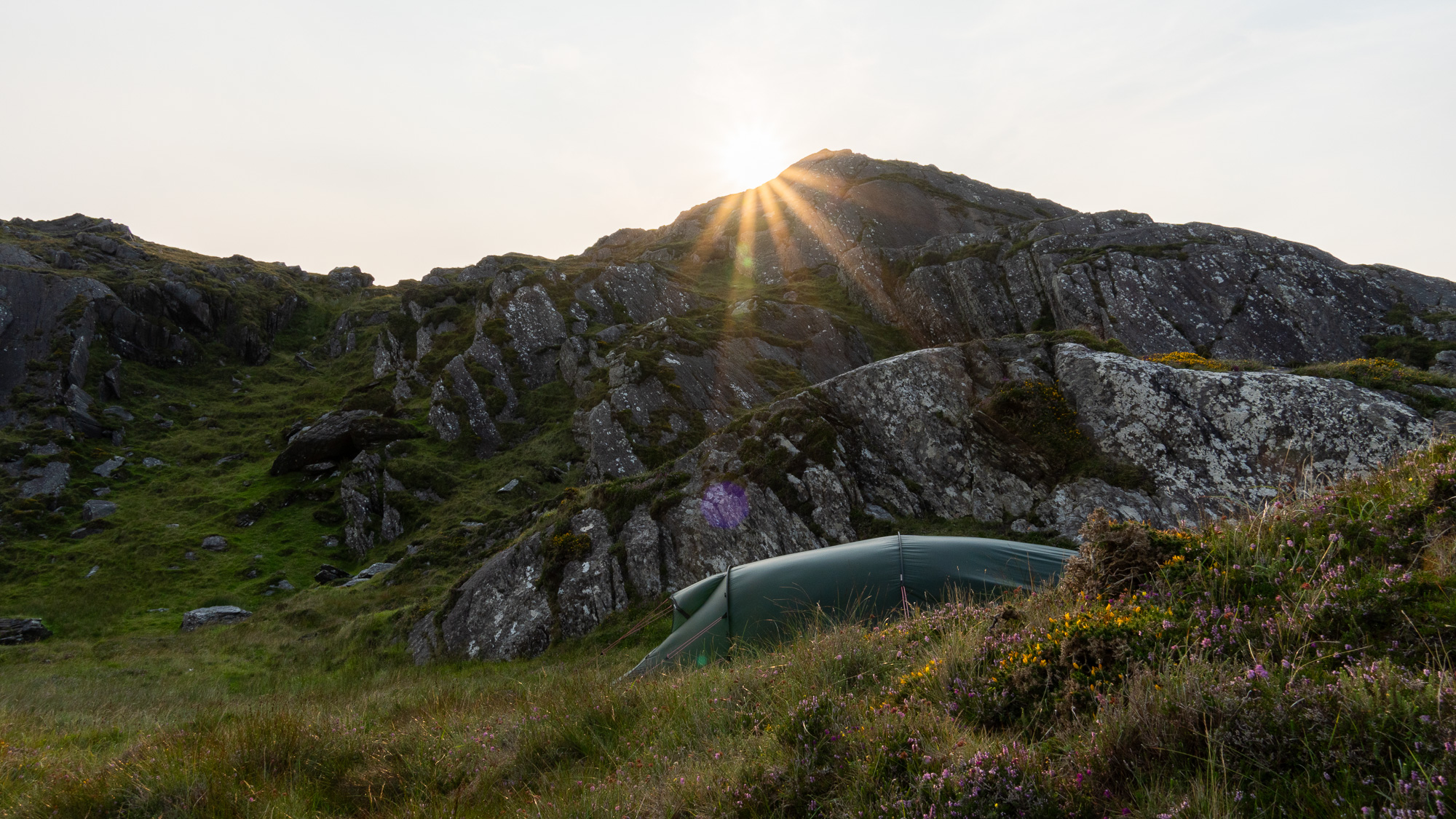 Inzwischen zucken Blitze und auch der Donner treibt uns zur Eile. Doch das Gewitter bleibt auf sicherem Abstand. Das Zelt ist zügig aufgebaut, der Standort ist im Hinblick auf das Wetter in Ordnung.