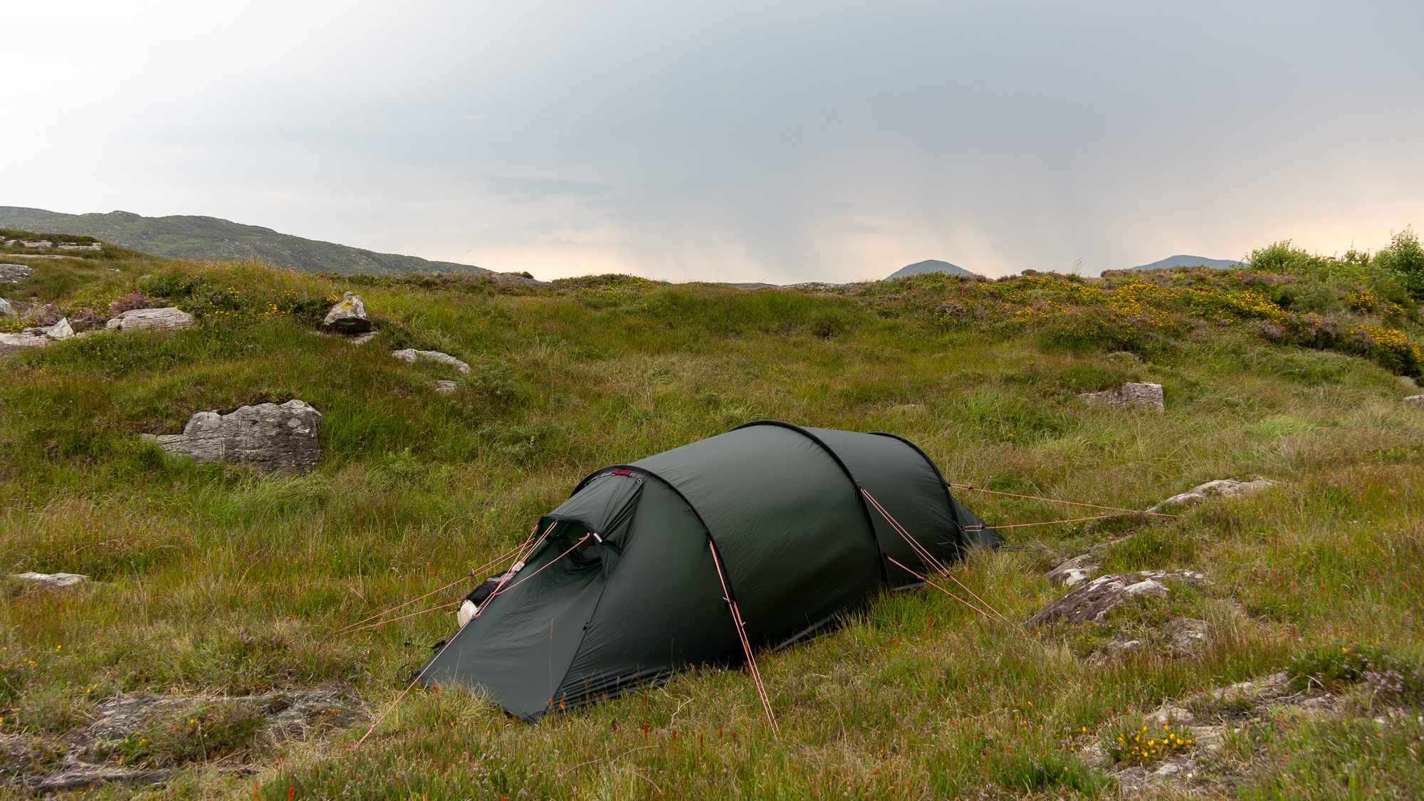 Noch ist sie in den Bergen, in denen wir heute Morgen unterwegs waren. Aber kommt sie rüber oder zieht sie vorbei? Allzu weit gehen wollen wir heute nicht mehr und bedingt durch den Wind wollen wir ohnehin eine geschütztere Zeltstelle als gestern finden. Mit dem Gewitter vor der Nase fängt unsere Suche nun direkt an. 500 Meter weiter werden wir fündig.
