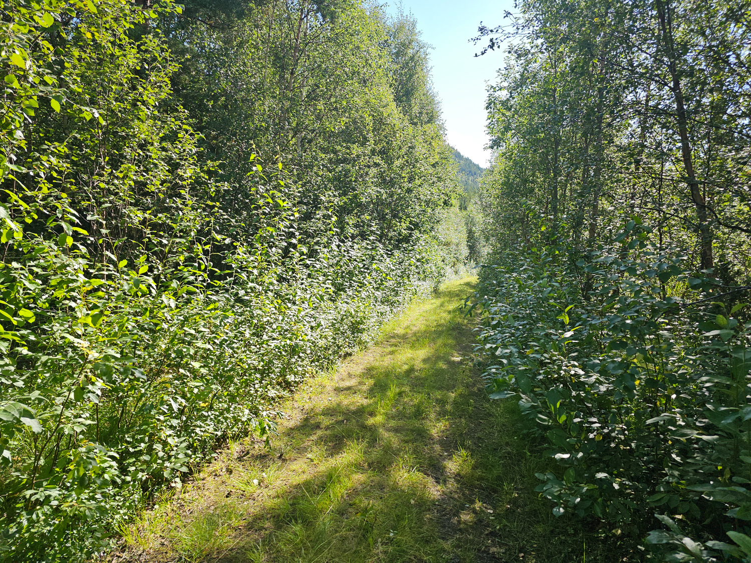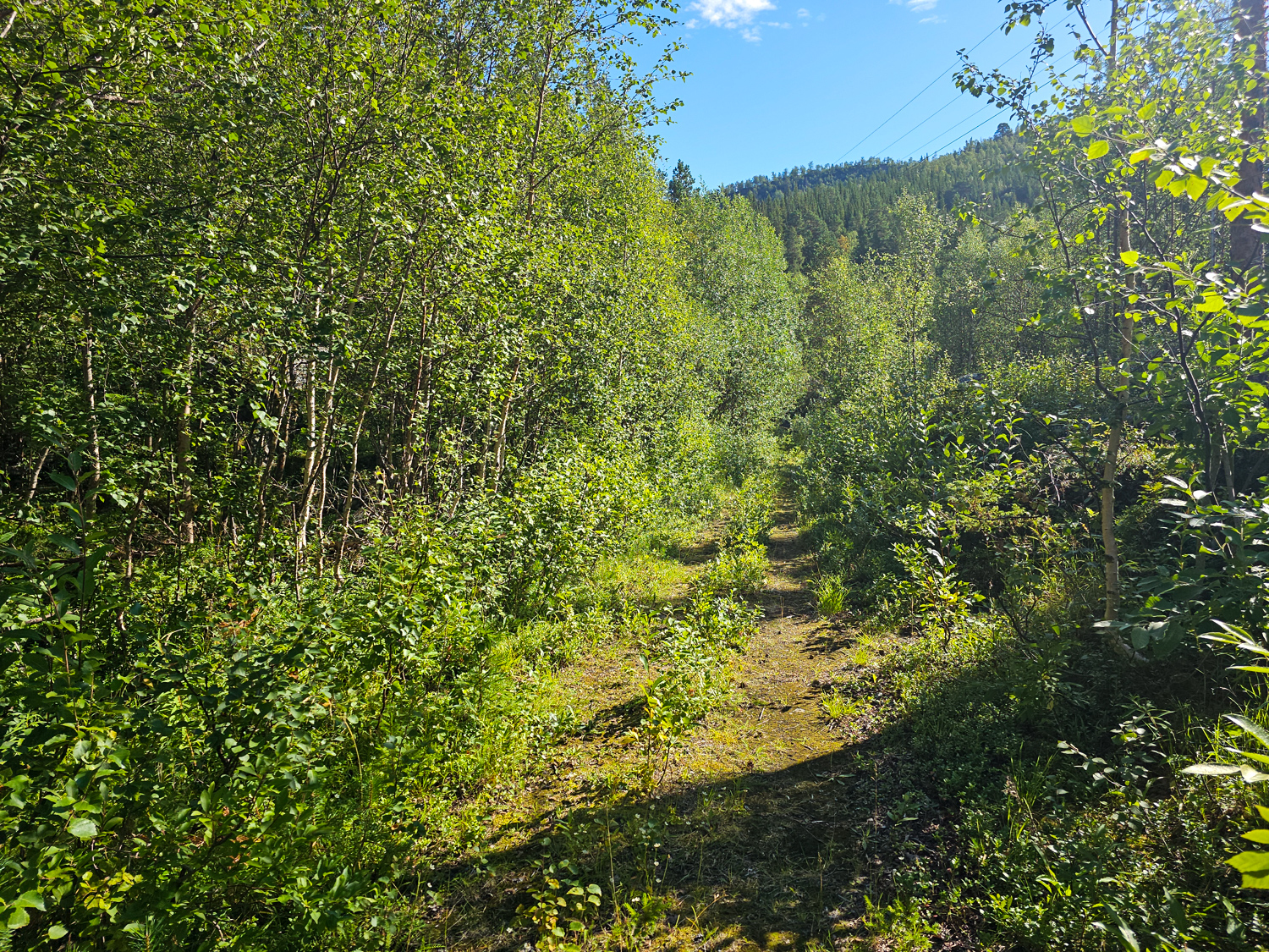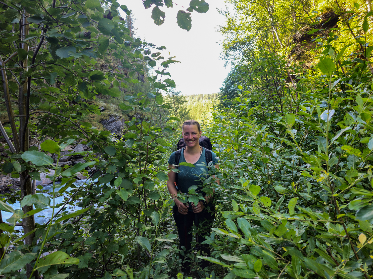 Es hat seinen Grund, dass dieses Wegstück auf der Karte gar nicht erst existiert. Einen Weg gibt es nämlich wirklich nicht. Wir schaffen es über den ausgesetzten Teil weiter in den wieder „nur“ völlig zugewucherten weiteren Teil. Ab hier gibt es wieder so etwas, das sich phantasievoll als Pfad beschreiben ließe. Besonders unverschämt finde ich es, dass hier Brennnesseln wachsen, die so groß sind wie ich. In ganz Norwegen gab es die bisher so gut wie gar nicht. Aber nun, wo der Weg eine Breite von ungefähr 20cm hat, stehen sie überall.