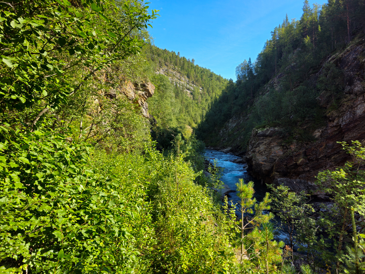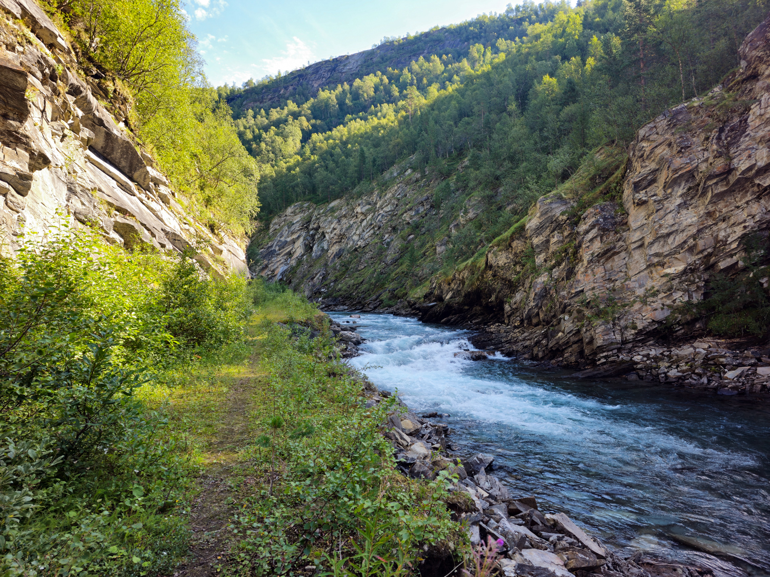 Wir sind beeindruckt von diesen unvorstellbaren Wassermassen, die sich hier bewegt haben müssen. Es kommt uns geradezu unwirklich vor, wo der Fluss doch gerade zwar stark, aber nahezu entspannt durch das traumhaft schöne Junkerdalen fließt…