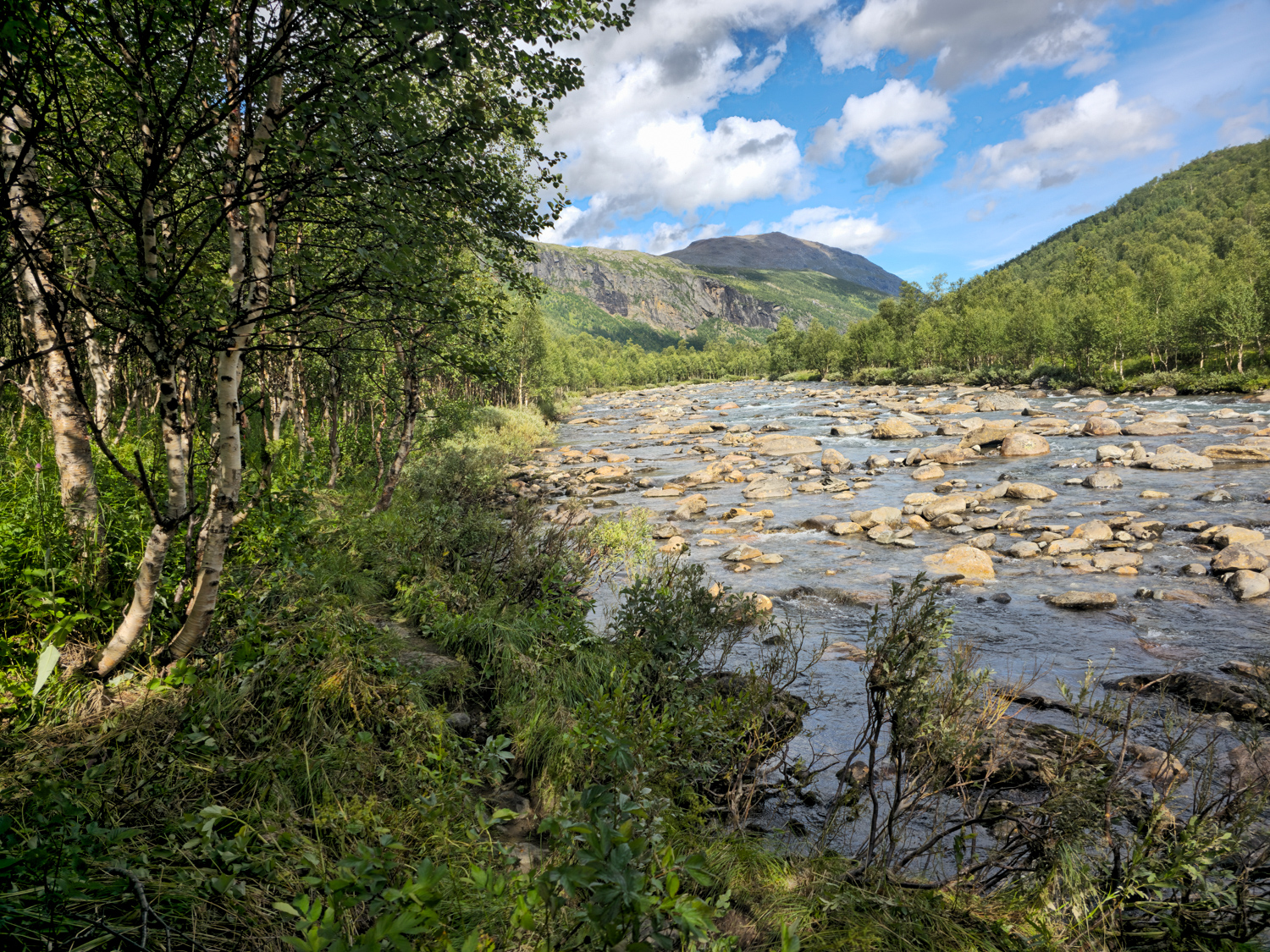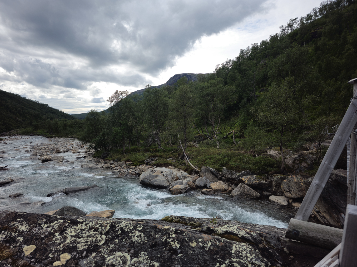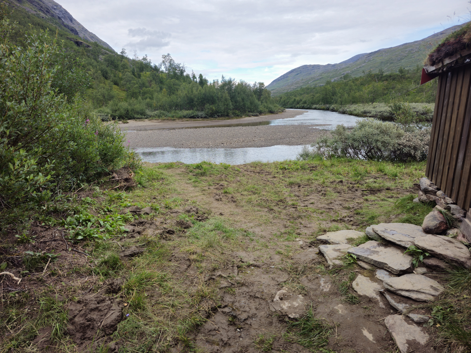Der Wanderweg ist total einfach zu gehen und führt kontinuierlich am Skaitielva entlang. Vor wenigen Tagen gab es hier jedoch ein extremes Unwetter, das den Fluss massiv ausgeweitet hat. Wir hatten schon gehört, dass Richtung Graddis eine Brücke zerstört wurde. Hier sehen wir, wie breit und hoch der Fluss durch den Regen wurde. Stellenweise ist die Uferböschung drei bis fünf Meter plattgedrückt, dabei liegt sie oft drei Meter oberhalb des jetzigen Flusses.