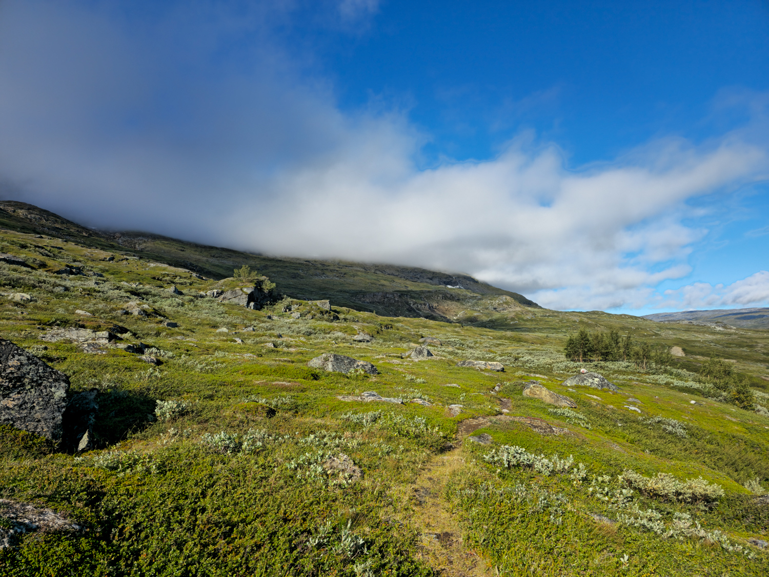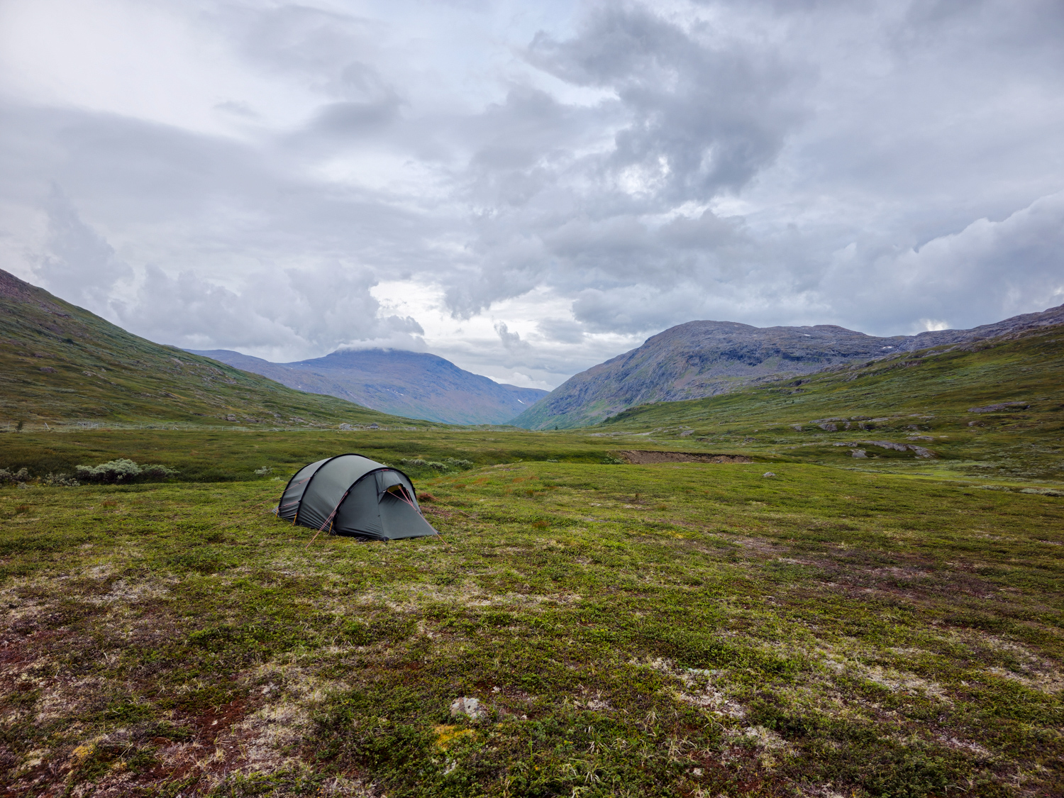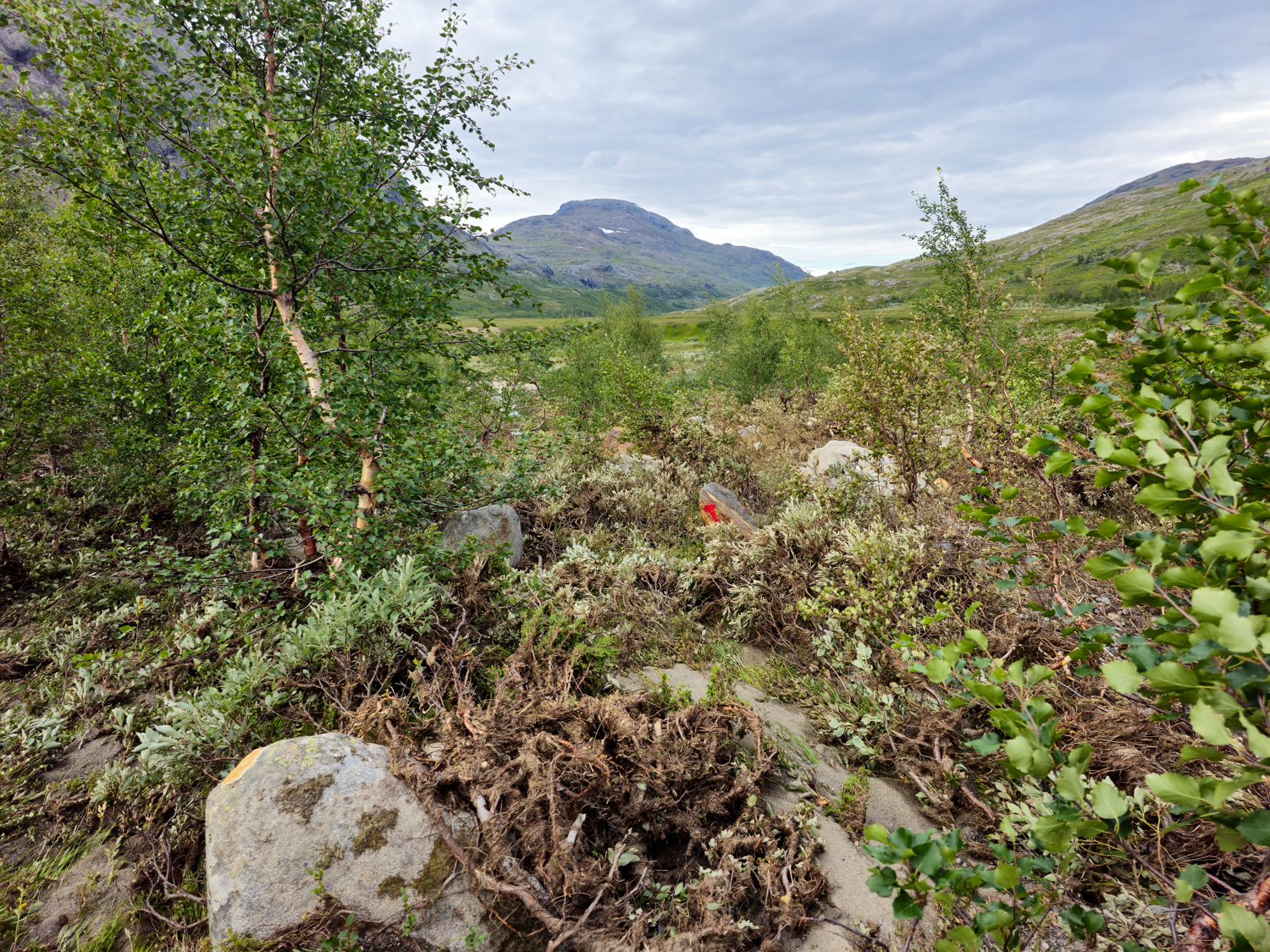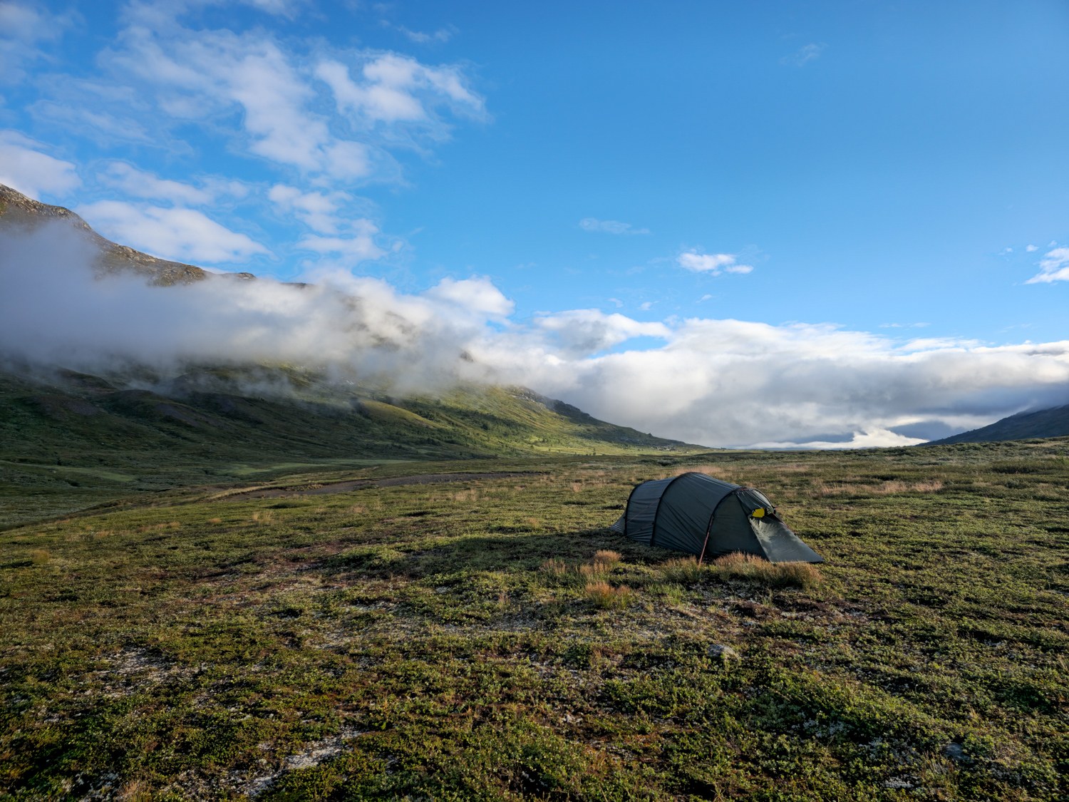 So kommen wir letztlich erst kurz nach 15 Uhr an der Straße an, aber auch das ist kein Problem. Ursprünglich bestand unser Plan darin, nun das Zelt aufzubauen, morgen entspannt über die Straße nach Sulitjelma zu gehen und dort dann 1,5 Pausentage zu verbringen. Aber so richtig ist uns gar nicht nach Pause. Es läuft gerade so gut, dass wir weitergehen wollen. Da sollte ein Pausentag dann doch auch reichen, finden wir. So ein Runners, äh, Hikers-High will schließlich genutzt werden!