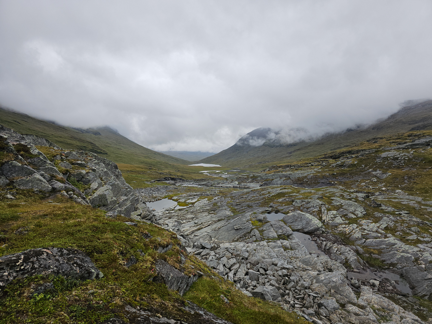 Der Weg ist heute steinig, nass und sehr rutschig. Und überwiegend nicht vorhanden. Der Weg wird wohl tatsächlich eher selten genutzt und findet beim STF scheinbar keinerlei Beachtung. Lediglich die Winterroute ist super markiert, führt aber die halbe Zeit durch’s Wasser und hilft uns deshalb überhaupt nicht. Da wir ein enges Tal passieren, können wir zumindest die Richtung nicht verfehlen.