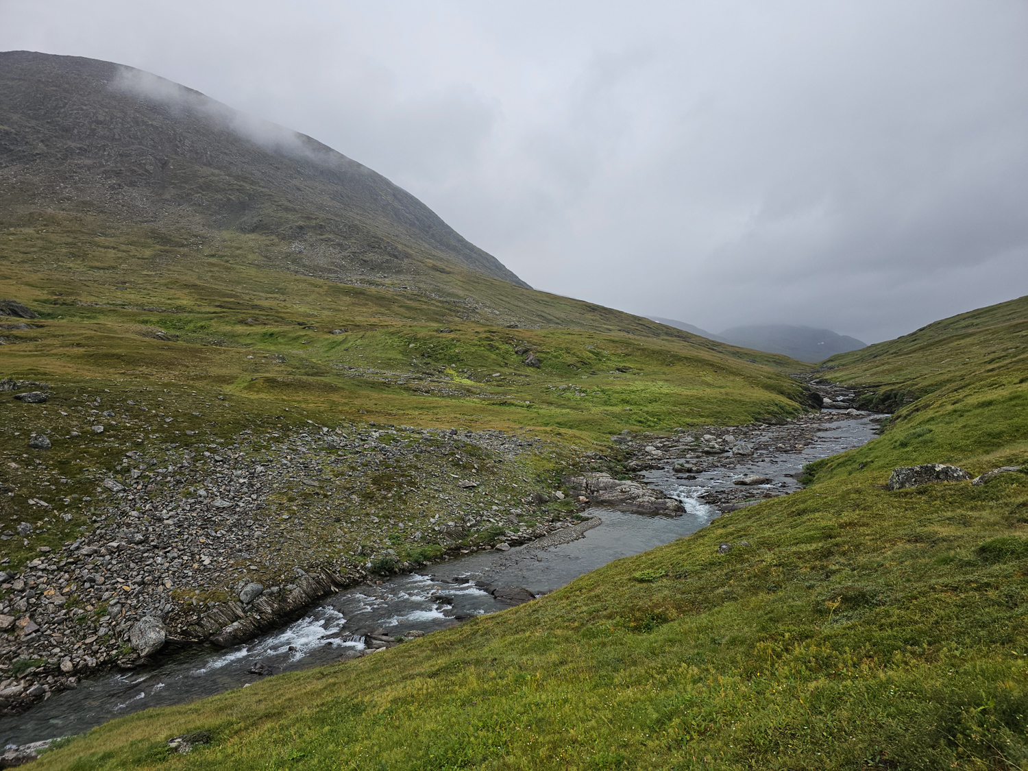 Zuerst fragt uns jemand nach dem Weg. Er habe die Schilder nicht beachtet. Da er zu einer Hütte am Hauptweg, also dem Kungsleden, will, ist die Frage nahezu beeindruckend. Wir bestätigen aber, dass er sich nicht verlaufen hat. Dann sehen wir eine Wanderin, die offenbar einen Wanderstiefel verloren hat. Sie trägt nämlich nur noch einen, der andere Fuß steckt in Plastiktüten gehüllt in einer Sandale. Noch ein anderer Wanderer trägt eine ganz spannende Hosenkombination. Die Hose an sich ist kurz, darunter geht es aber mit Mückennetzen weiter. Wir spekulieren ob er alternativ vielleicht auch Fernwanderer ist und eine Vorliebe für Netzstrümpfe hat, aber diese mit der Zeit zu weit geworden sind, so wie alle Klamotten auf einer Weitwanderung…