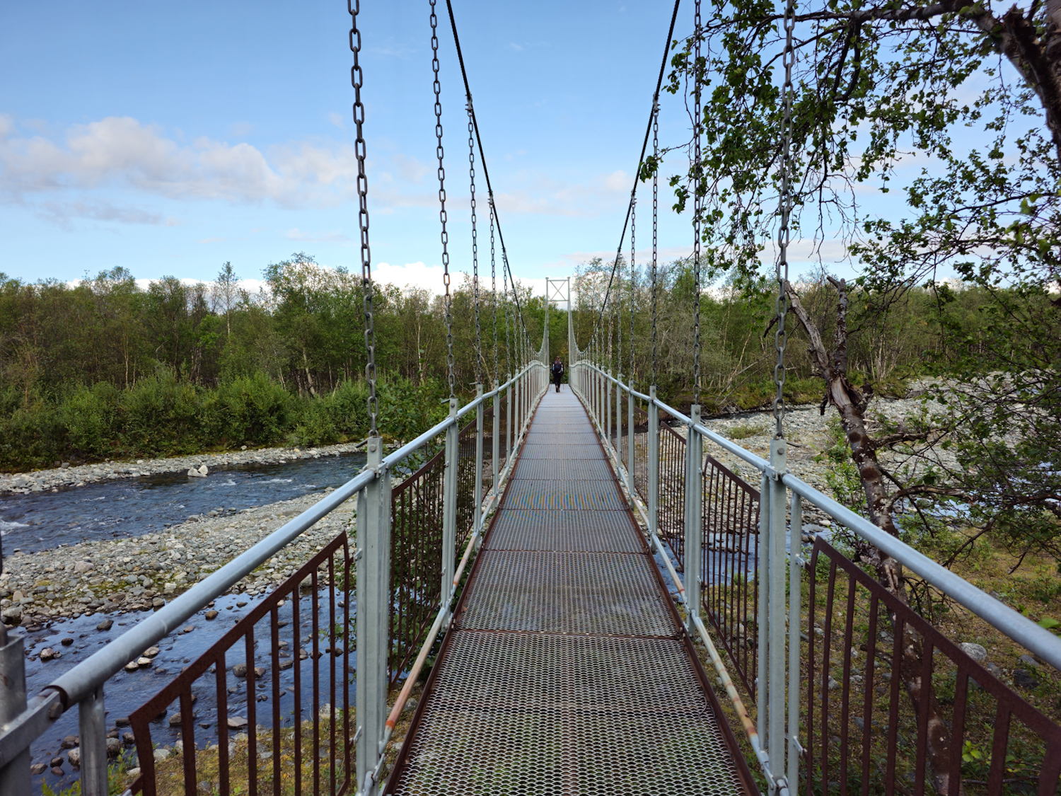 Wir steigen in das Tal hinab und gehen dort in der Ebene weiter. Ab der Höhe der Abiskojaure begegnen uns zunehmend Tagestouristen. Da haben sie sich wirklich keine spannende Strecke ausgesucht. Landschaftlich schön wird es definitiv erst, wenn man oben in den Bergen unterwegs ist. Für uns ist der Weg pragmatisch. Er führt uns halt zum Ziel. Dafür kommt die Sonne heraus und verschönert die Landschaft immerhin ein bisschen.