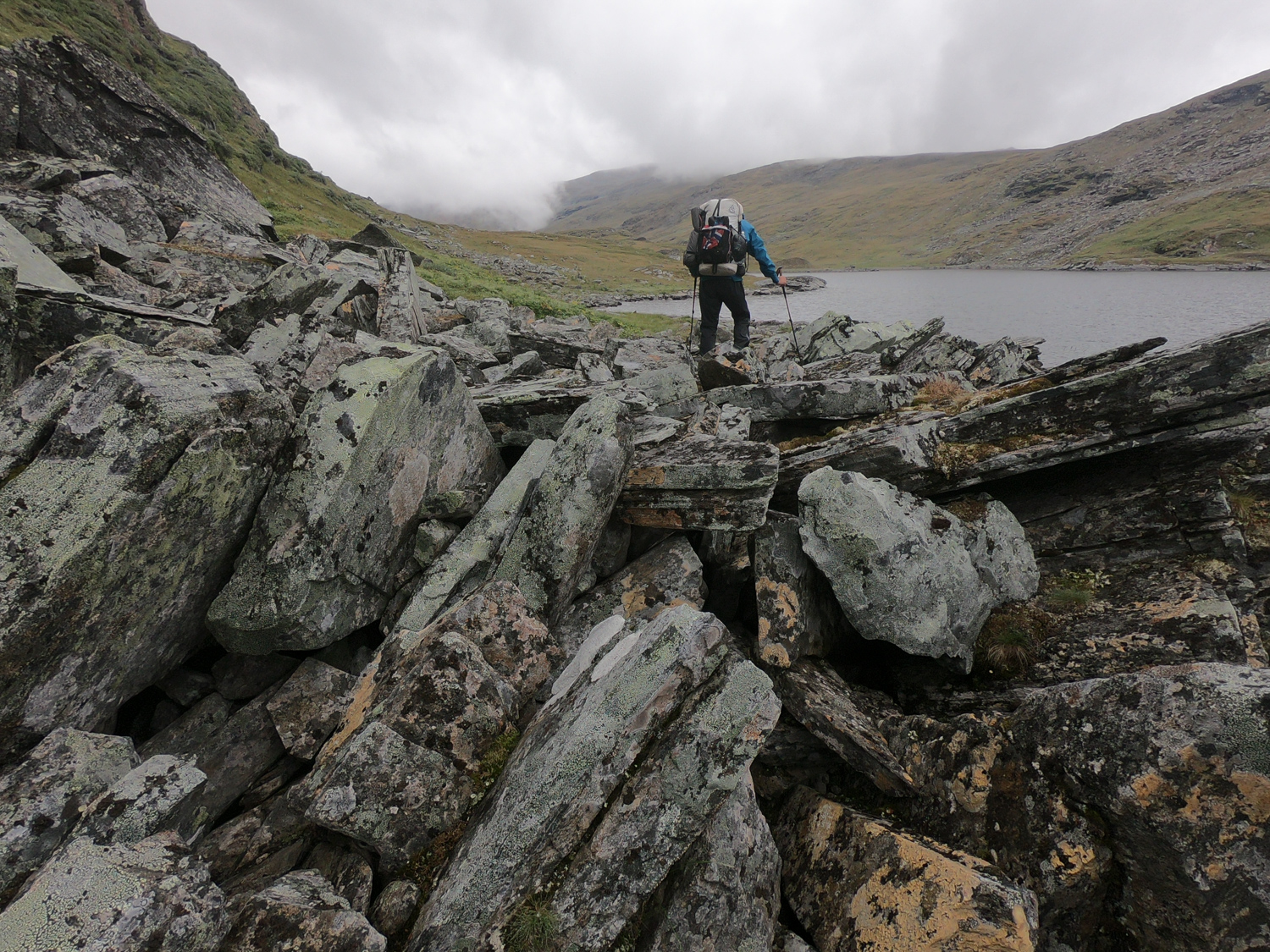 Nach einem letzten dicken Geröllfeld geht es immerhin auf einem halbwegs erkennbaren Pfad weiter.