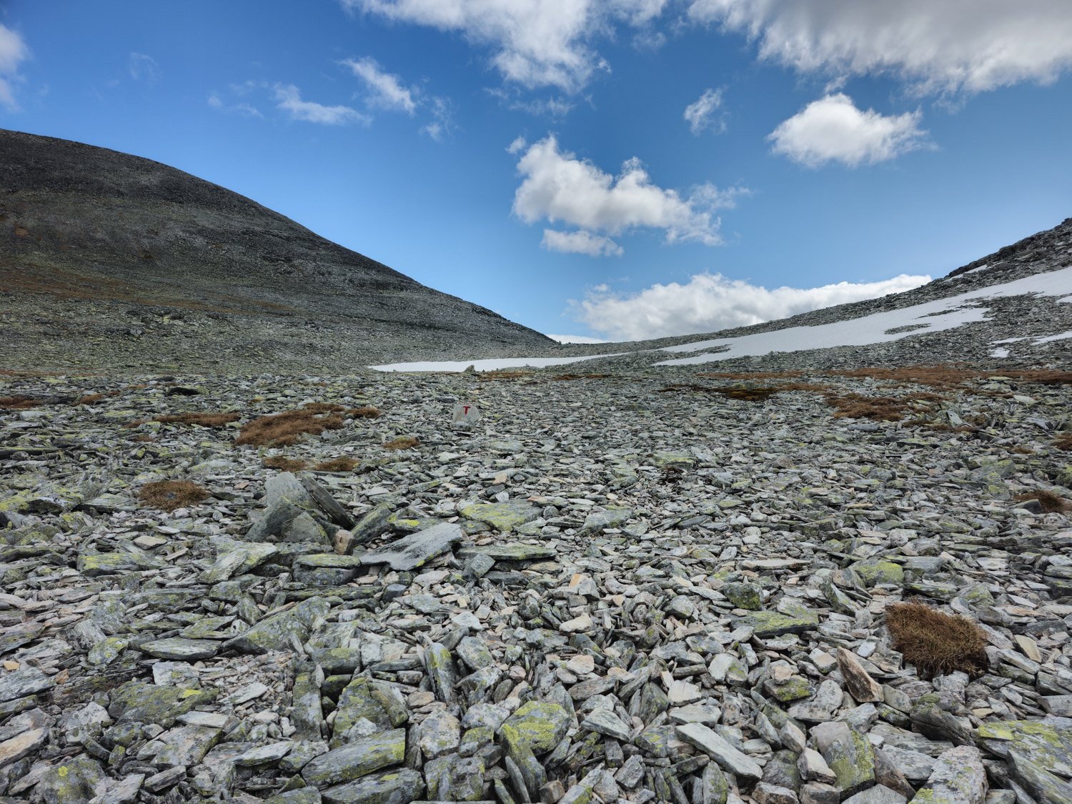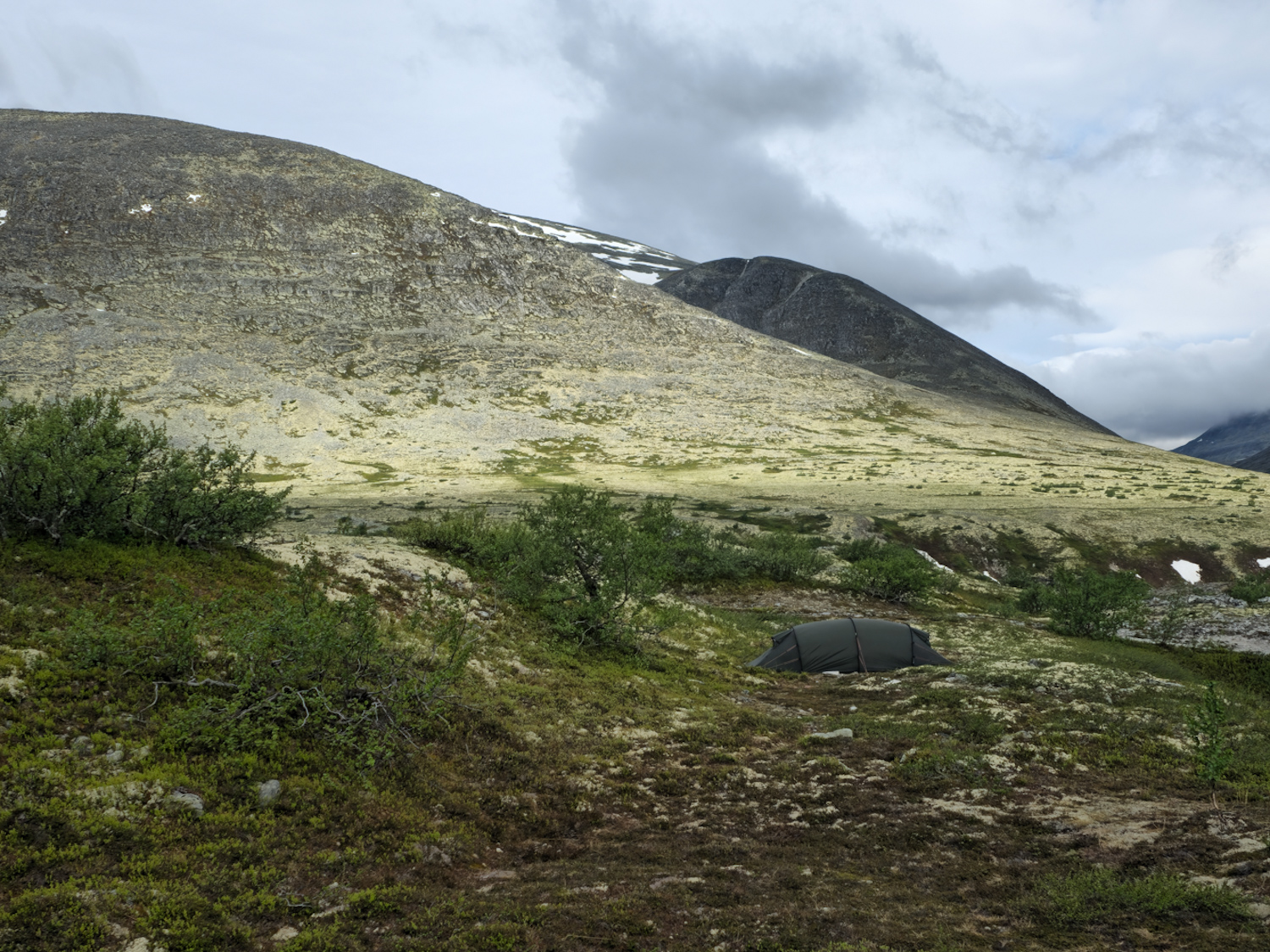 Die halbwegs ebenen Stellen sind mit dünnen Flechten bewachsen. Heringe kriegen wir hier nicht befestigt. Also geht es weiter bis zu unserem eigentlichen Ziel. Dank der ausführlichen Berichte von Sophie, einer NPL Läuferin aus dem letzten Jahr, wissen wir von einer Zeltmöglichkeit.