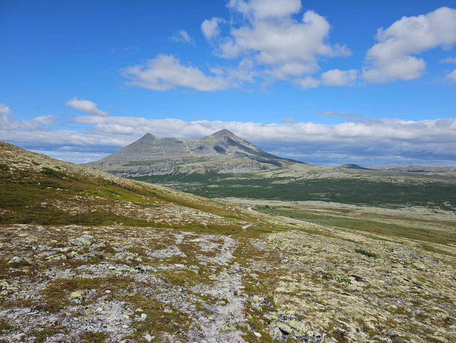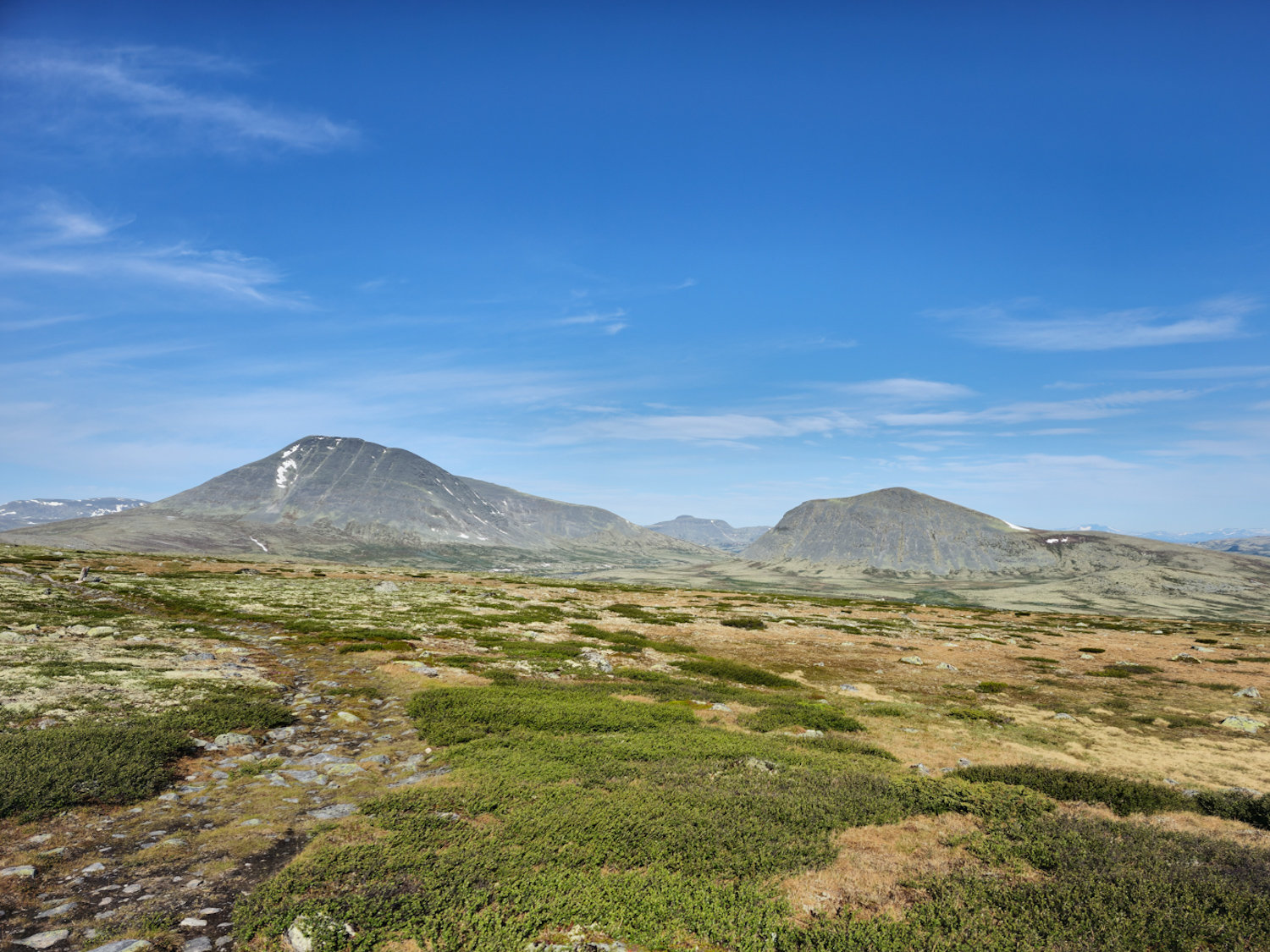 Geradeaus die weite Ebene, zu unserer Linken der Veslsølnkletten und ein Bach direkt in Reichweite. Es könnte uns hier nicht besser gehen. Und das Allerbeste: Wie schon den ganzen Tag weht auch hier ein guter Wind. Wir genießen unser Essen also draußen in der Sonne ohne eine einzige Mücke. Könnte es doch nur immer so sein!