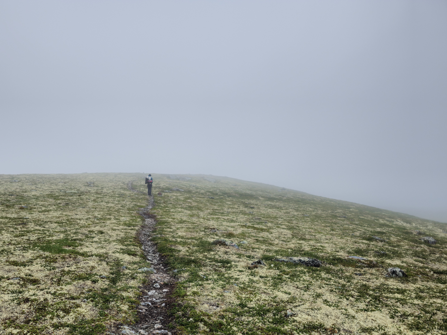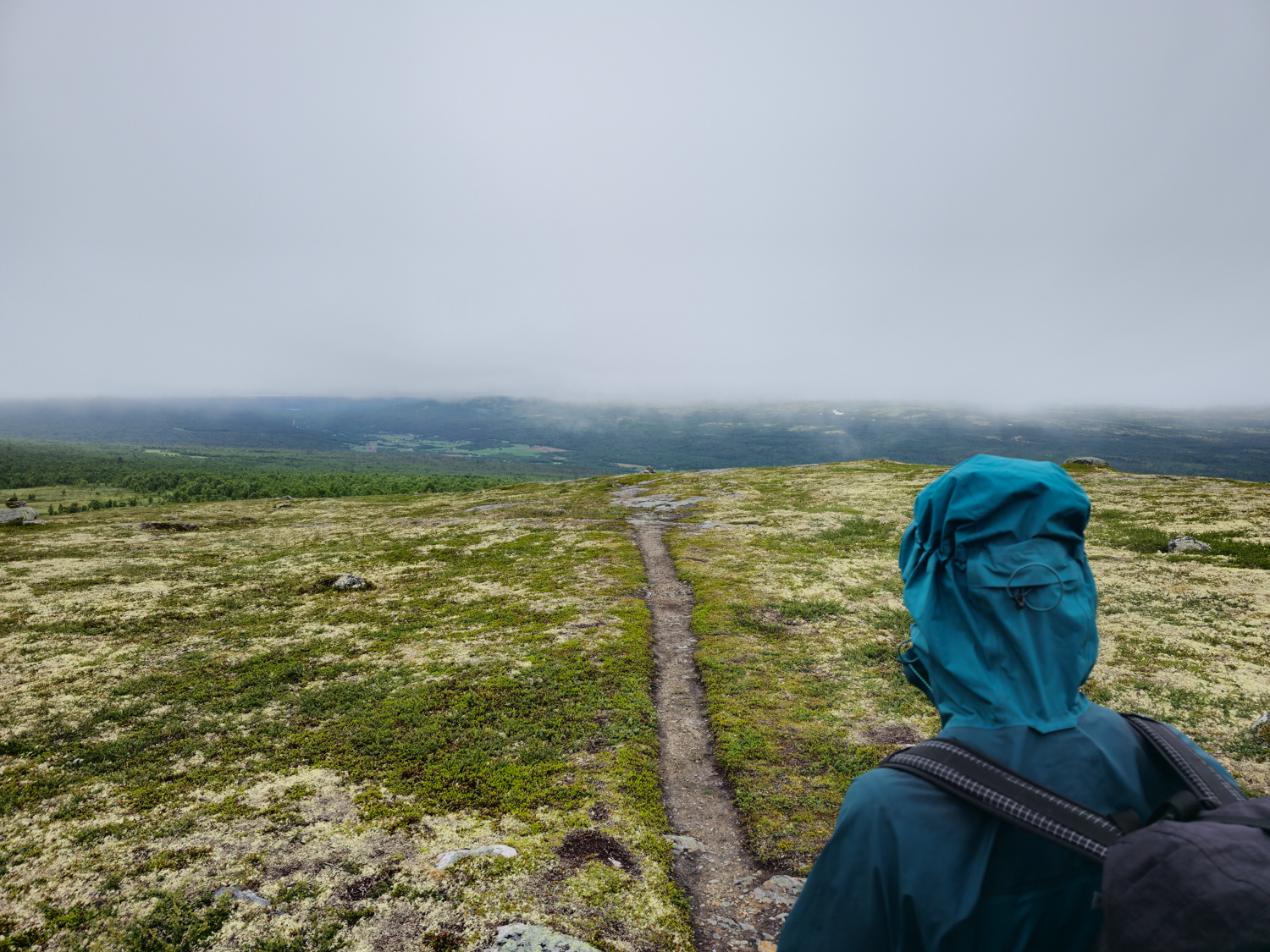 Dafür ist der DNT-Weg wieder gut markiert. Er entspricht zwar nicht unserer Route, aber da trauen wir weiterhin lieber den Markierungen. Oberhalb der Baumgrenze weht ein frischer Wind. Die Landschaft ist durch das usselige Wetter, wie man bei uns sagt, trotzdem wieder richtig schön. Auch wenn wir effektiv kaum etwas davon sehen können.