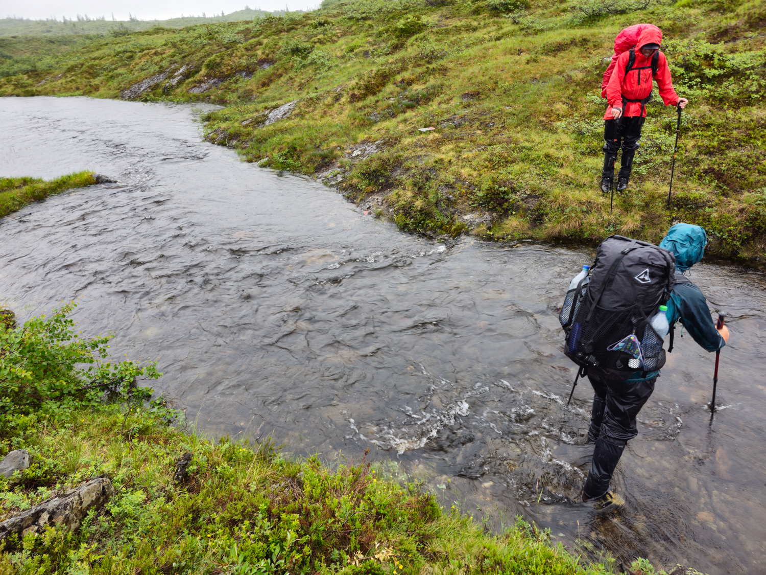 Ab jetzt geht es auf in das weglose Gebiet. Nach kurzer Zeit kommen wir zu einem Fluss, der wieder gefurtet werden will.
