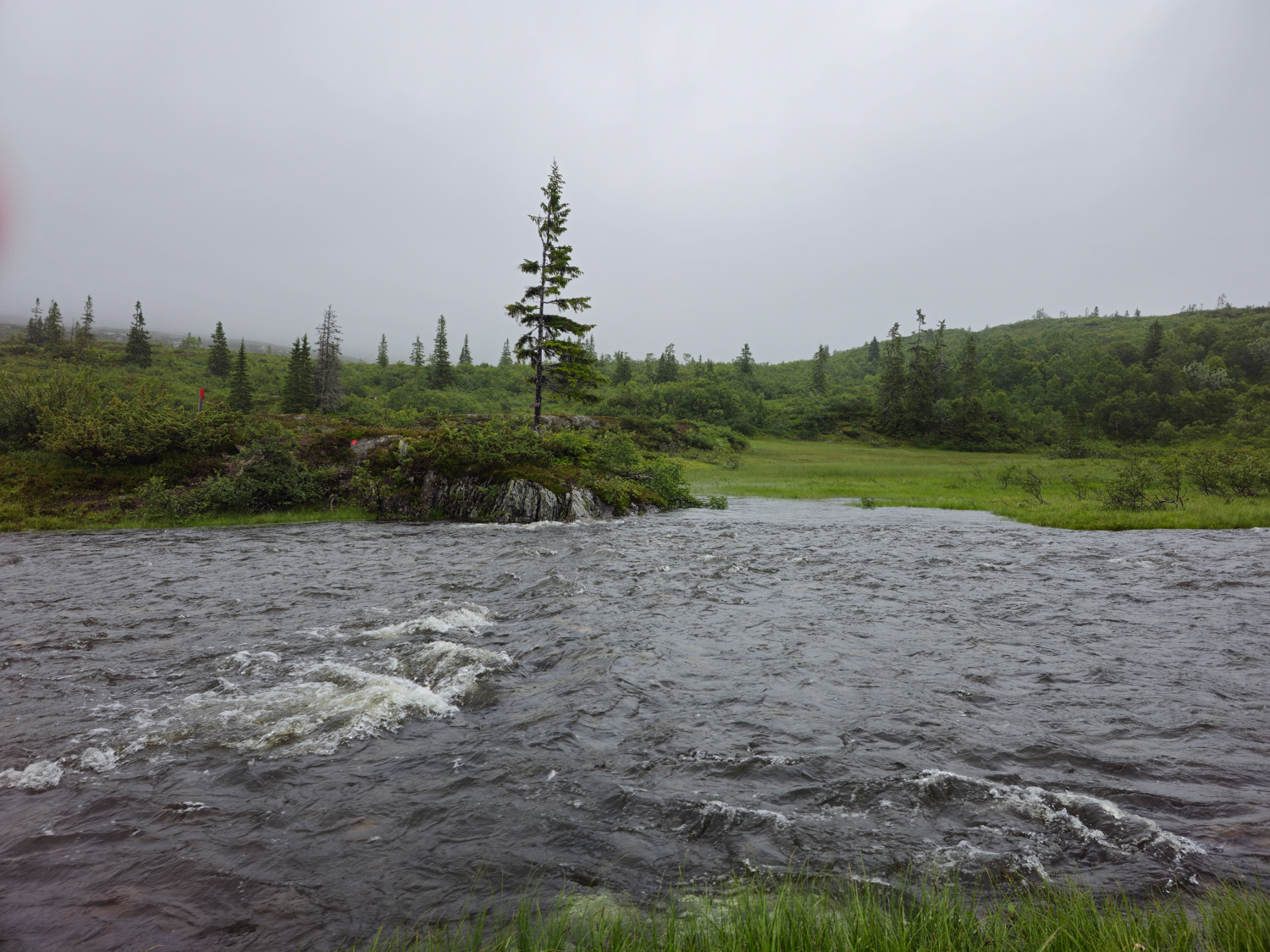 Allen gemein ist eine unglaublich starke Strömung. Zunächst können wir die Bäche noch irgendwie mit trockenen Füßen (wenn man das noch so nennen will) überspringen oder durchqueren. Den ersten richtigen Fluss schaffen wir mit einem größeren Umweg trocknenen Fußes. Da macht das Suchen mir noch Spaß. Doch dann kommen wir an den beschaulichen kleinen Fluss Tverråa. Nur ist hier nichts mehr beschaulich und klein. Der Fluss ist breit, laut, stark strömend und tief.