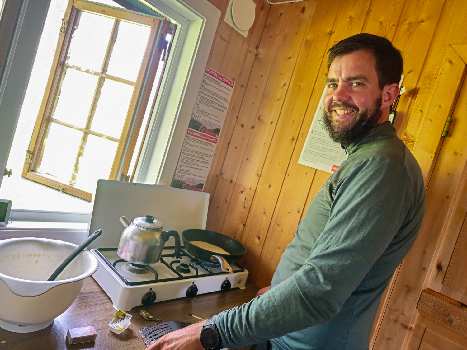 Uns wird hier ein bisschen schwer ums Herz. Das ist unsere letzte Hütte auf der Reise, die Lebensmittel bietet. Nicht verwunderlich also, dass wir völlig maßlos zuschlagen. Stefan und ich teilen uns erst eine Tafel Schokolade, dann eine Dose Pfirsiche. Anschließend esse ich ein paar Asianudeln und Stefan Knäckebrot mit Nugatti aus der Tube. Als Abschluss bereitet Stefan dann noch eine Familienpackung Pfannkuchen zu, die wir allerdings zu dritt verputzen. Schließlich sind wir ja auch eine kleine Wanderfamilie hier. Und da die norwegischen Feuermelder anscheinend alle empfindlich sind, geht auch hier ein Alarm los. Den können wir aber zum Glück selbst schnell ausschalten. 😀