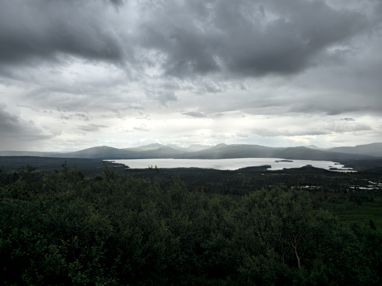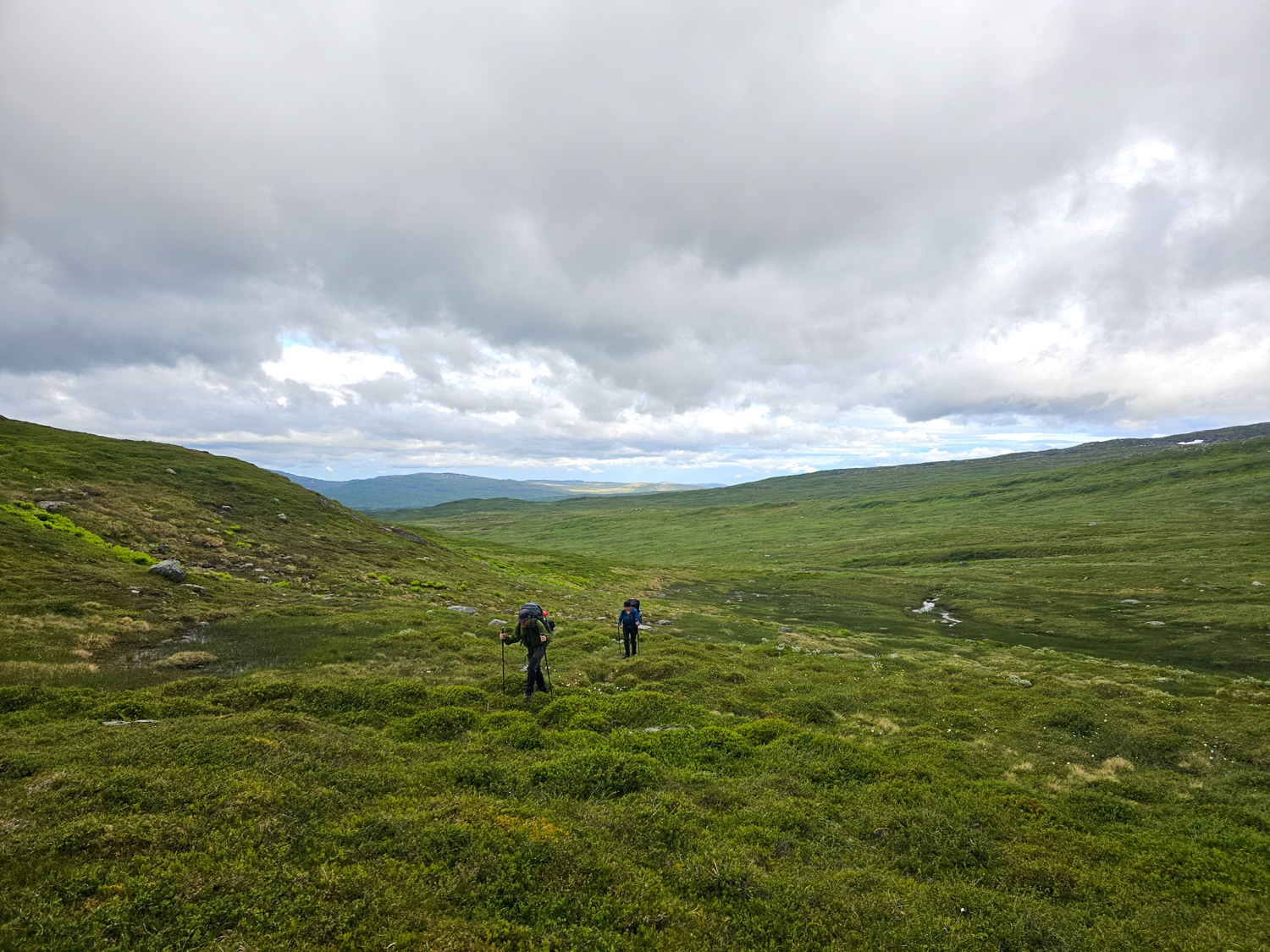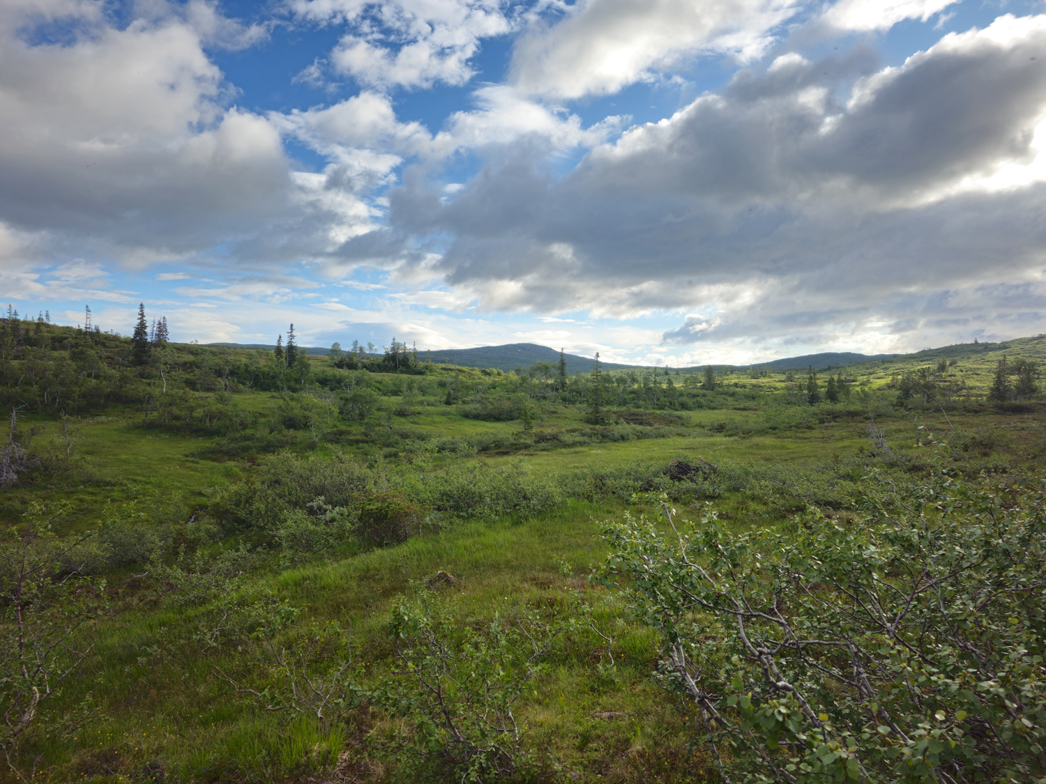 Kaum Sumpf, viel fester Untergrund! Und wieder so viele tolle Aussichten. Nachdem wir das erste Tal durchquert haben und auf der Anhöhe stehen, blicken wir auf jede Menge Berge. Viele davon sind auf der schwedischen Seite, da wir uns hier nur ca. drei Kilometer von der Grenze entfernt befinden.