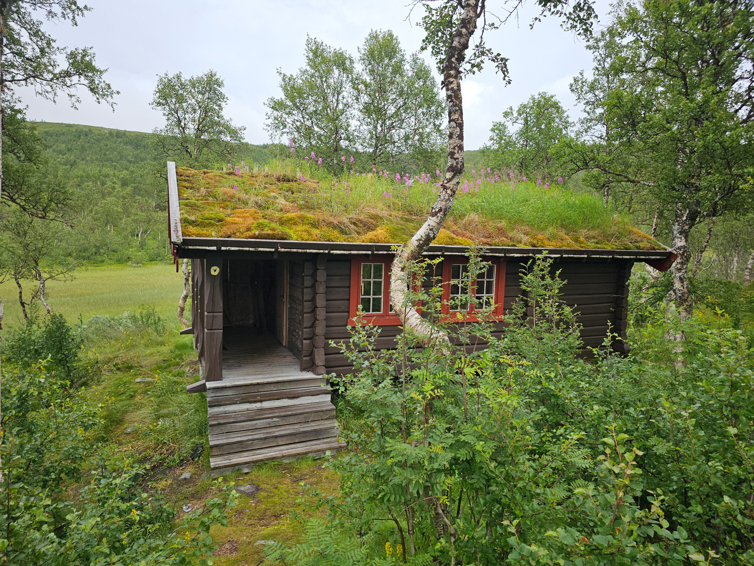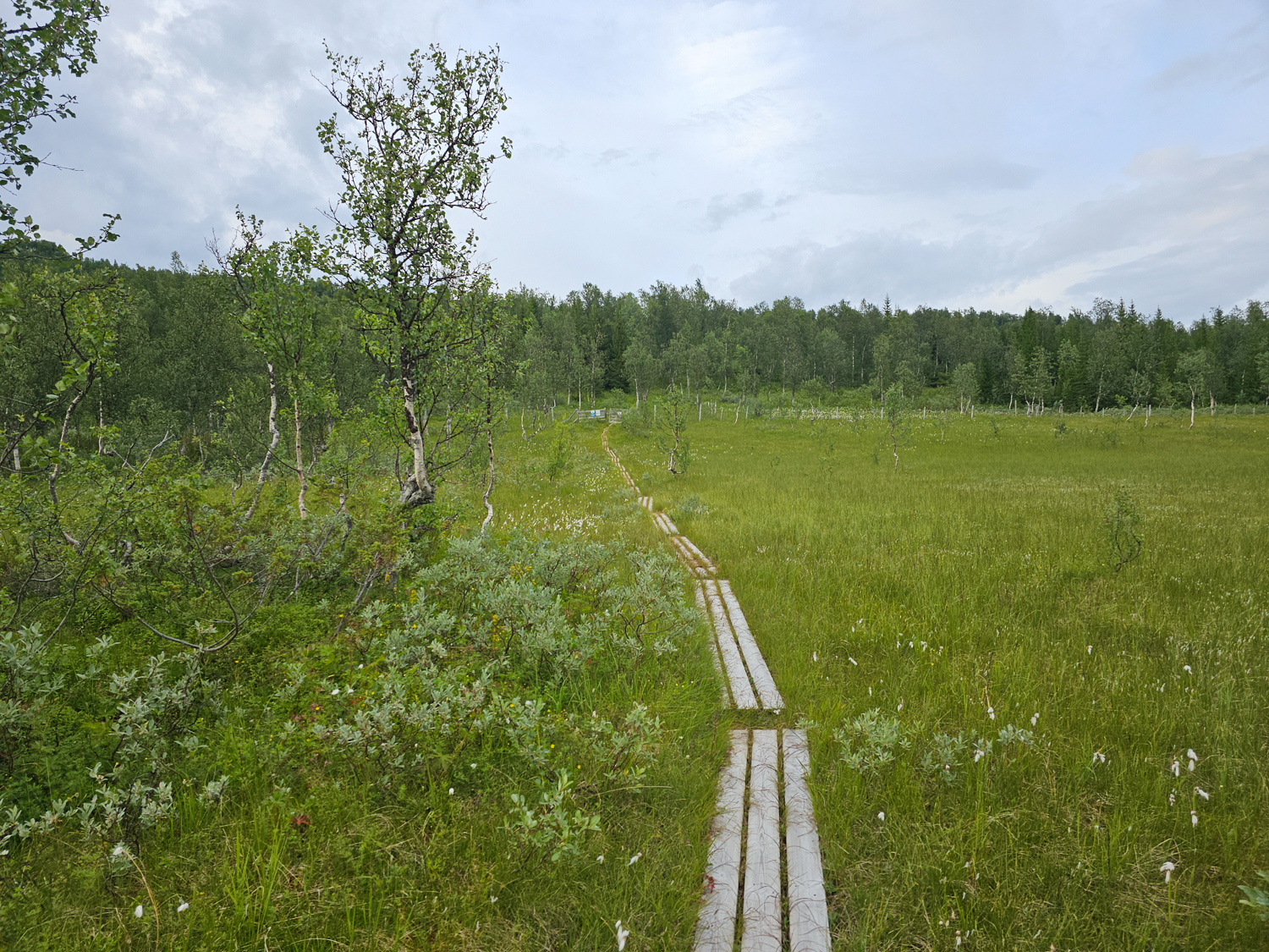 Nach vielen Tagen mit trockenen Füßen geben die Schuhe heute bei Nässe von oben und unten nach. Da trifft es sich gut, dass auf dem Weg eine offene Statskog-Hütte liegt, die Krutvasshytta. Beim Abstieg ist der Sumpf wieder mit Holzplanken ausgelegt. Da der Sumpf hier tatsächlich sehr tief ist, freut uns das total. Nur hilft das leider nicht immer. An einer Stelle liegen die Holzbalken etwas unterhalb der Sumpfwasseroberfläche, so dass man vorsichtig ertasten muss, wo Holz und wo Sumpf ist. Stefan geht mutig voran und geht an einer Stelle leider davon aus, dass die Planke noch etwas länger ist. Doch zwischen dieser und der nächsten Planke ist ein Loch, das ziemlich genau fußbreit ist. Stefans rechter Fuß verschwindet mitsamt dem halben Unterschenkel. Mit einiger Mühe kriegt er Bein und Fuß zum Glück samt Schuh aus dem Schlamm. Ich frage Stefan, ob er den Schritt für’s Foto bitte nochmal machen würde, aber irgendwie will er nicht. Also gibt es nur ein Foto vom Trekkingstock zum Vergleich.