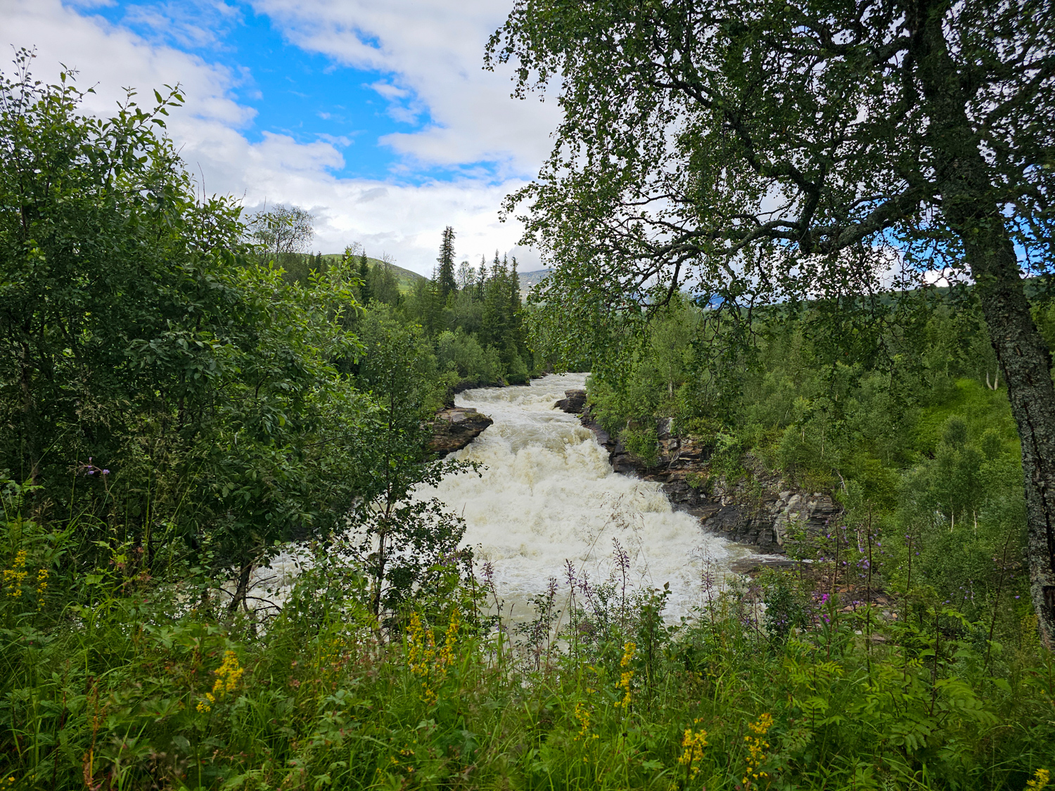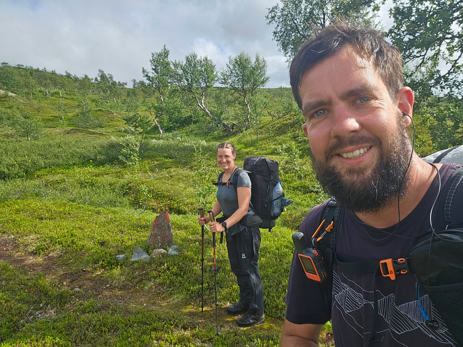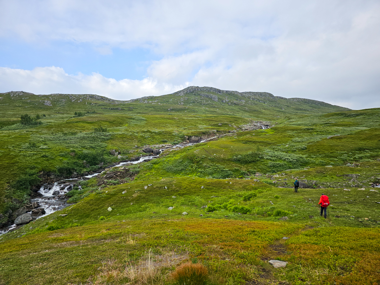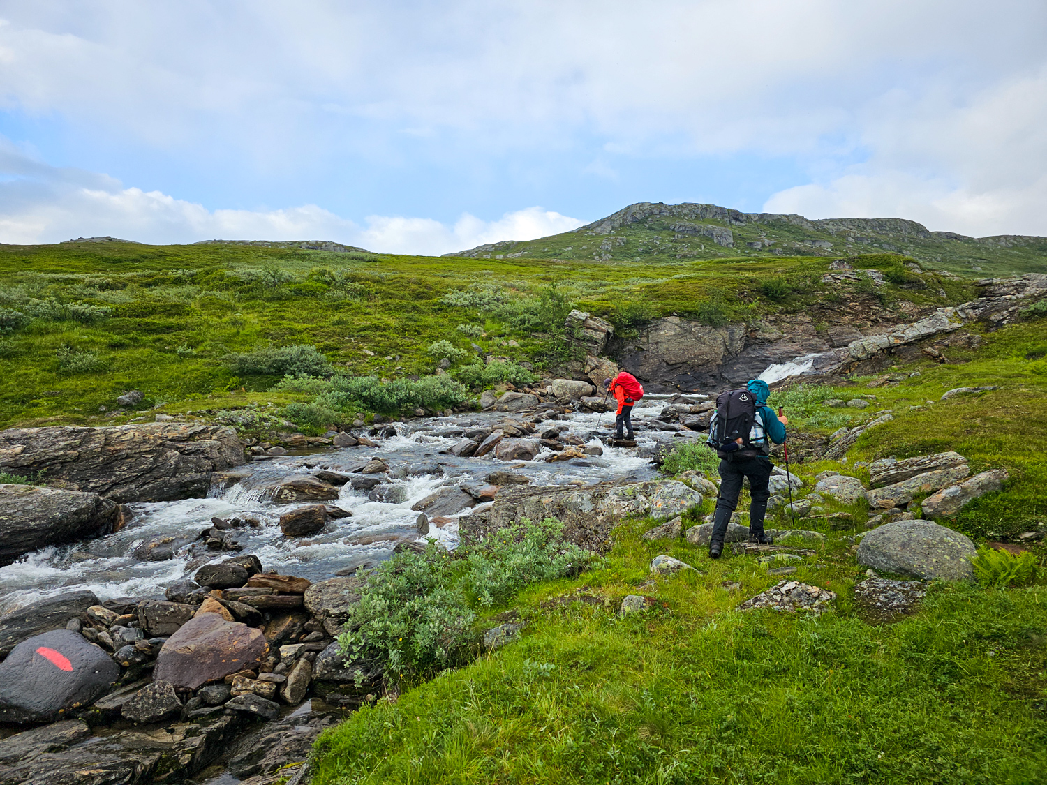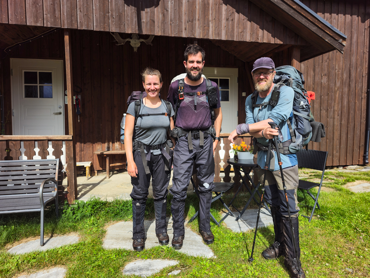 Da wir weiterhin eher ratlos sind, sprechen wir mit Håkon. Er kennt sein Zuhause schließlich. Er erklärt uns, dass der Fluss am Berg auf der anderen Seeseite ein guter Indikator für die Wassermenge ist. Wenn er kleiner wird, wird der Wasserstand auch auf unserem Weg niedriger werden. Zudem zeigt er uns die kritischen Flüsse. Die meisten müssten aber gut machbar sein. Das klingt beruhigend! Seine sehr herzliche Frau Kari kommt dazu und sie beratschlagen nochmal gemeinsam. Wir dürfen auf jeden Fall noch bis zum Nachmittag bleiben und warten, bis die Wetterlage für uns gut ist. Um kurz nach 14 Uhr machen wir uns zu dritt auf den Weg.