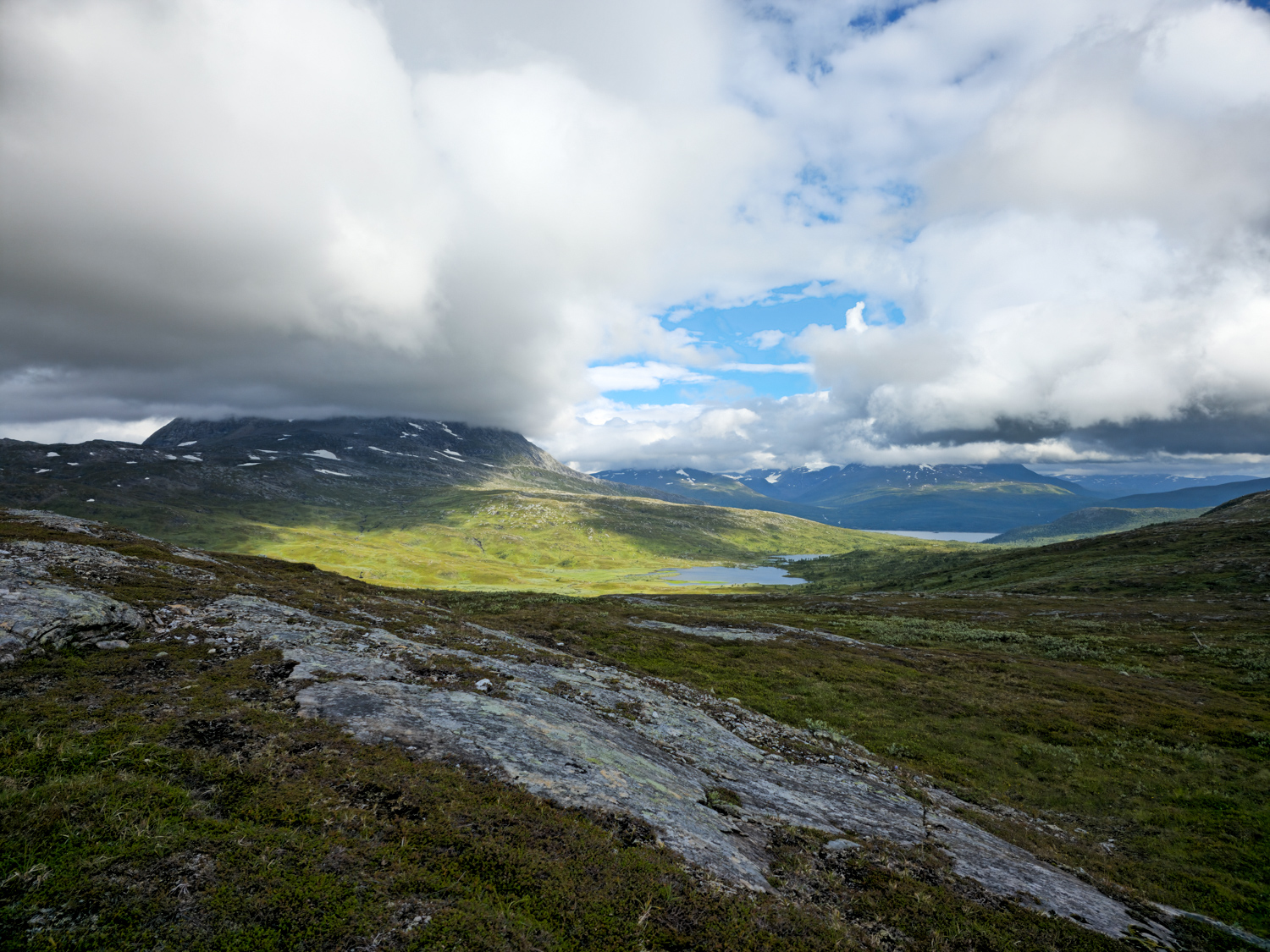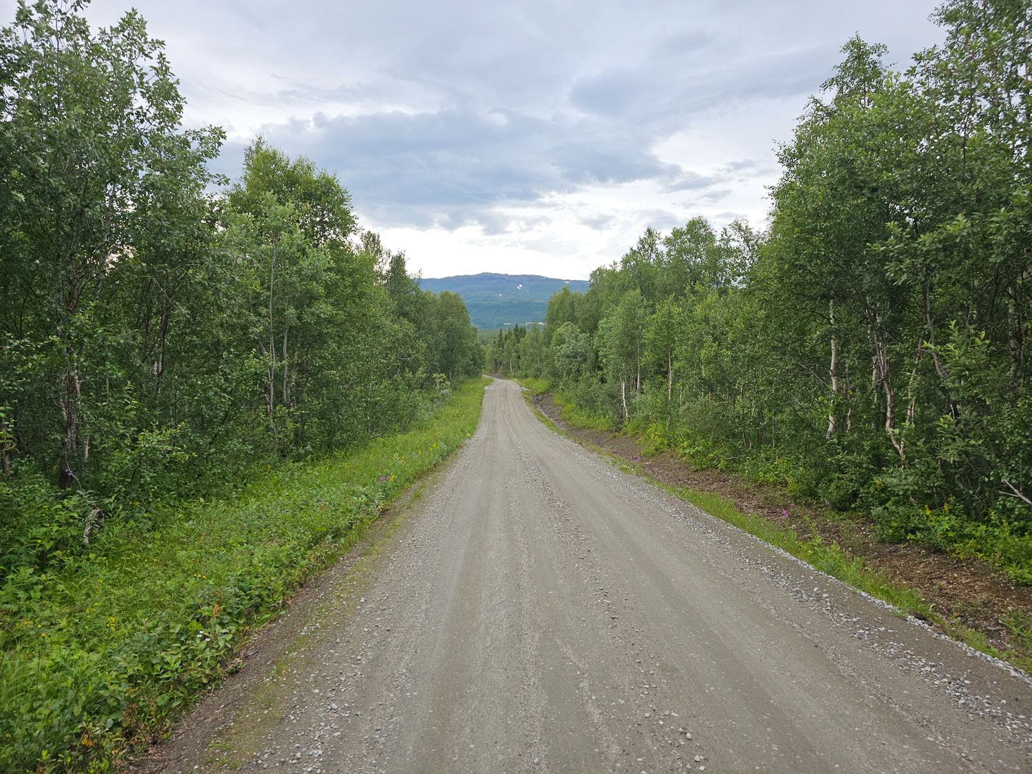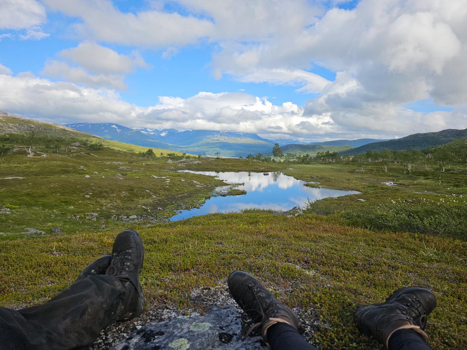 Nach weiteren 13 langen, hügeligen und sehr nassen Kilometern sind wir richtig müde. Wir überlegen kurz, ob wir einfach hier das Zelt aufbauen, aber entscheiden uns doch dagegen. Nach der Anstrengung im Fjell wollen wir uns nun noch ein bisschen Schotterstraßen-Entspannung gönnen. Auch wenn die Uhr bereits Richtung 18.30 Uhr tendiert…