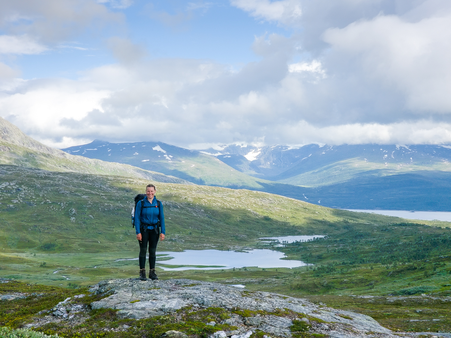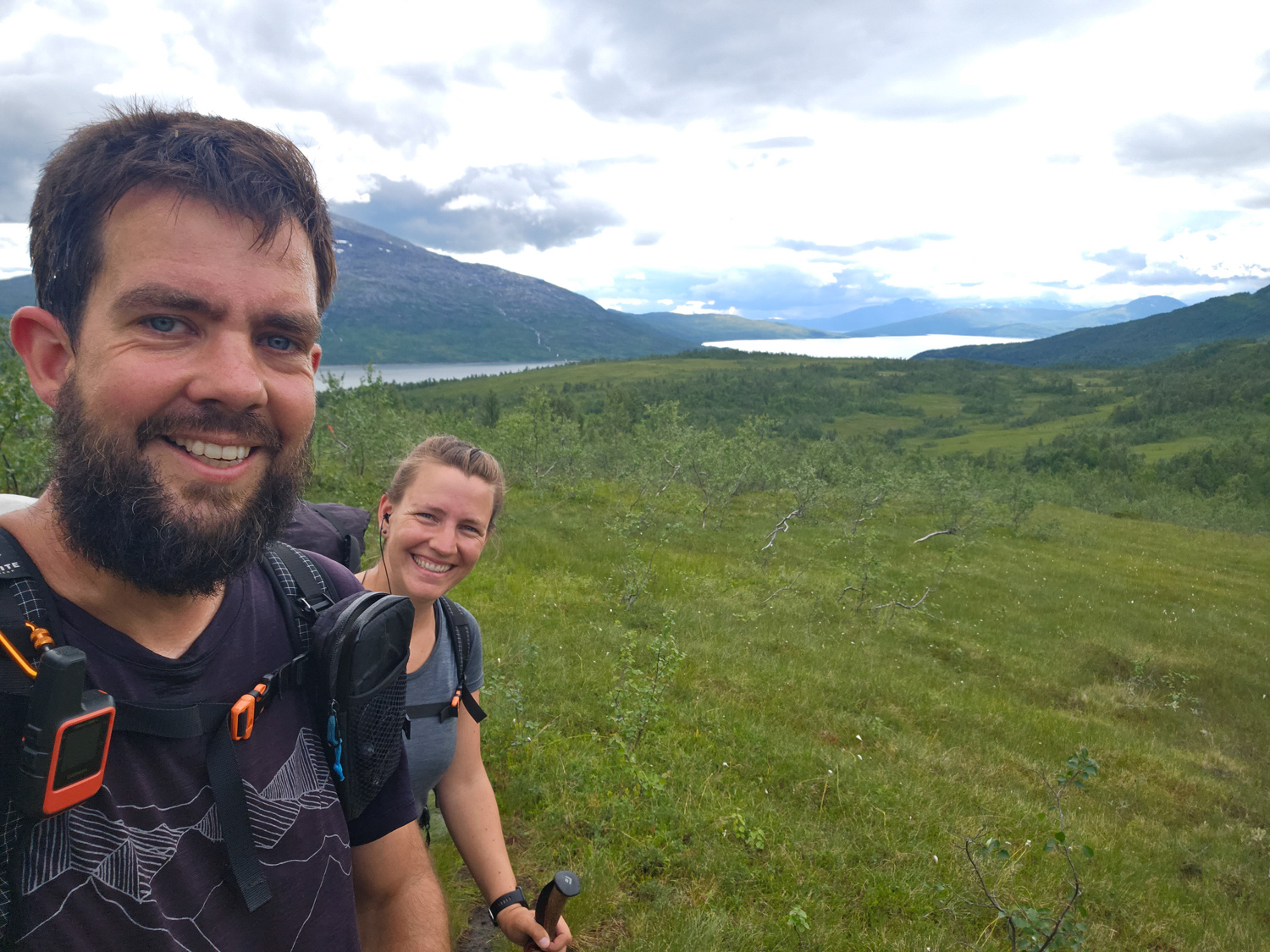 Aber erstmal genießen wir die heutige Wanderung. Wir folgen weiterhin der Nordlandruta und heute ist es wieder wahnsinnig schön. Zwar dürfen wir erneut viel auf und ab laufen, aber um uns herum sind viele hohe Berge, so dass wir die Aussichten sehr genießen. Der Blick auf den Øvre Skinnfellvatnet irritiert uns.