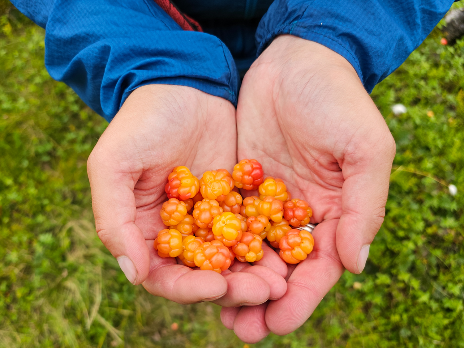 Am liebsten würden wir die Rucksäcke gegen ein Körbchen eintauschen und fleißig sammeln. Die aufkommenden dunklen Wolken ermahnen uns aber zum Weitergehen. So landen nur immer wieder Hände voll von leckeren Moltebeeren in unseren Mündern, die wir hier und da schnell pflücken können.