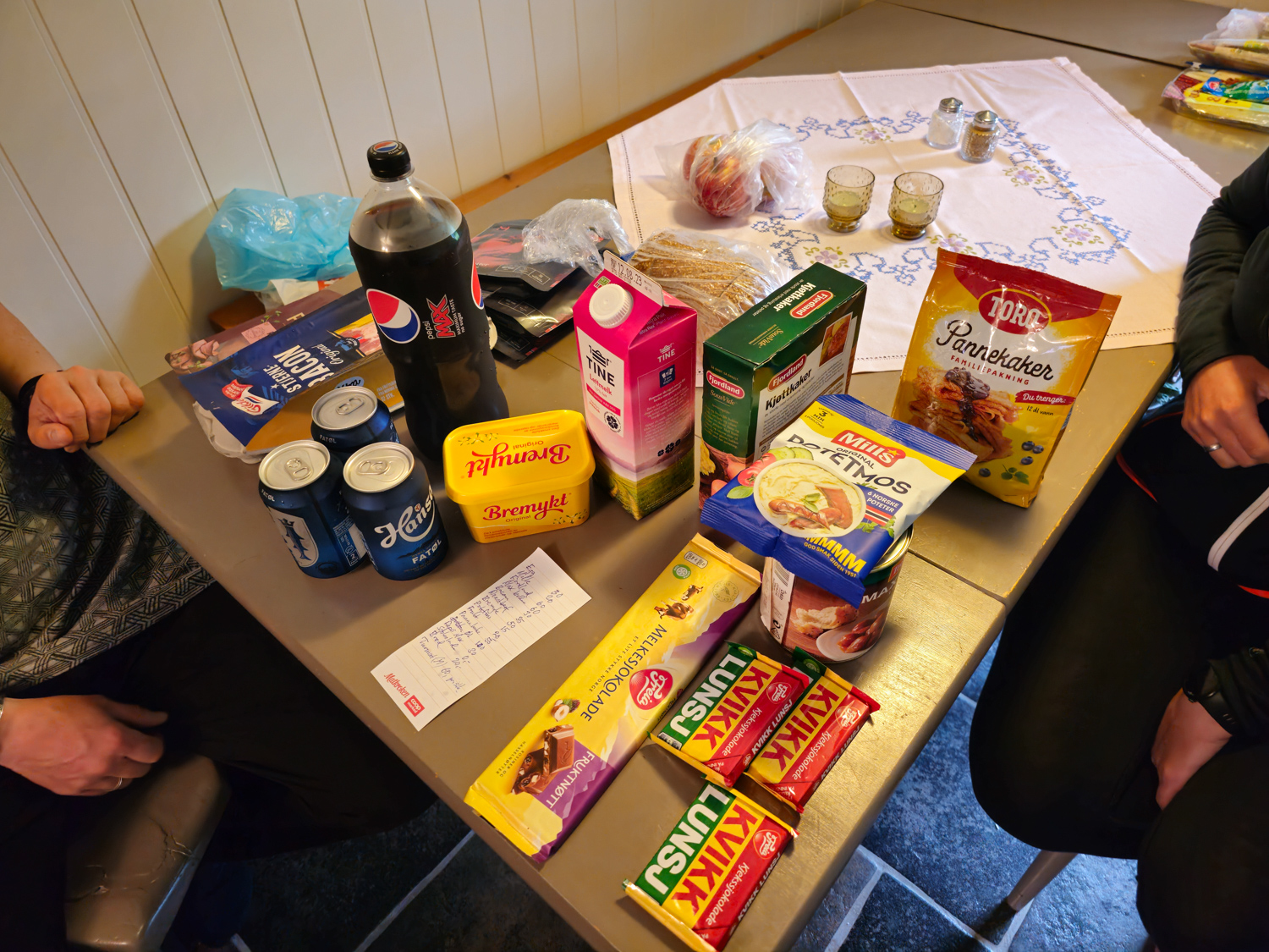 Kurz darauf kommt Daniel an. Das hatten wir schon vermutet. Als wir die Unterkunft bezahlen, fragen wir Håkon, ob er wohl noch etwas zu essen für die hungrigen Wanderer hat. Eigentlich muss man das hier vorher anmelden, aber wir haben mal wieder Glück. Håkon kommt irgendwann mit zwei gut gefüllten Einkaufstüten wieder und bietet uns eine große Auswahl an Lebensmitteln an.