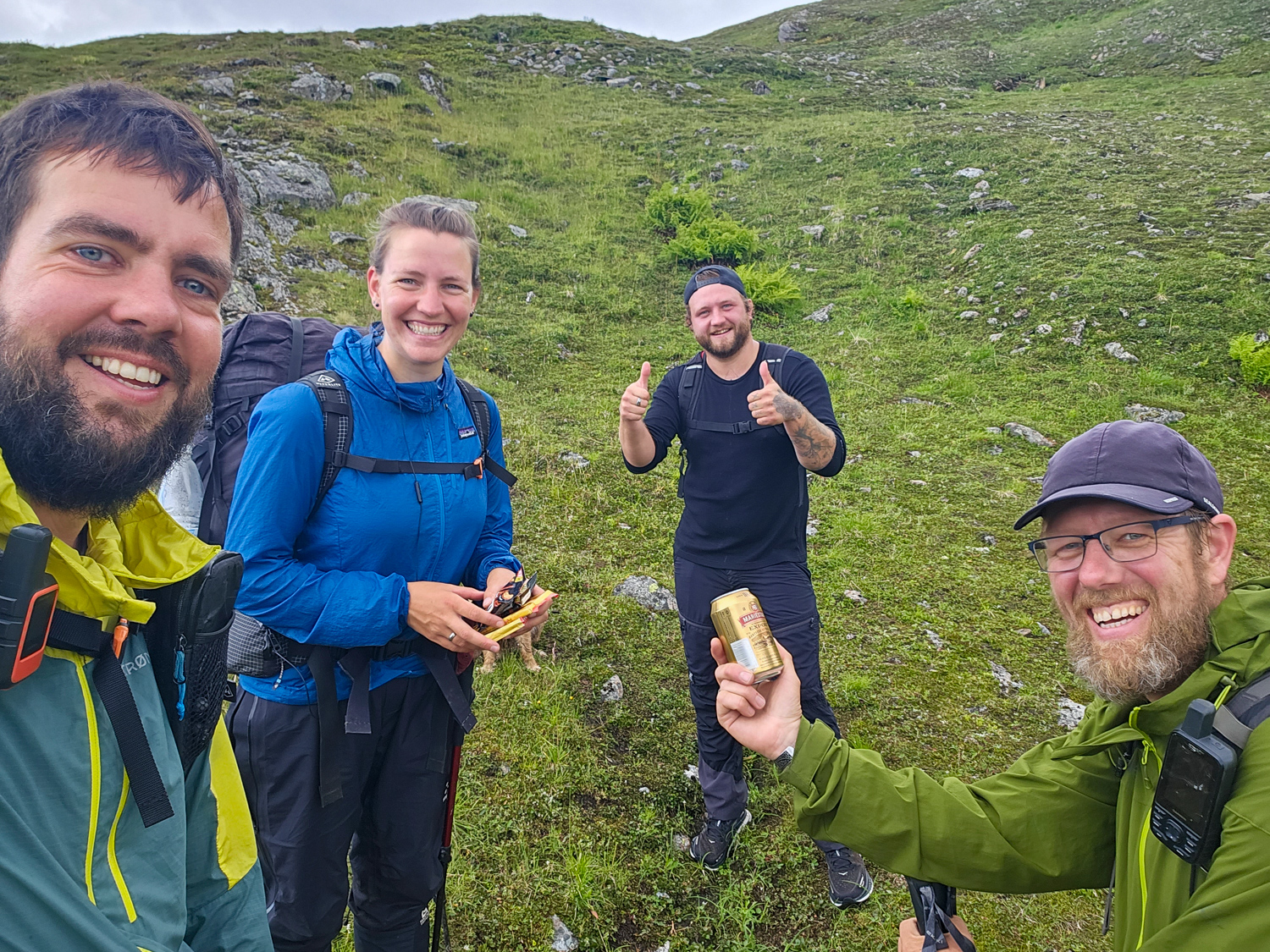 Nach fast 10 Kilometern legen wir eine Pause ein und genießen die Bonussnacks von Holger. Das Bier überlasse ich Stefan und Daniel. Ich fokussiere mich lieber auf’s Essen. 😂