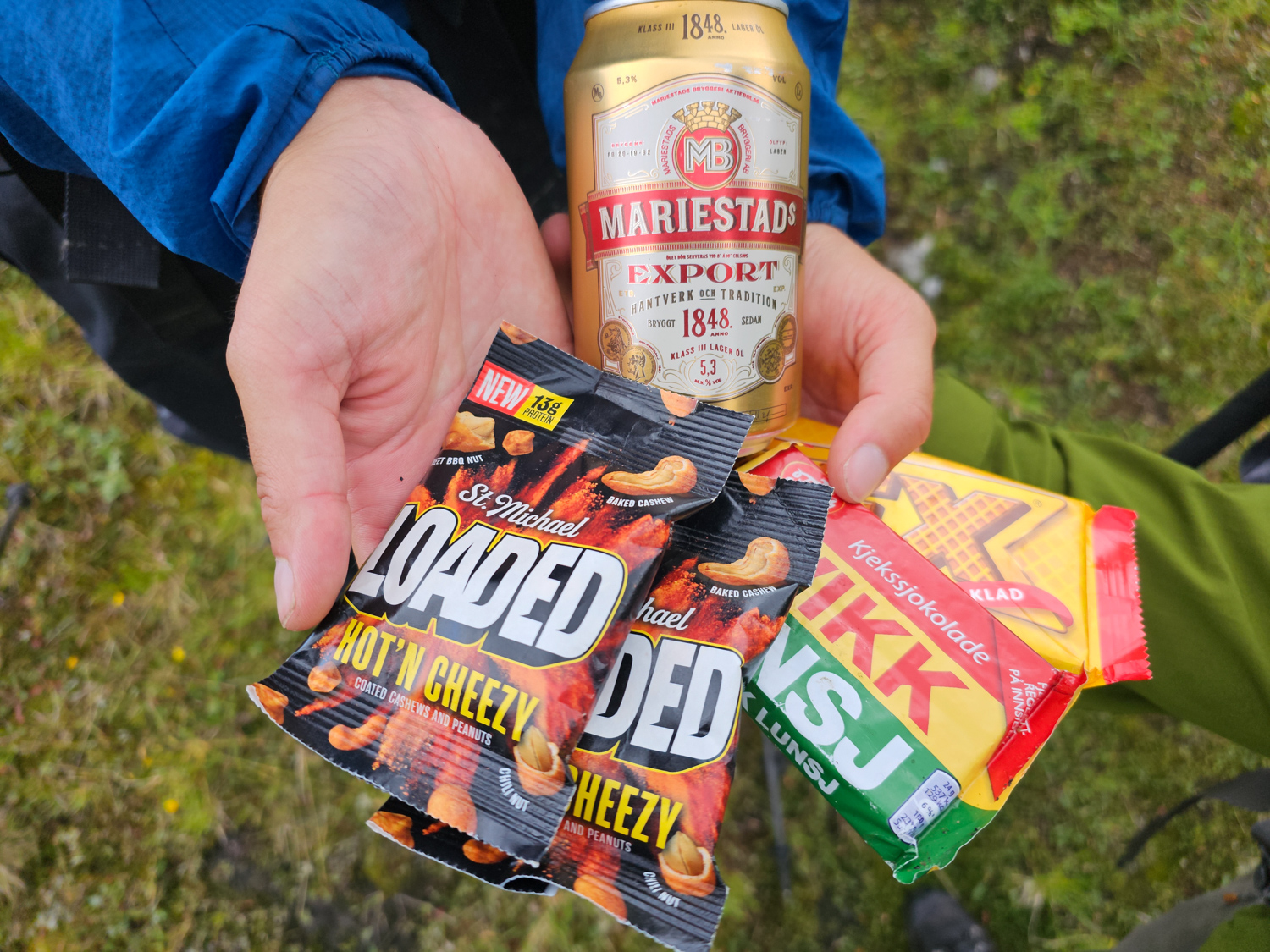 Wir stocken unser Abendessen heute mit Brot und Spiegeleiern auf und genießen eine große Flasche kalte Pepsi. Natürlich bezahlen wir die Lebensmittel, aber eine große Tafel Schokolade und drei Kvikklunsj gibt es gratis, da das MHD frisch abgelaufen ist. Die hätten wir wohl auch bezahlt. Wen interessiert schon so ein Datum…