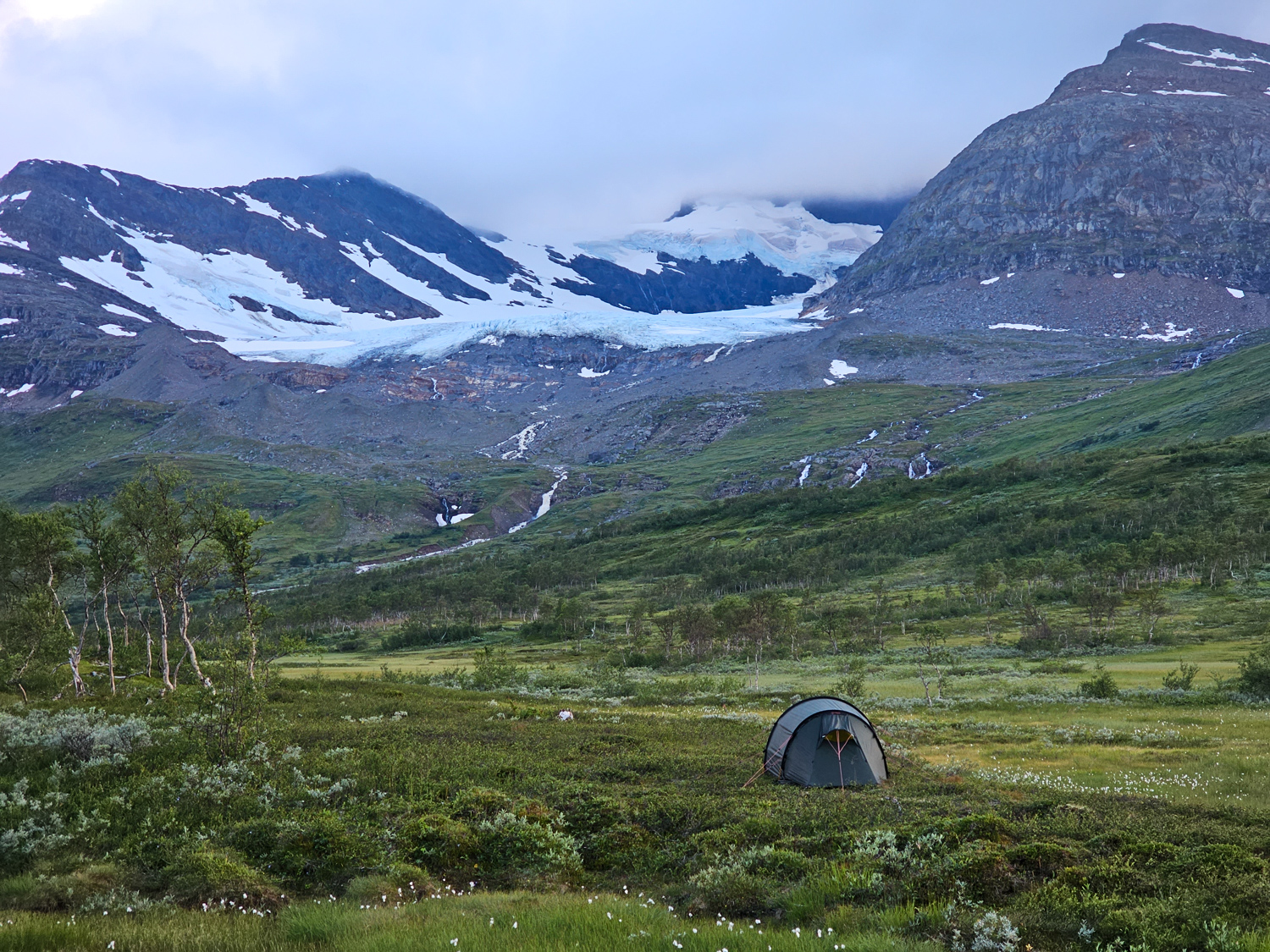 Es ist wirklich beeindruckend, die Größe zu sehen und das mächtige Rauschen der so klein aussehenden Wasserfälle zu hören. Wir überlegen, ob wir heute noch bis zur Gressvasshytta gehen, aber da diese wegen Renovierungsarbeiten noch geschlossen ist, könnten wir dort auch nur zelten. Stattdessen stoppen wir etwas früher. Wir entdecken einen tollen Zeltplatz mit allerschönstem Gletscherpanorama. Um 21 Uhr steht das Zelt und wir genießen den wahnsinnigen Ausblick.