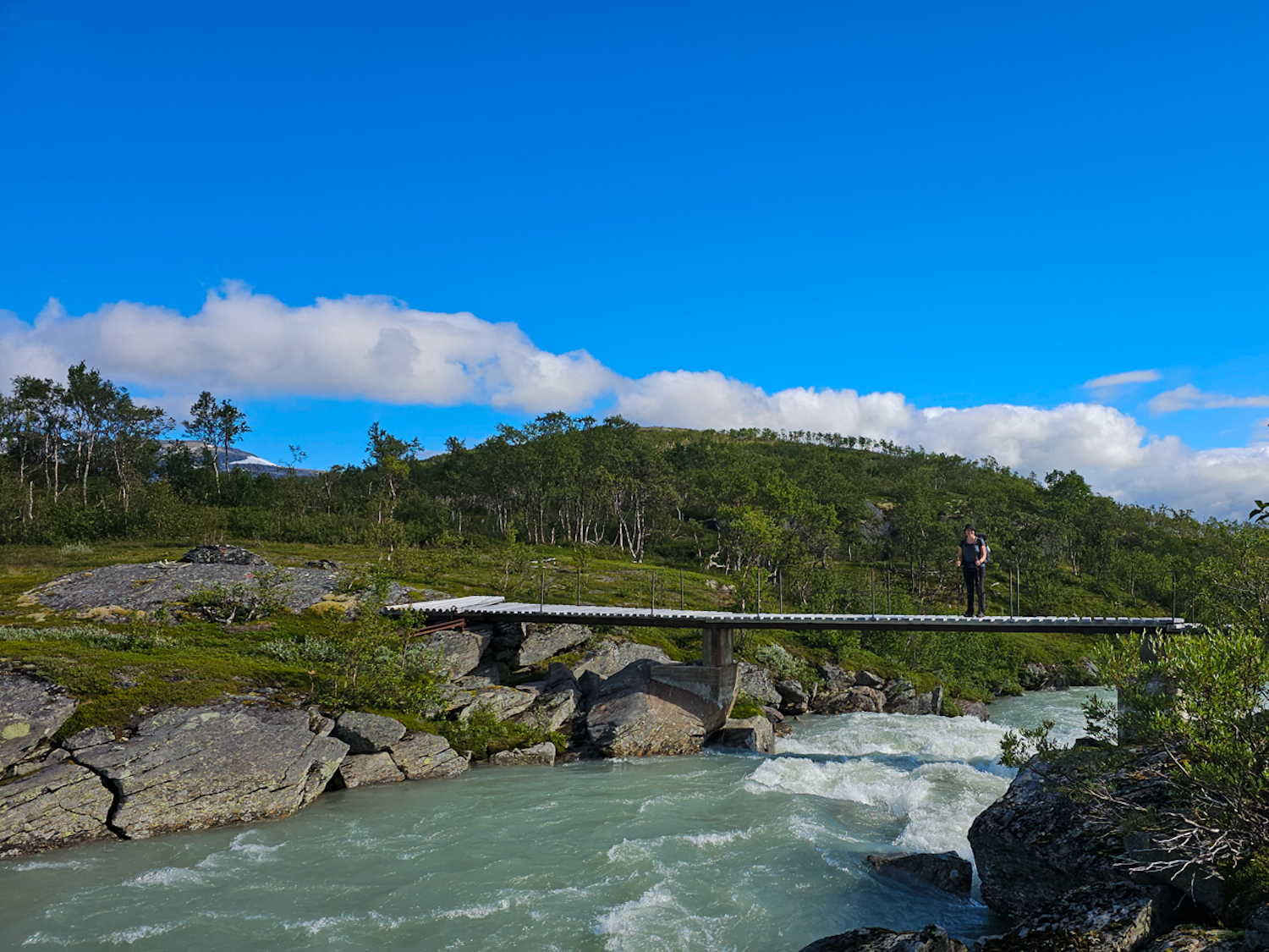 Als wir gerade das Zelt zusammenpacken, sehen wir Daniel unterhalb auf dem Wanderweg. Und da wir von hier oben einen guten Überblick haben, sehen wir aus Richtung Umbukta zwei Personen kommen. Na wenn das mal nicht Lukas und Kim aus Schweden sind. Die zwei sind Mitte Juni am Nordkapp gestartet. Wir treffen sie dann wohl gleich auch.