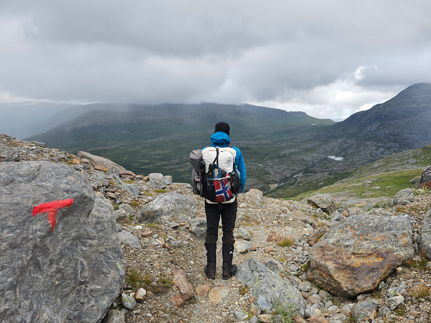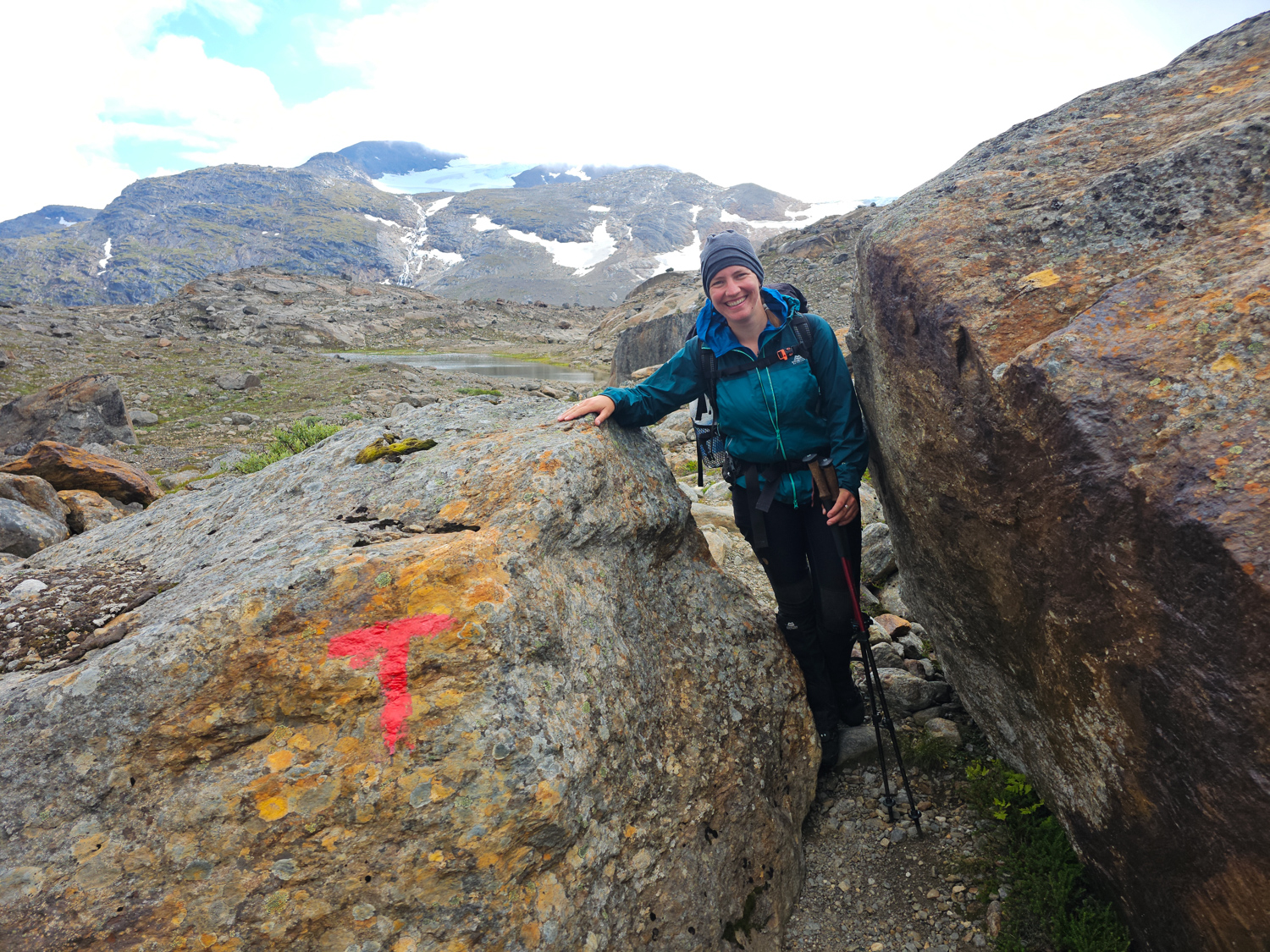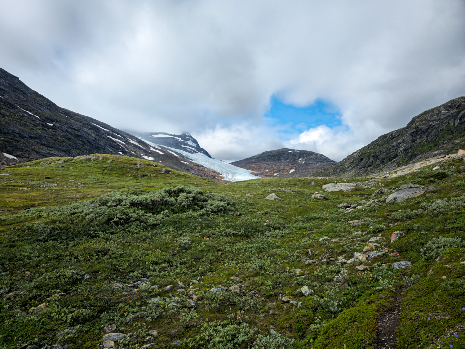 Bei schlechtem Wetter hätten wir vielleicht den alternativen Weg gewählt, der minimal kürzer ist und weniger Höhenmeter beinhaltet. Aber wir freuen uns richtig, dass wir den „anstrengenderen“ Weg gehen können. Im Endeffekt ist der Weg dorthin aber sehr einfach und der Blick auf den Okstindbreen lohnt sich schon, sobald man das Gletschertal (so nenne ich es einfach) betritt.
