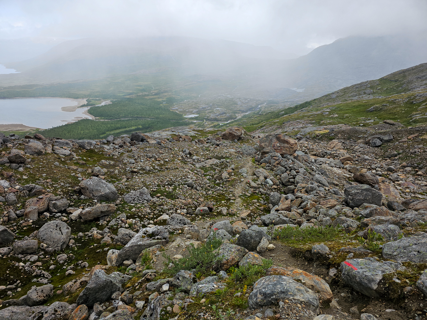 Von hier an sind es nur noch 22 km bis Umbukta. Die laufen wir heute aber nicht mehr komplett. Wir befinden uns übrigens immer noch auf der Nordlandruta, die insgesamt 650 km lang ist. Wir werden ihr zu großen Teilen folgen. Zunächst ist der Weg ziemlich matschig, so dass meine Füße langsam doch nass werden. Es hat zumindest recht lang geklappt heute. Das ist doch auch was.