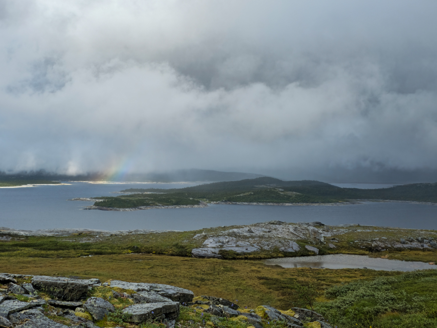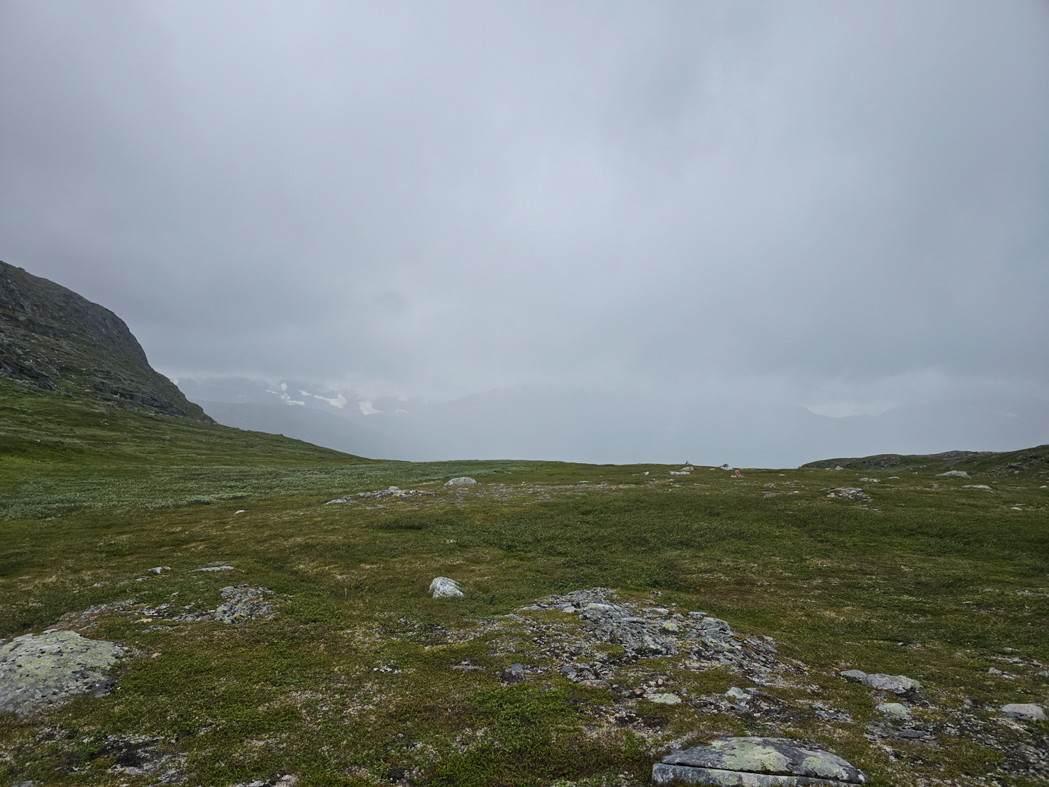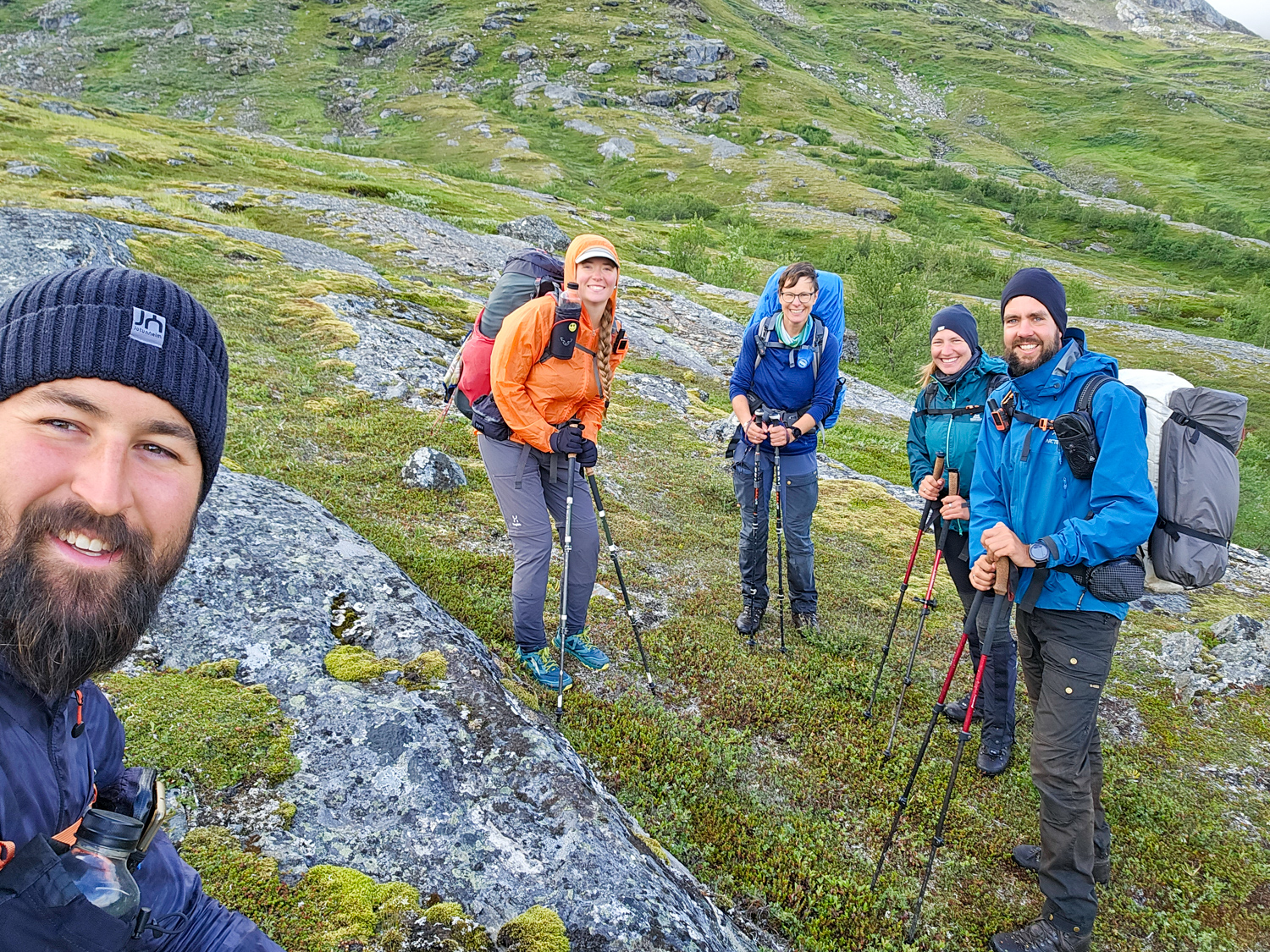 Als dann noch jemand hinter uns den Hügel hinaufkommt, rufe ich direkt „Hallo Nadja!“. Nadja kommt auch aus Deutschland und führt aktuell die Rangliste der diesjährigen NPL-Pleiten, Pech und Pannen-Liste an. Sie hat es nämlich geschafft, mitten im weglosen Børgefjell ihr Handy zu verlieren, das sie vor allem für die Navigation gebraucht hat. Ein paar Tage später sind ihr dann während einer Furt die Wasserschuhe davongeschwommen. Nadja ist offensichtlich wahnsinnig froh, auf andere Wanderer und NPLer zu stoßen und redet wie ein Wasserfall drauflos. Sie ist uns direkt sehr sympathisch. 😀