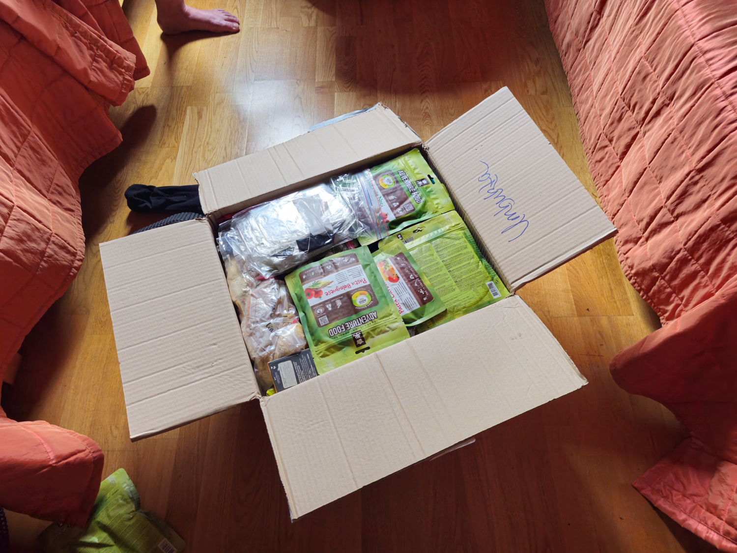 Wieviel kg es inkl. Essen für bis zu 10 Tage sind, wissen wir gar nicht so genau – ist vielleicht auch besser so. 🫣 Vermutlich sind es irgendwas um die 20-22 kg. Wir wissen nur, dass es ganz schön schwer ist. Aber es wird dann ja täglich weniger. 😉