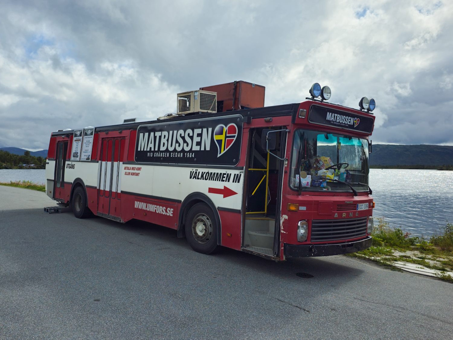 Stefan genießt als erstes die Dusche, ich verschiebe meine auf später. Denn wir haben noch einen wichtigen Punkt auf der Liste: Einkaufen! In Umbukta gibt es dazu genau gar keine Möglichkeit. Da wir aber am Wochenende hier sind, gibt es in gut 3km Entfernung, direkt auf der schwedischen Seite der Grenze, eine Option. Dort steht von Freitag bis Sonntag der Matbussen. Das ist ein kleiner Supermarkt in einem alten Bus. Ohne Gepäck sind die Kilometer schnell gelaufen.