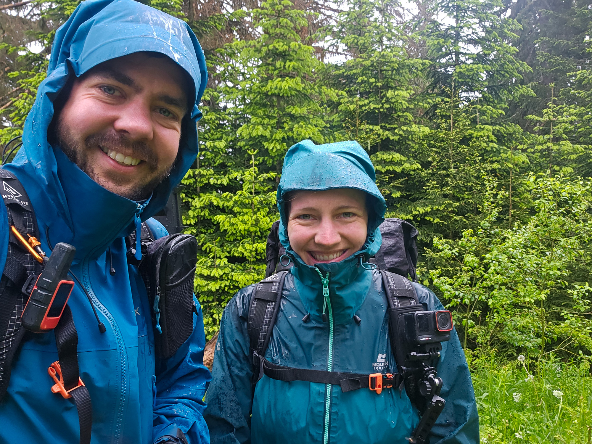 Als wir aufwachen, regnet es. Wir haben es also nicht eilig. Die Wettervorhersage kündigt uns einen schönen Tag an und nur eine 50%ige Regenwahrscheinlichkeit für den Morgen. Also vertrödeln wir ein bisschen Zeit, bis der Regen aufhört. So ist unser Plan. Doch der Regen hat einen anderen. Offenbar sind wir dieses Mal auf der falschen Seite der Wahrscheinlichkeit. Statt weniger regnet es zusehends mehr. Also ziehen wir die Regenkleidung an und trotzen damit Regen und Mücken.