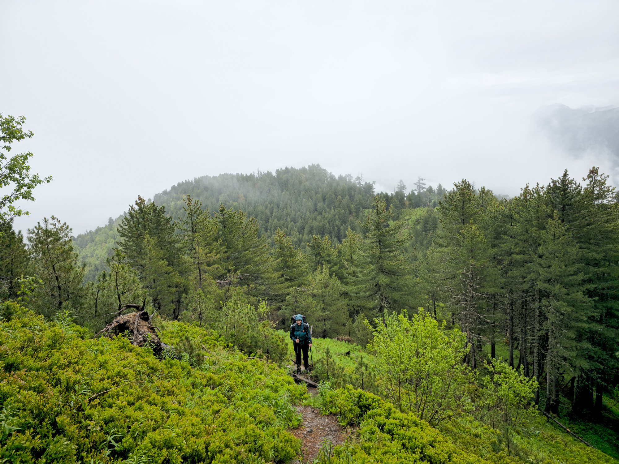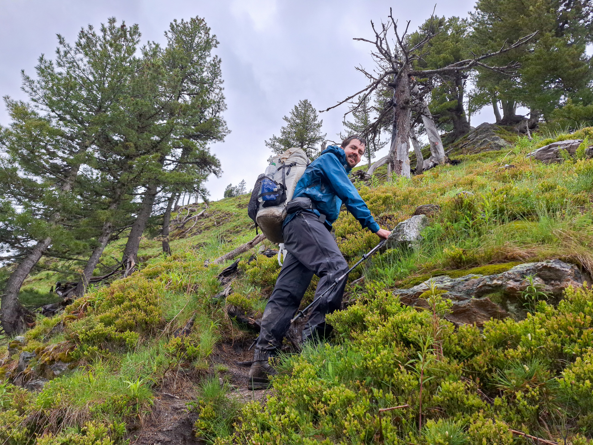 Anschließend kommen wir auf eine kleine Ebene. Alles ist grau, wolkenverhangen und sehr nass. Es regnet Bindfäden. Ansonsten hätte man hier aber auch gut zelten können. Es gibt viele schöne Wiesen und einen Bach. Wir steigen aber weiter auf. Nun steht der Aufstieg auf den Bajrak an und der hat es in sich.