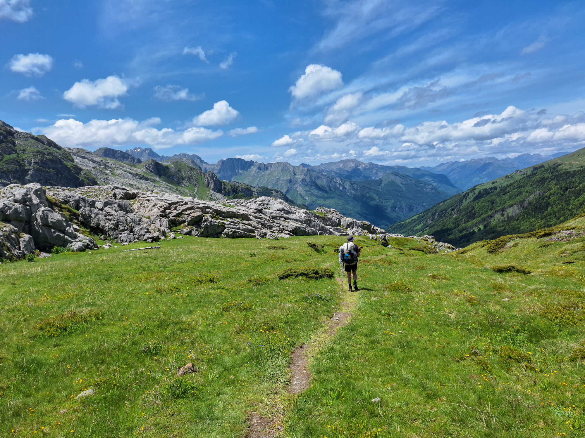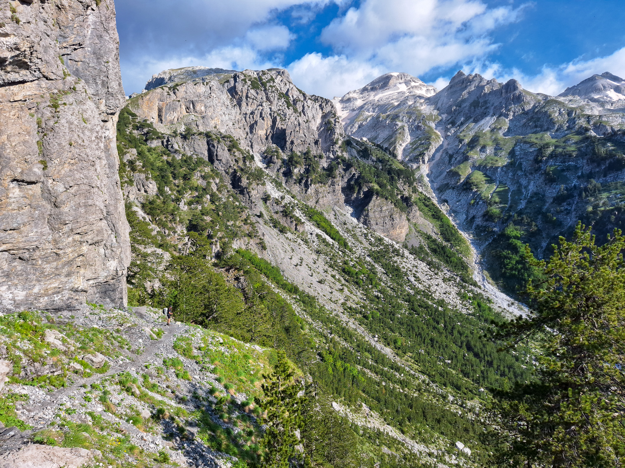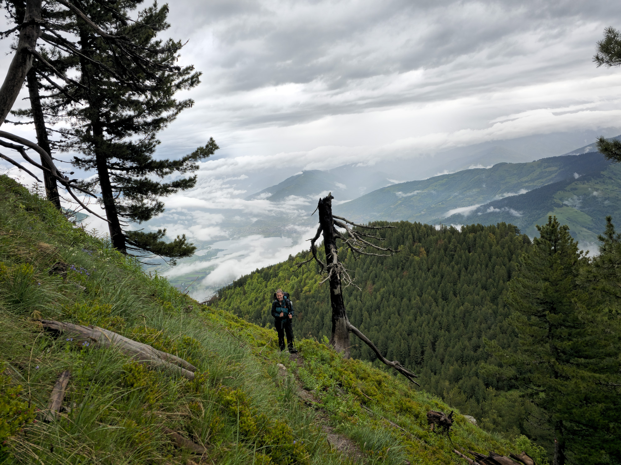 Der Anstieg ist geschafft und nun geht es rund 1200 m hinab. Der Abstieg ist wesentlich entspannter, als wir das aufgrund des Höhenprofils vermutet hätten. Nur hier und da führt der Weg sehr nah am steil abfallenden Hang entlang.