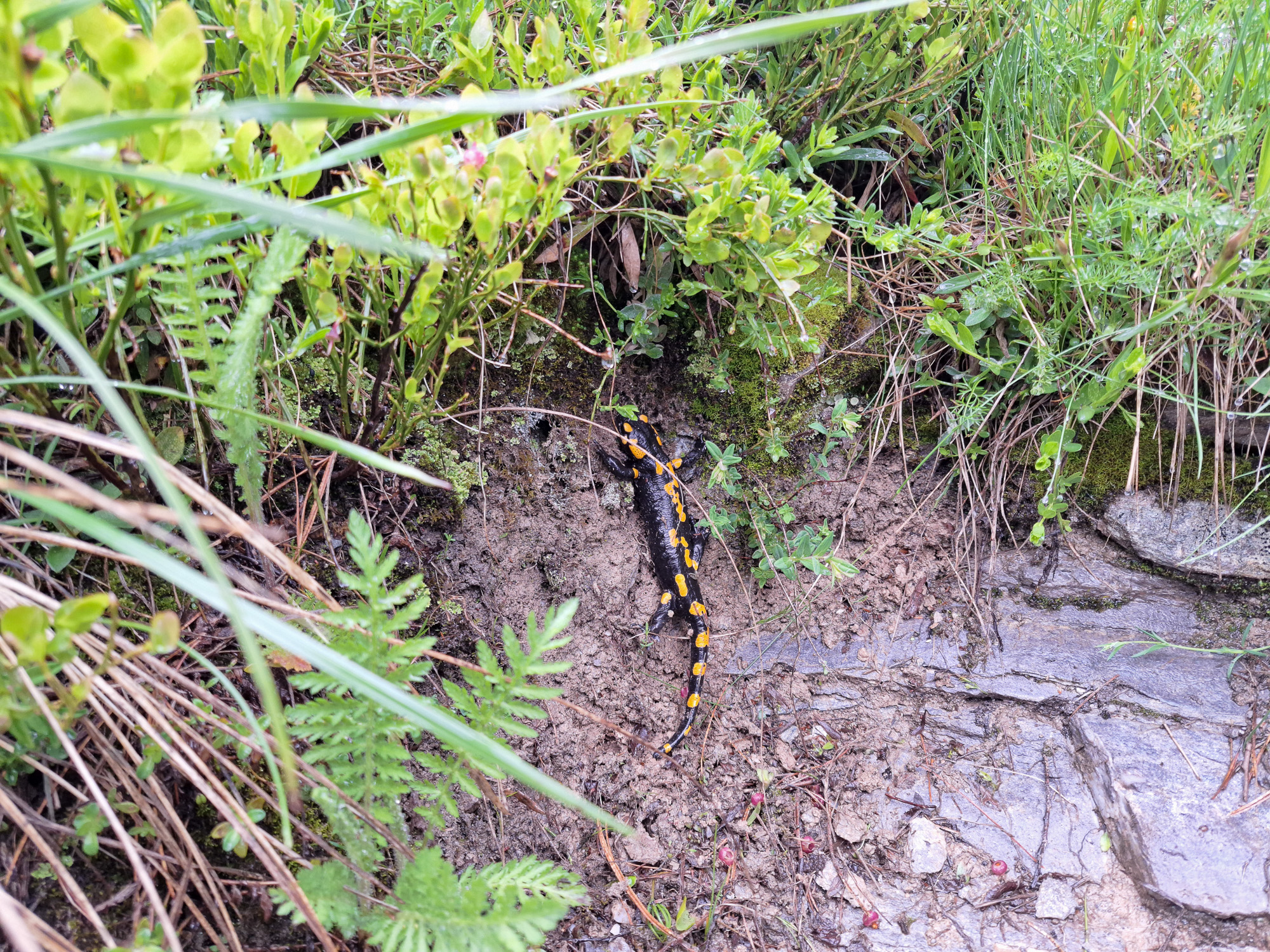 Kurz vorher entdecken wir noch einen Feuersalamander. Den haben wir noch nicht real gesehen.