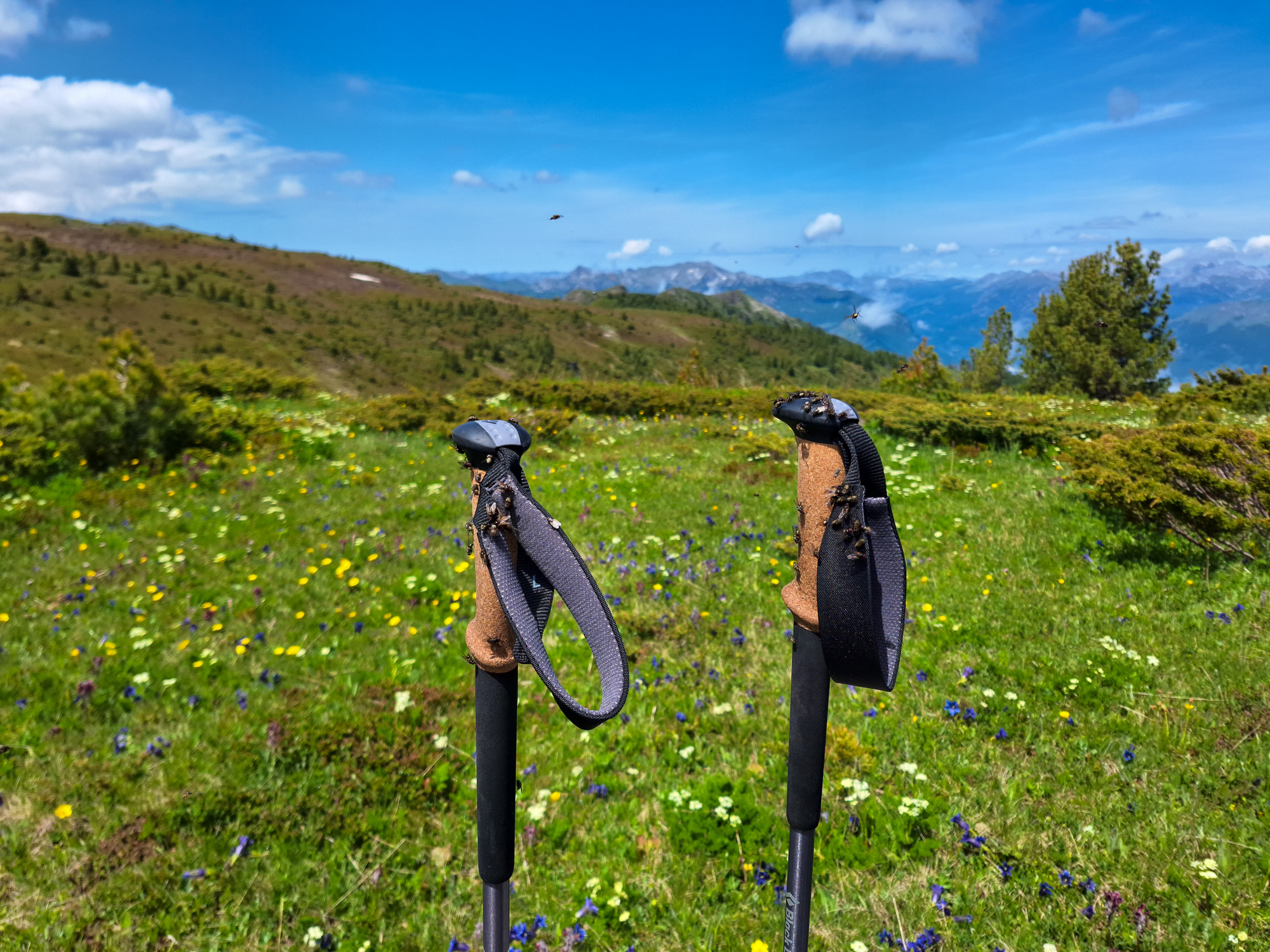 Wir können uns gar nicht satt sehen an diesem Bergpanorama, das sich dort vor uns ausstreckt. Denn inzwischen haben die Regenwolken der Sonne Platz gemacht und wir haben hervorragende Sichtverhältnisse. Diese werden nur gelegentlich von etlichen Fliegen gestört, die sich in dicken Schwärmen auf uns und unsere Ausrüstung (insbesondere auf die Trekkingstöcke, weshalb auch immer) stürzen, sobald wir stehen bleiben.