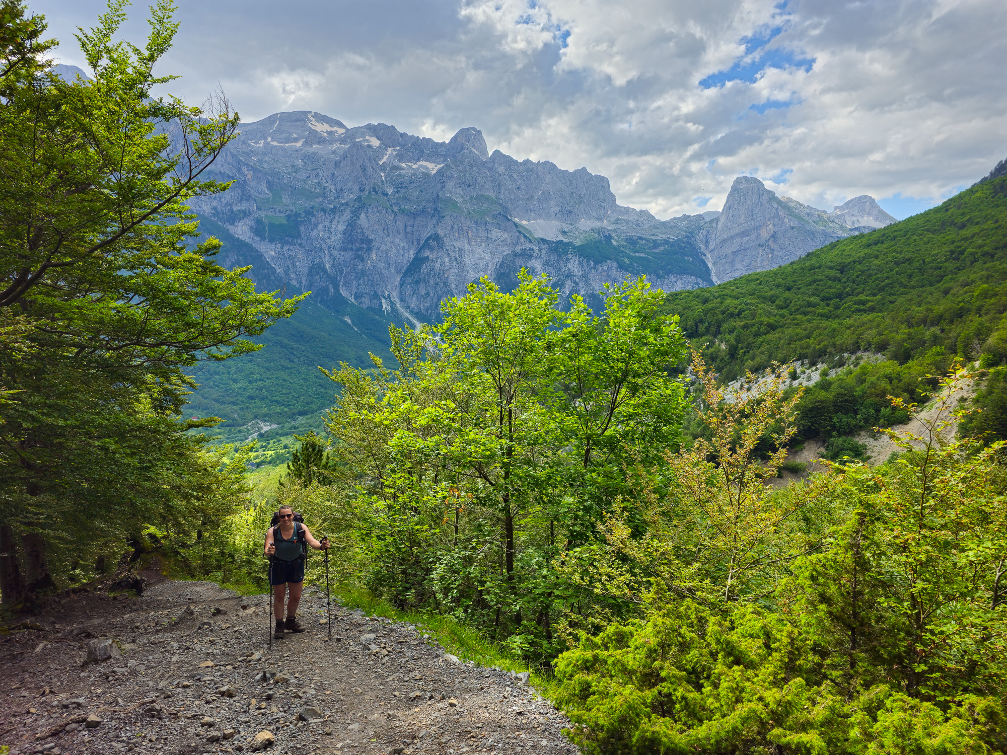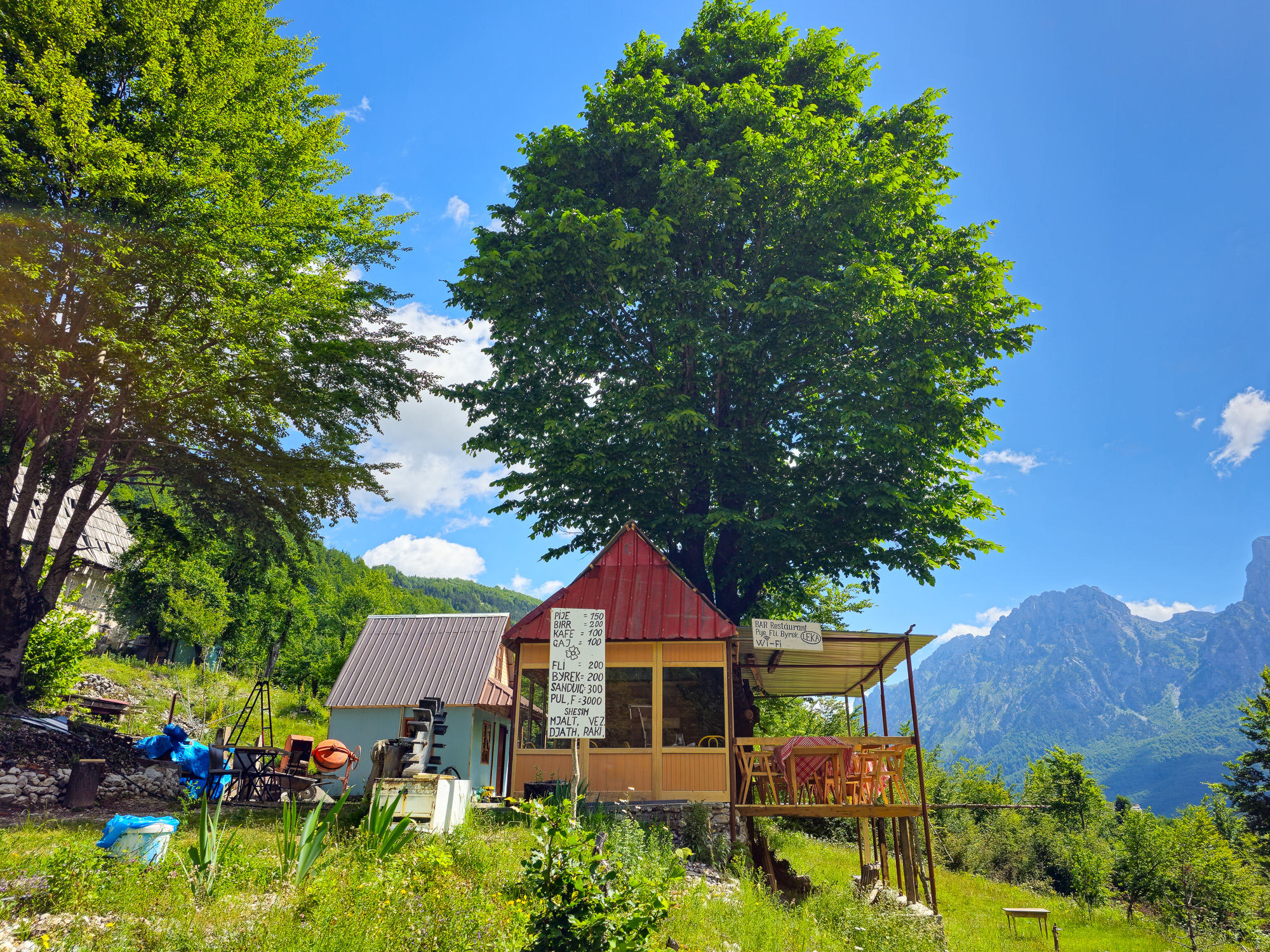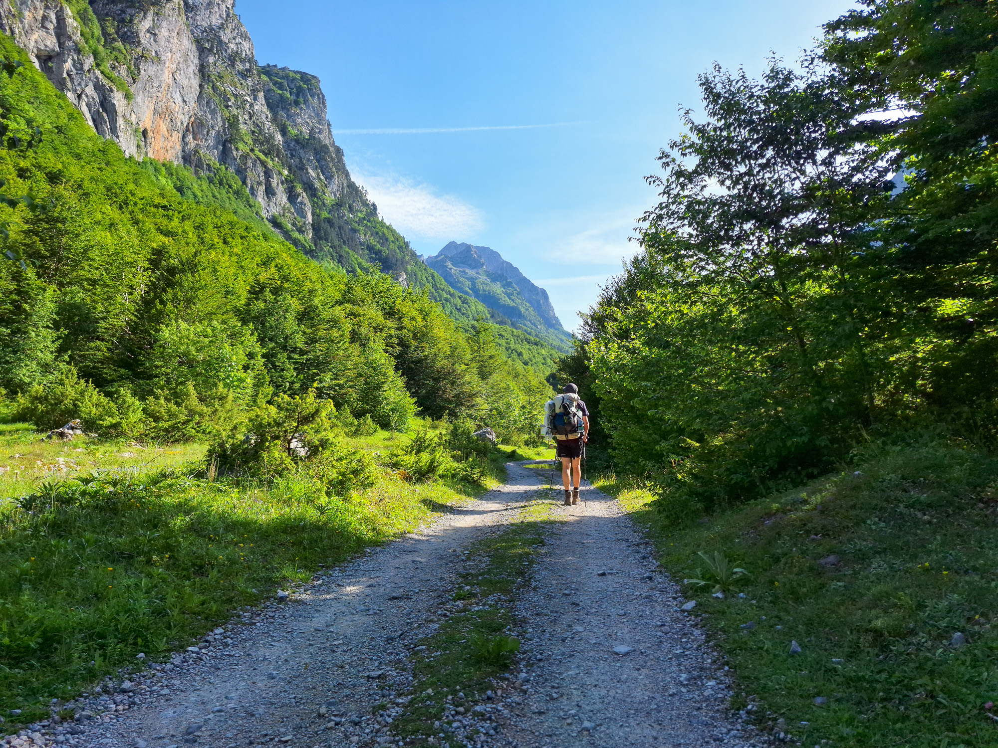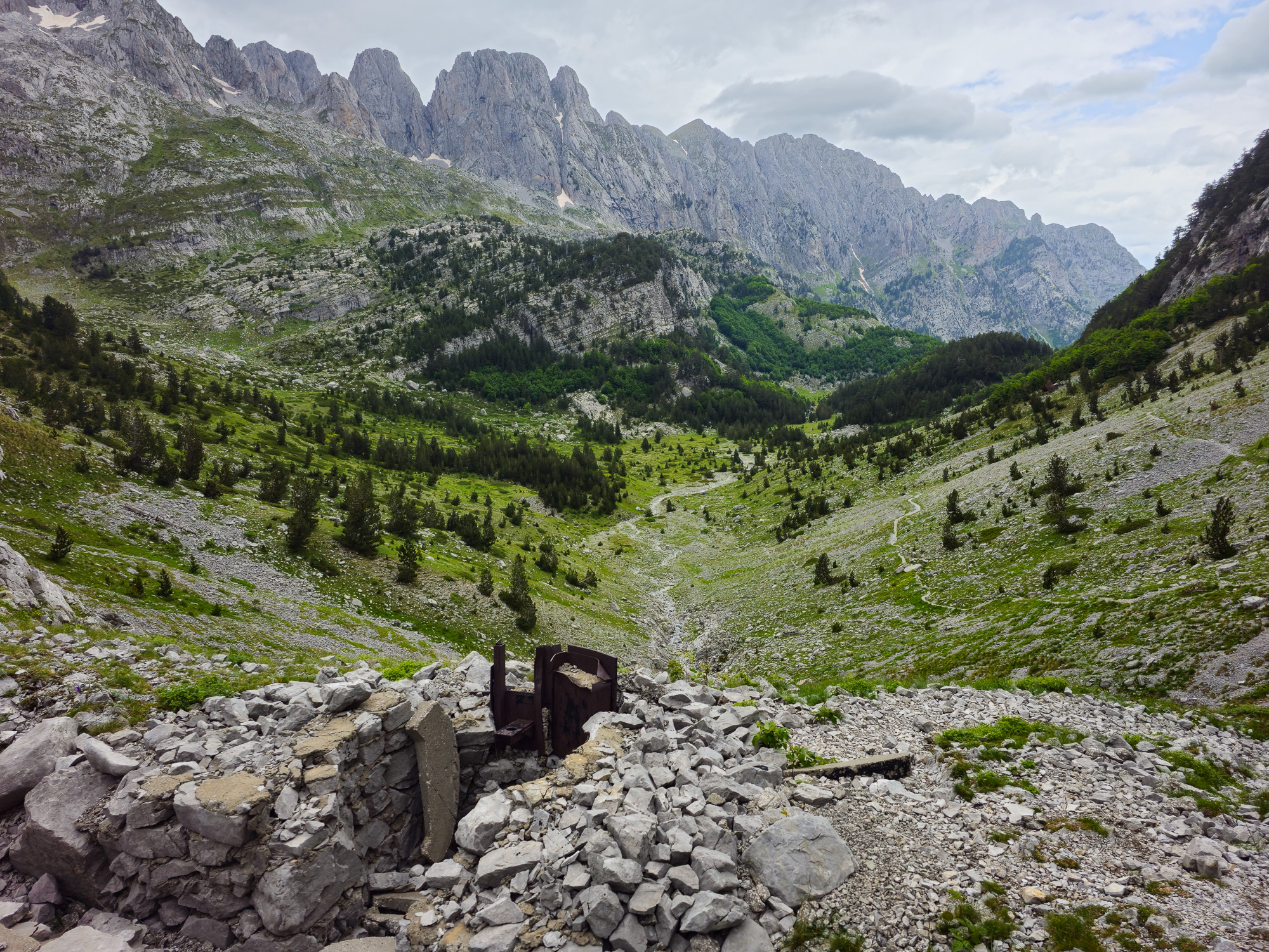 Der Weg zieht sich und wir können die Taxioption mal wieder nachvollziehen. Unser Antrieb besteht aus der Aussicht auf ein Restaurant, das leider gar nicht existiert. Also gehen wir weiter und kommen zu unserer Abzweigung, die Richtung Valbona führt. Für ein Essen nach Theth zu gehen und deshalb noch weiter abzusteigen, um anschließend einen noch größeren Anstieg zu haben, lohnt sich für uns nicht. Unsere Vorräte sind noch ausreichend und dürfen auch mal weniger werden.