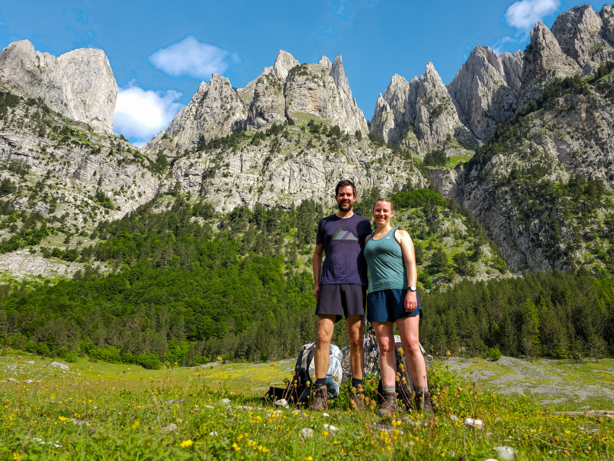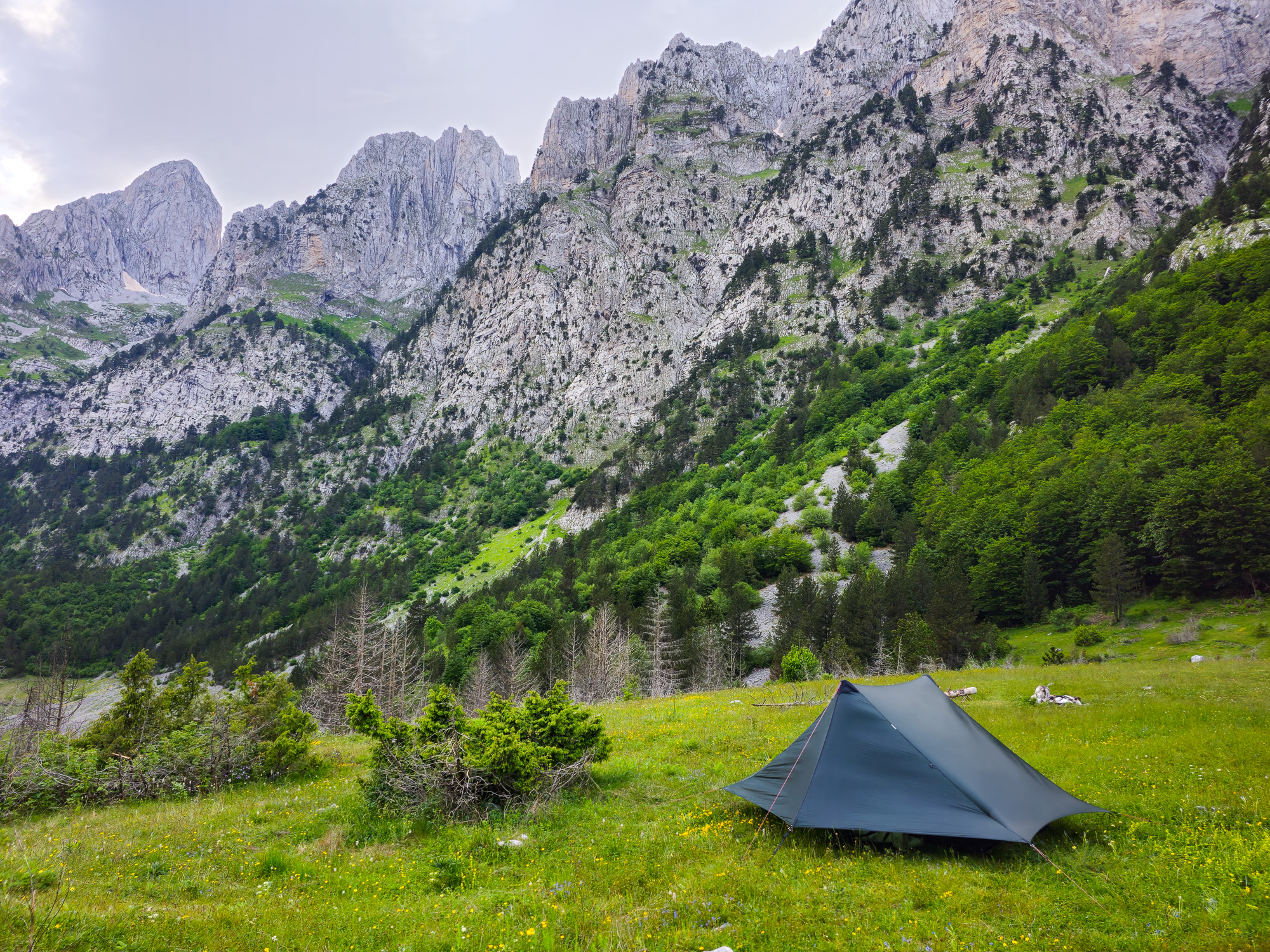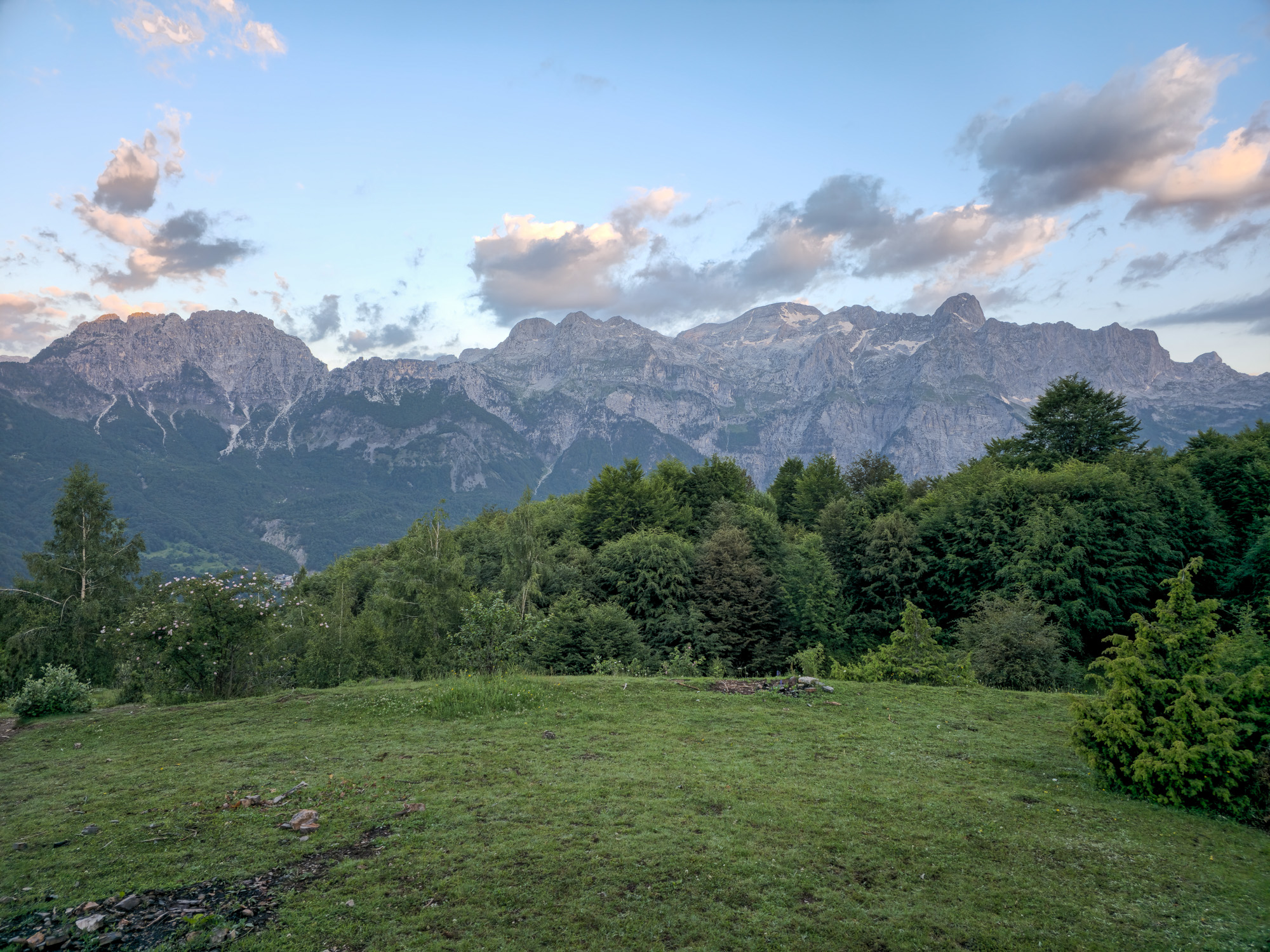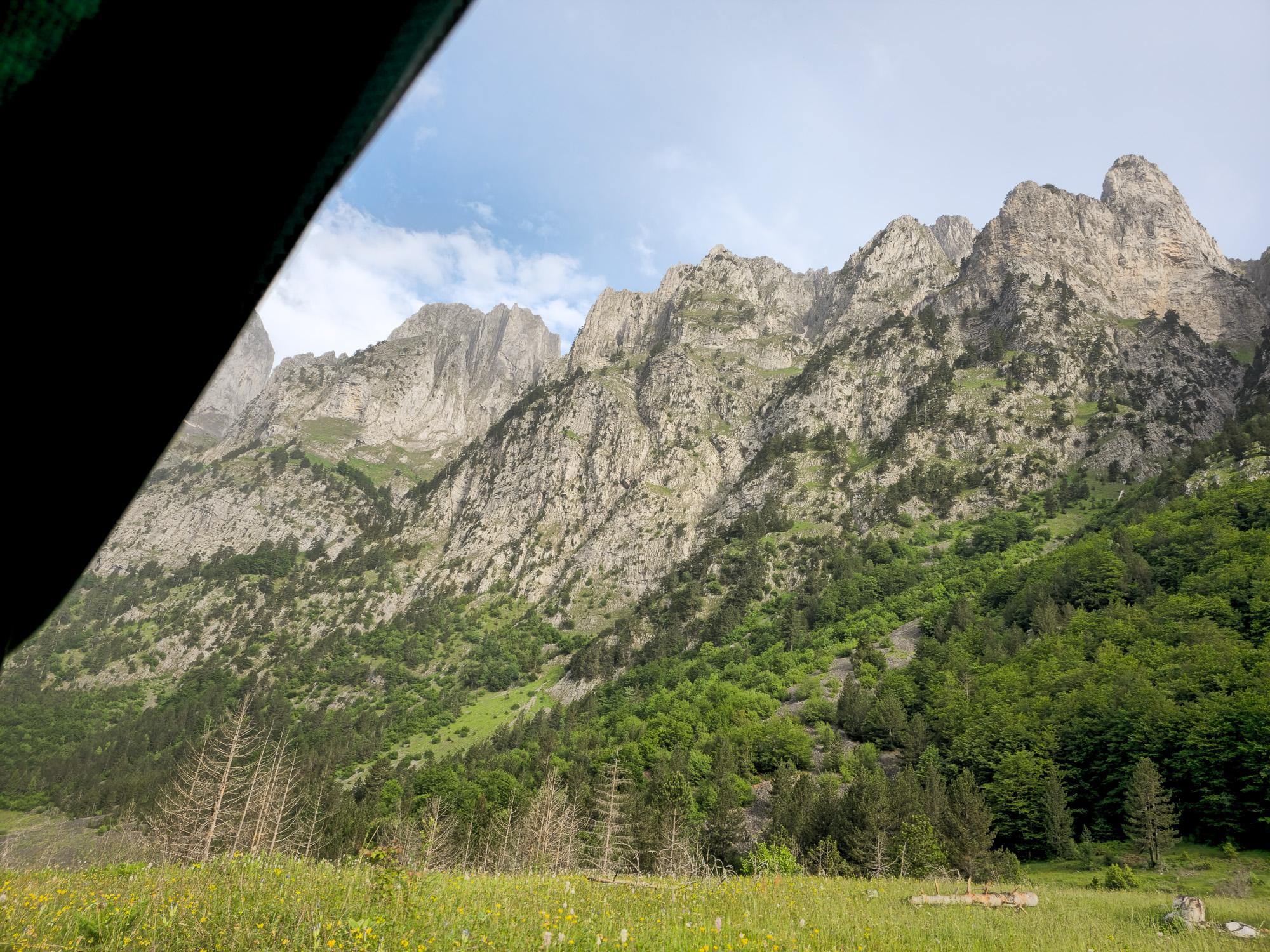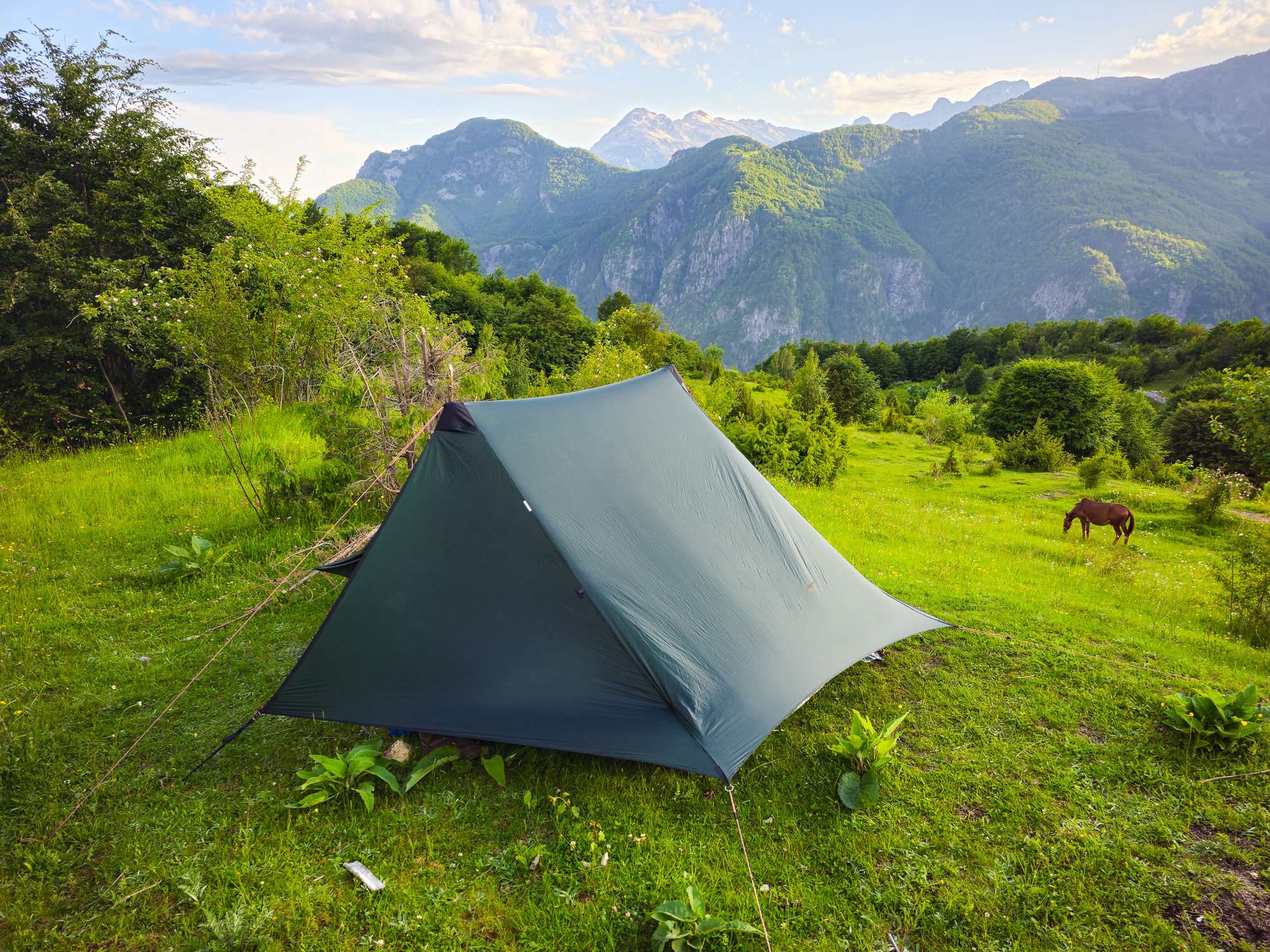 Der Aufstieg beinhaltet 500 Höhenmeter und ist wenig interessant. Die Nachmittagssonne gart uns nochmal komplett durch und wir sind glücklich, als wir etwas abseits vom Weg einen perfekten Platz für uns und unser Zelt finden. Wir haben eine tolle Sicht auf das Gebirge hinter Theth, völlig ebenen und angenehmen Rasen unter uns und staunen über diesen Tag. Bis zum Ende des Abstiegs hat uns die Etappe heute voll und ganz beeindruckt. Wahnsinnig schön war das!