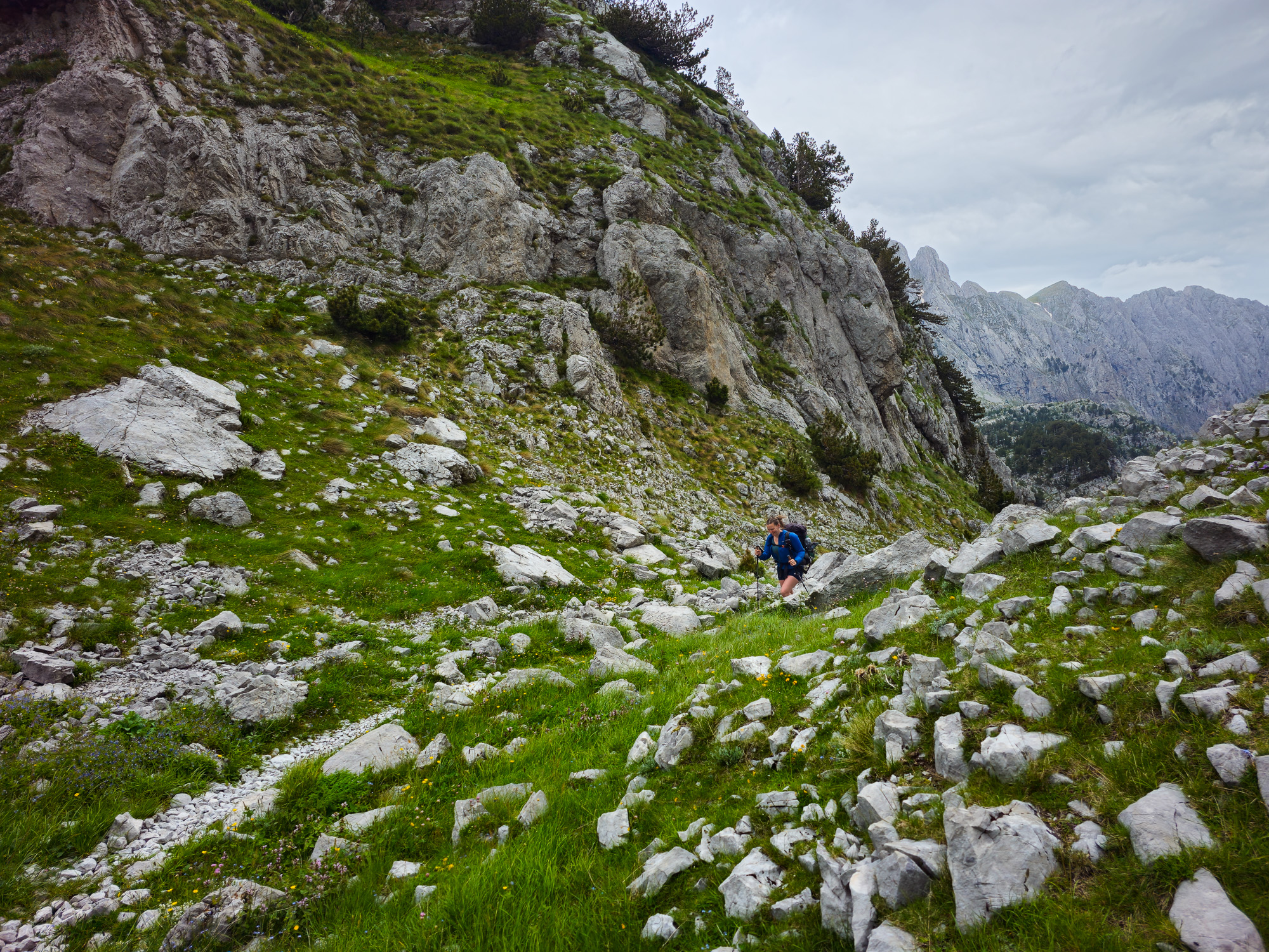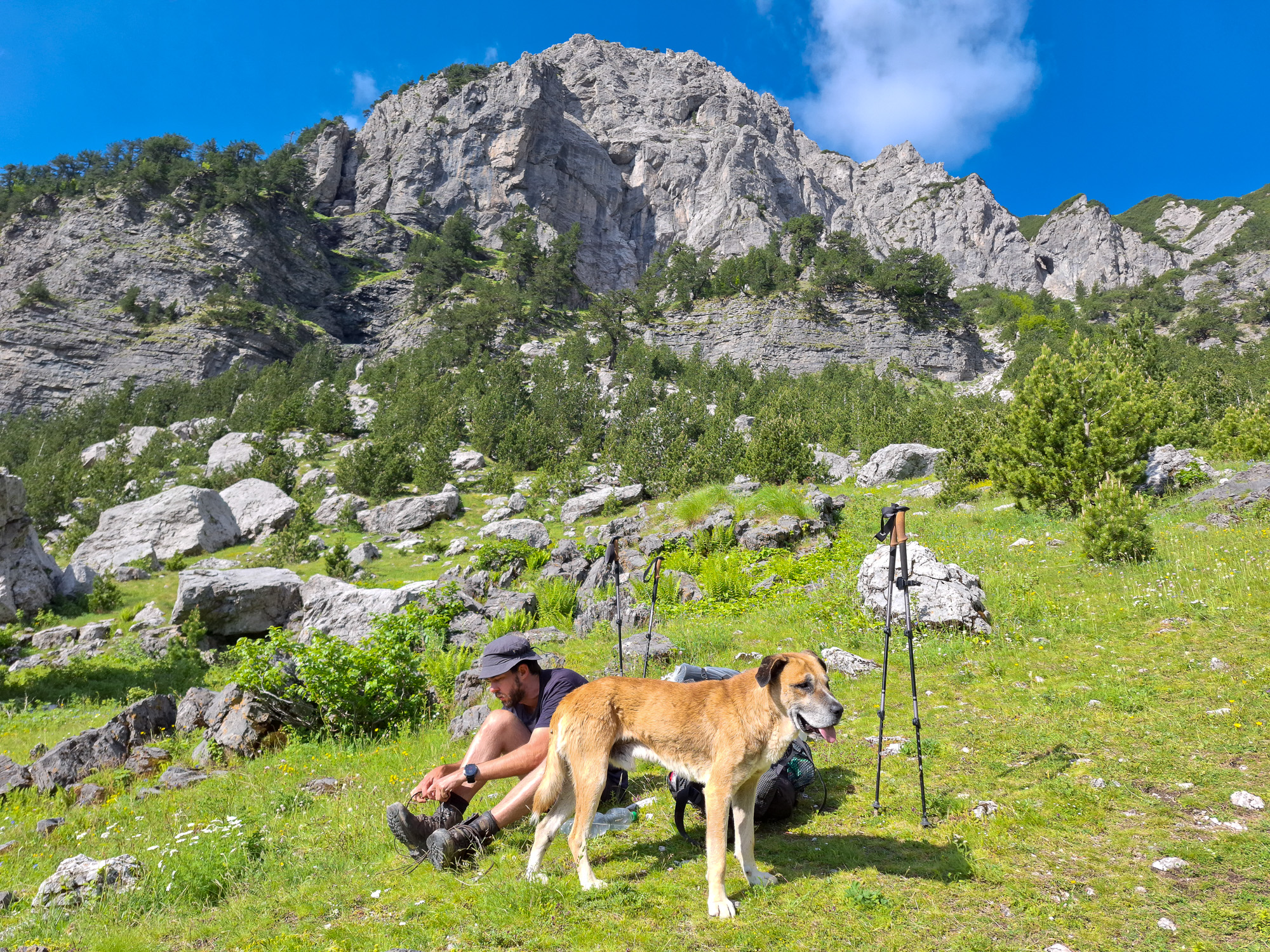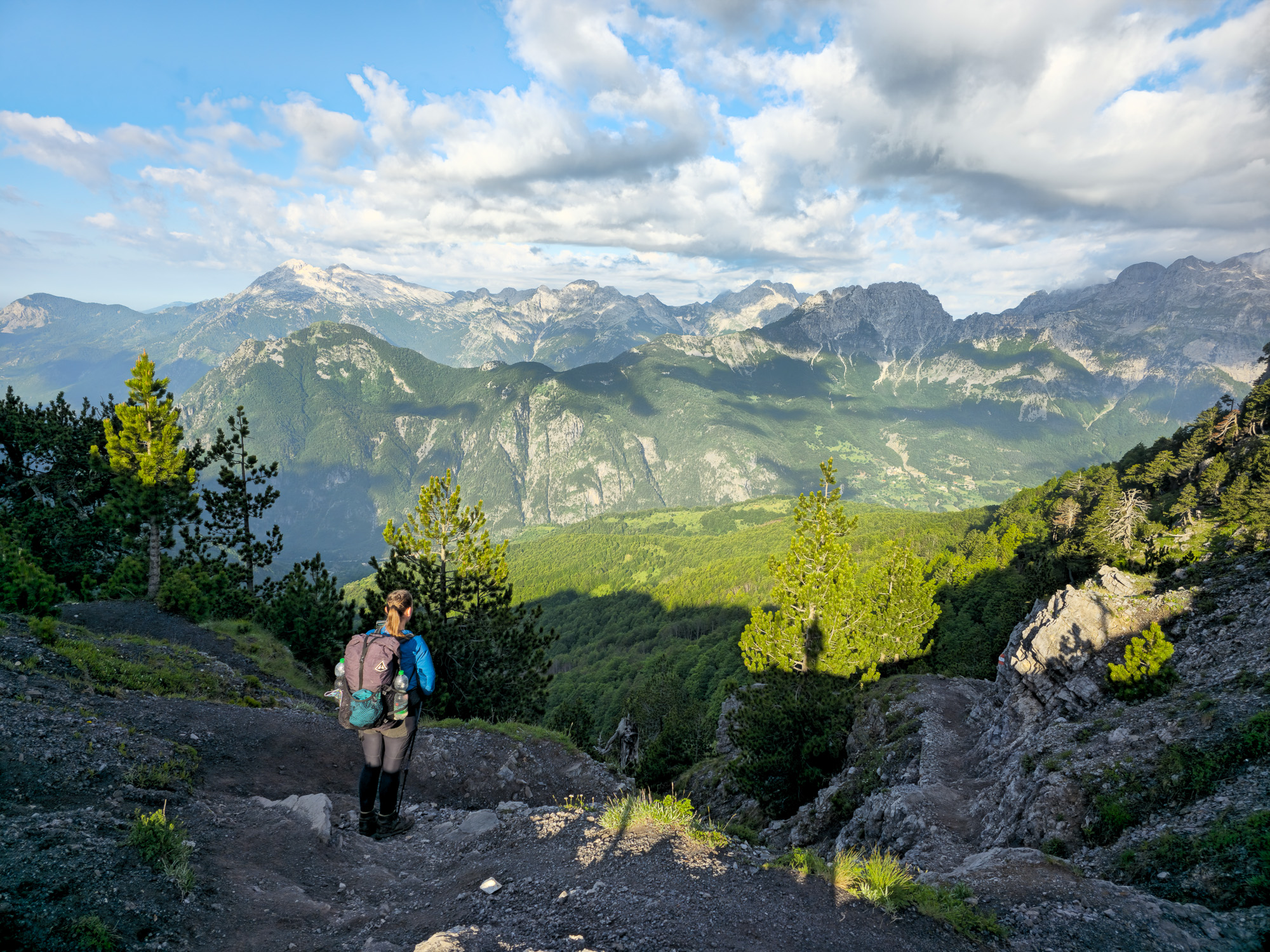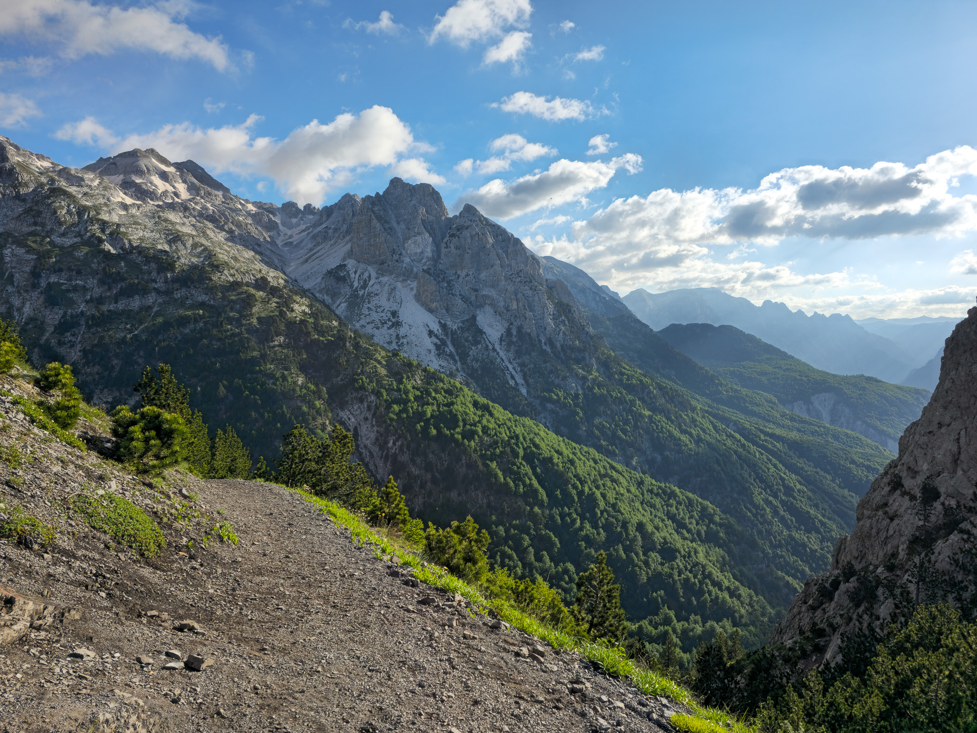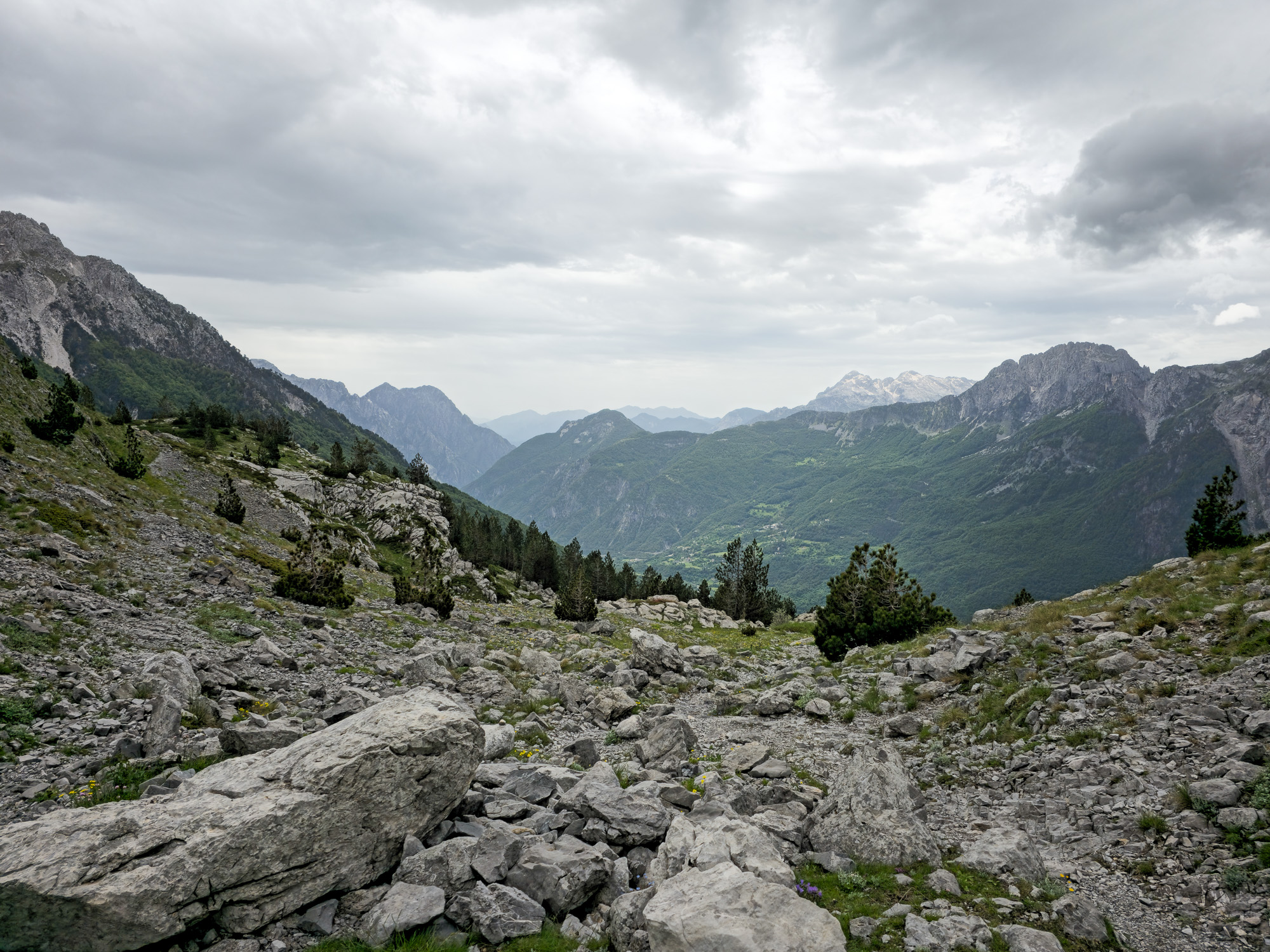 Wir folgen dem Weg für die nächsten Stunden langsam bergab Richtung Vusanje und bleiben immer wieder staunend stehen. Jede Kurve verändert den Blickwinkel und es bleibt atemberaubend. Wir sehen jetzt den Prosllopit-Pass, über den wir in ein paar Tage in eben dieses Tal gehen werden.