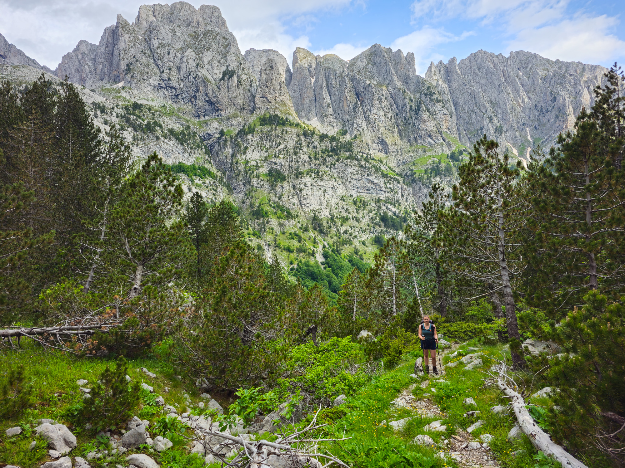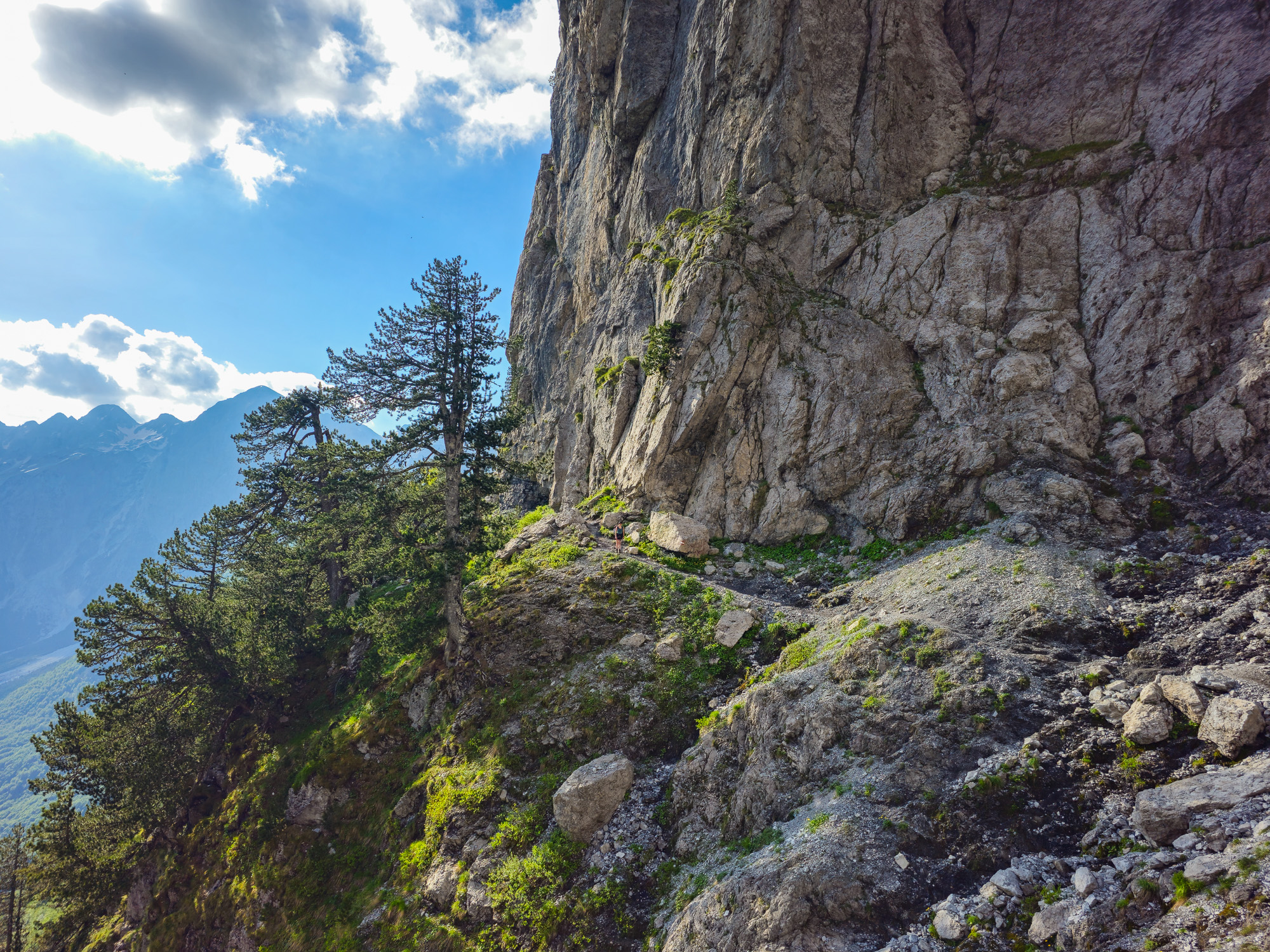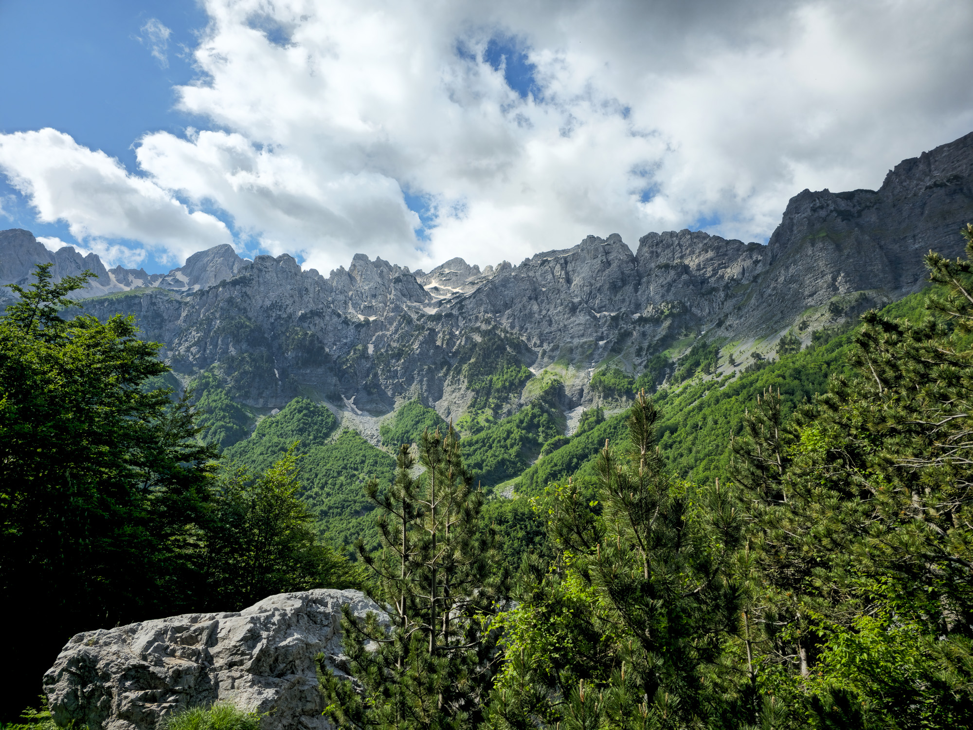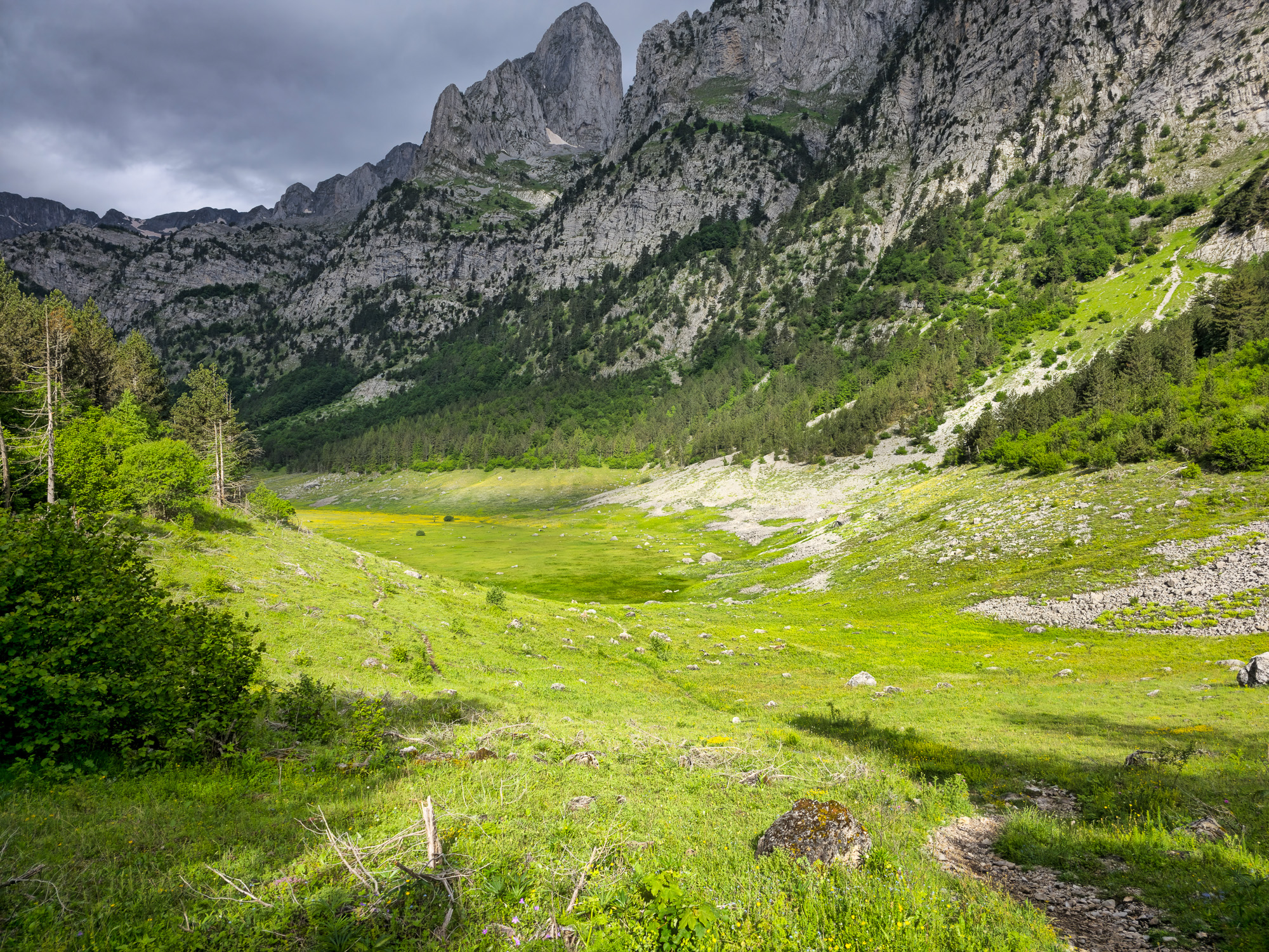 Wir folgen dem Weg für die nächsten Stunden langsam bergab Richtung Vusanje und bleiben immer wieder staunend stehen. Jede Kurve verändert den Blickwinkel und es bleibt atemberaubend. Wir sehen jetzt den Prosllopit-Pass, über den wir in ein paar Tage in eben dieses Tal gehen werden.